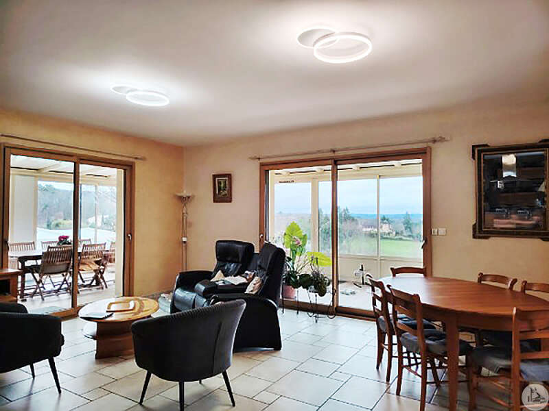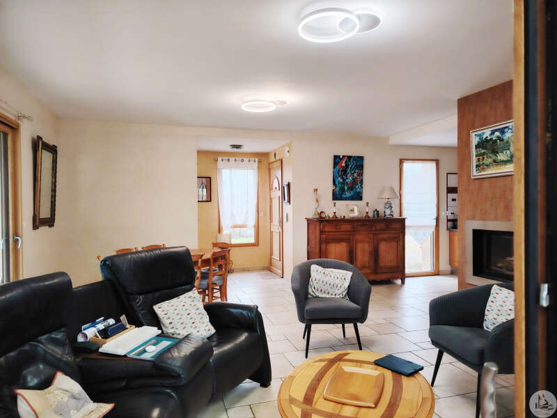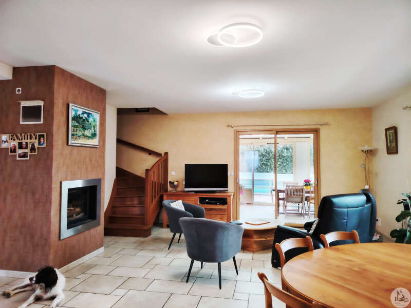 Ground floor: Entrance: 3 m² with cupboard/wardrobe, living room of 54 m² living room/dining room/equipped kitchen, closed fireplace, veranda of approximately 40 m² with air conditioning, master bedroom 1 of 17 m² with dressing room of 4 m² and bathroom bathroom of 8.91 m² with shower and bathtub, bedroom 2 (or office) of 8.90 (access to bathroom bedroom 1), laundry room of 8.97 m², WC. Upstairs (under slope): Landing 8.37 m², Bedroom 3 of 13.22 m² with cupboard/dressing room, bedroom 4 of 9.10 m², bedroom 5 (child) of 8.46, bathroom of 8.35 m², WC. - Swimming pool with retractable dome - 1 car garage of 18 m² - Shelter for 2 cars 36 m² - Wooden shelters * Underfloor heating by geothermal energy * Closed fireplace * Air conditioner * Double glazing (exterior aluminum/interior wood) * Automated roller shutters * Thermodynamic hot water tank * Solar panels * 7 m3 rainwater recovery tank (toilet and washing machine supply) * Mains drainage