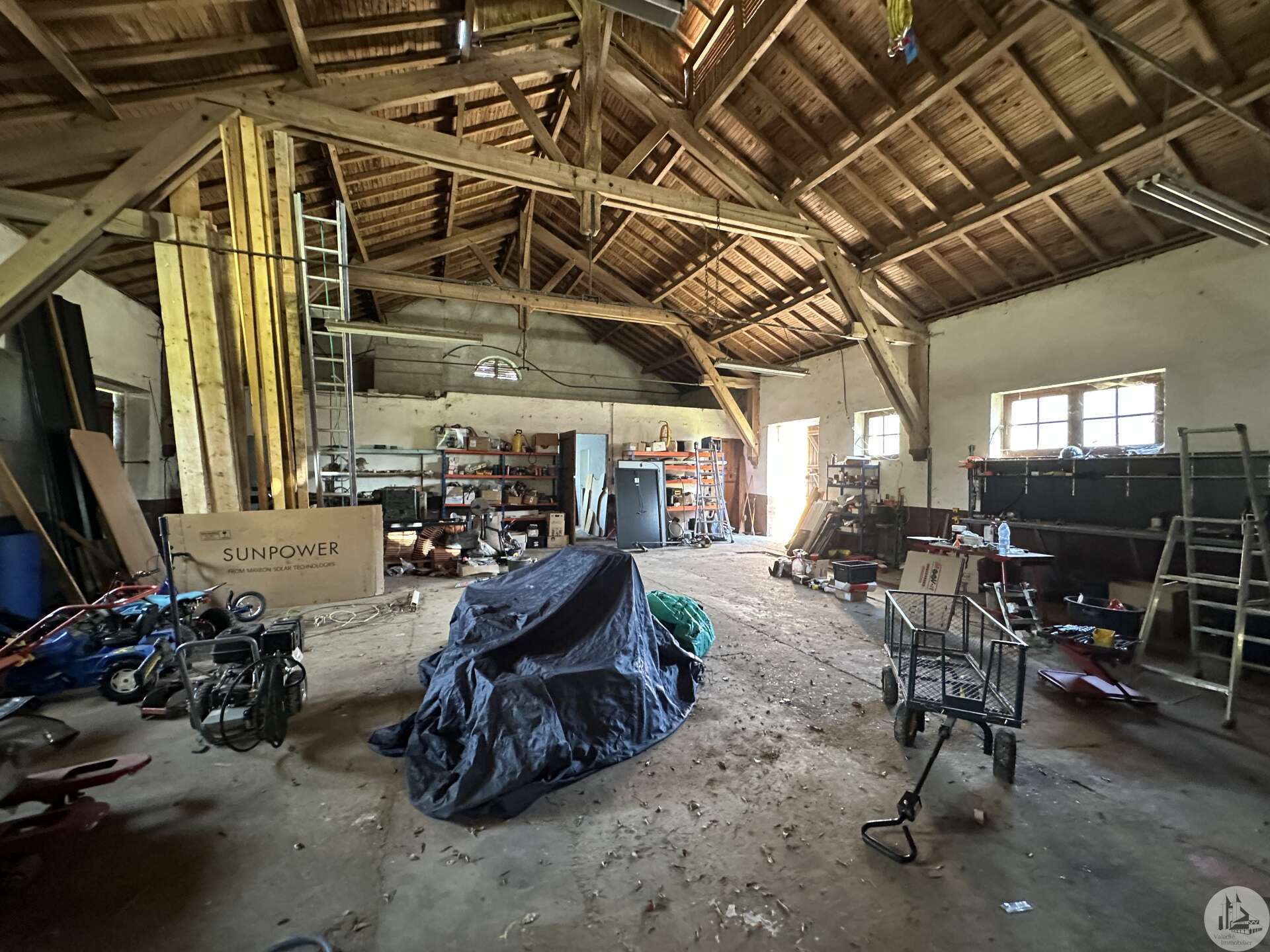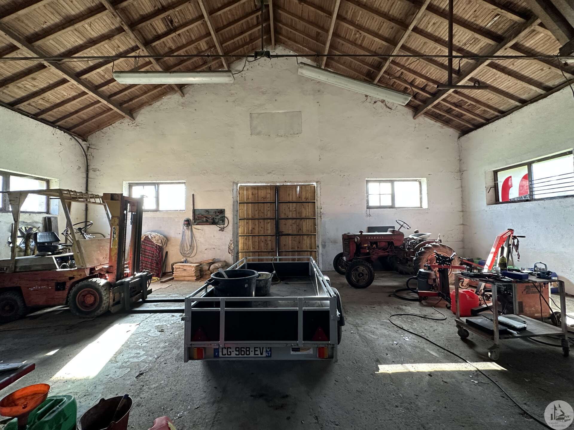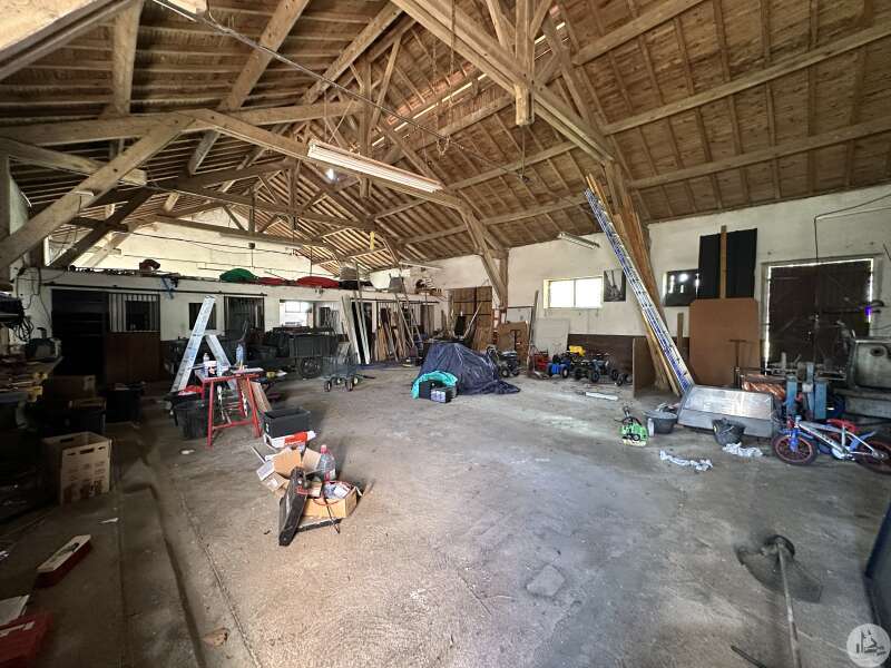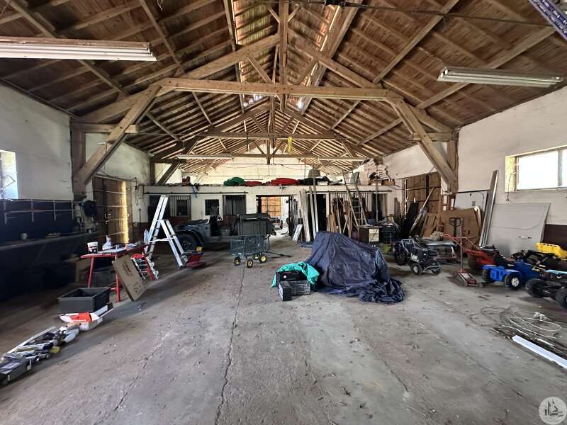 A residential house comprising: - fitted kitchen (12.5m²) - dining room (25.6m²) - living room (17.4m²) - hallway with cupboards (18.3m²) - large laundry room with secondary kitchen (15m²) opening onto the open-plan shed, with the possibility of extending the living space. - bedroom 1 (12.9m²) with dressing room (3.5m²) and private shower room with sink and toilet (also 4.7m²), with bay window opening onto a terrace. - bedroom 2 with bay window offering access to the outdoor terrace (13m²). - bedroom 3 (14m²), also with access to the outside. - shower room with sink and cupboards (9.6m²). - separate toilet (1.4m²). Outside: - a large adjoining open-plan shed (approximately 168m²). - A workshop, formerly used as stables (approximately 286m²) - A well with abundant water (the two toilets and washing machine are connected to it). - A pond - Three large terraces (53m², the one at the entrance, with a room housing the hot water tank for the kitchen; 43m² in front of bedroom 1; 57m² for the one on the left as you exit the living room). Miscellaneous: - Oil-fired central heating - Reversible air conditioning for the kitchen, living room, and dining room. - Open fireplace in the dining room. - Double glazing