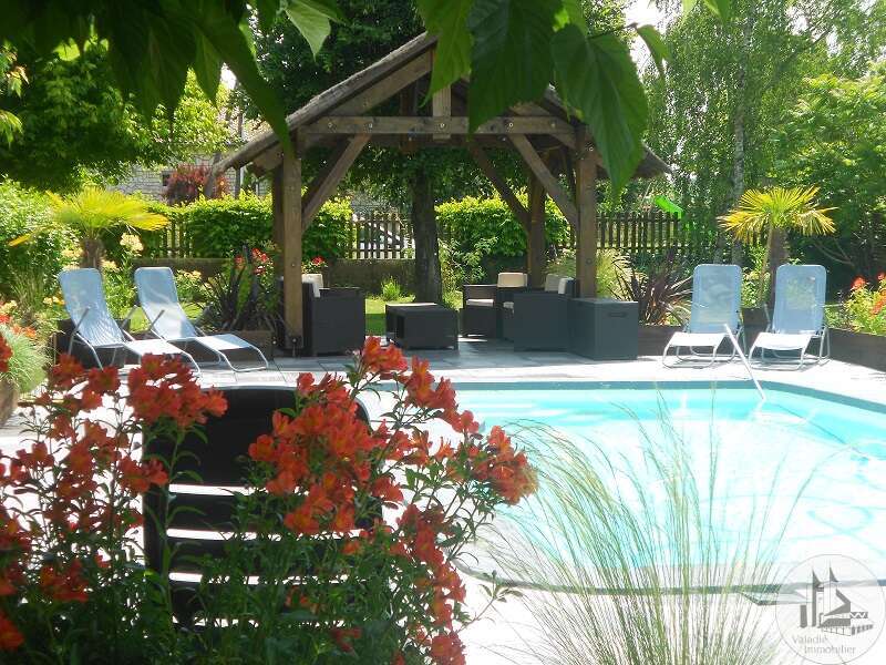 A MUST-SEE!!! Ideal for a large family, a rental investment, or a foster family, etc., given its many possibilities. This property will charm you with its high-quality renovation and the amenities it offers. The main house is comprised as follows: On the ground floor: - A high-quality fitted kitchen (24.5 m²) opening onto a dining room (15.6 m²) - A pantry (5.8 m²) - A living room with incredible proportions (82 m²) - An office (9.4 m²) - A master suite (21 m²) with a dressing room - A bathroom (13 m²) equipped with a whirlpool bathtub, a walk-in shower, and a toilet. -One bedroom (11.3 sq m) -One bedroom (12.3 sq m) -One bedroom (15.6 sq m) -A shower room (5 sq m) -A garage (21.75 sq m) -Upstairs: -A large open-plan space (75 sq m) offering two bedrooms with dressing rooms and a shower room with toilet (9.2 sq m). Mixed wood/oil heating system via a ventilated duct insert and a Viessmann boiler less than 5 years old. High-quality double glazing. Two studios of 45 sq m each, with a terrace, small garden, and separate entrance, complement this property. Each studio has its own sub-meter for simplified rental management. Heating system via electric convectors (latest generation). The enclosed, landscaped garden (1709m²) offers a peaceful and private setting, with minimal overlooking, allowing you to fully enjoy the 8x4m swimming pool, jacuzzi, and sauna. Summer kitchen with pizza oven and barbecue. A well with a pump and automatic watering system is present. On a separate plot, divided by a path, is a vegetable garden (257m²). Parking with electric gate.