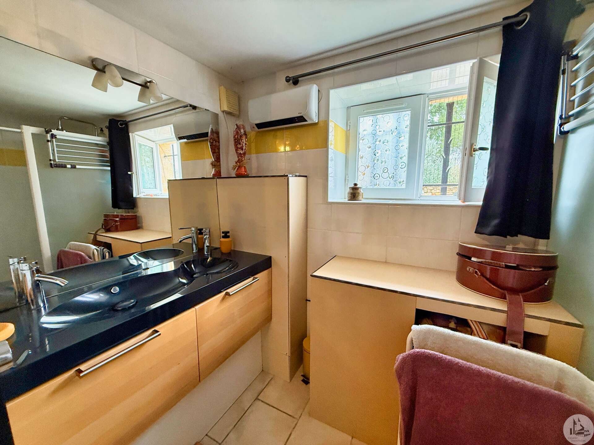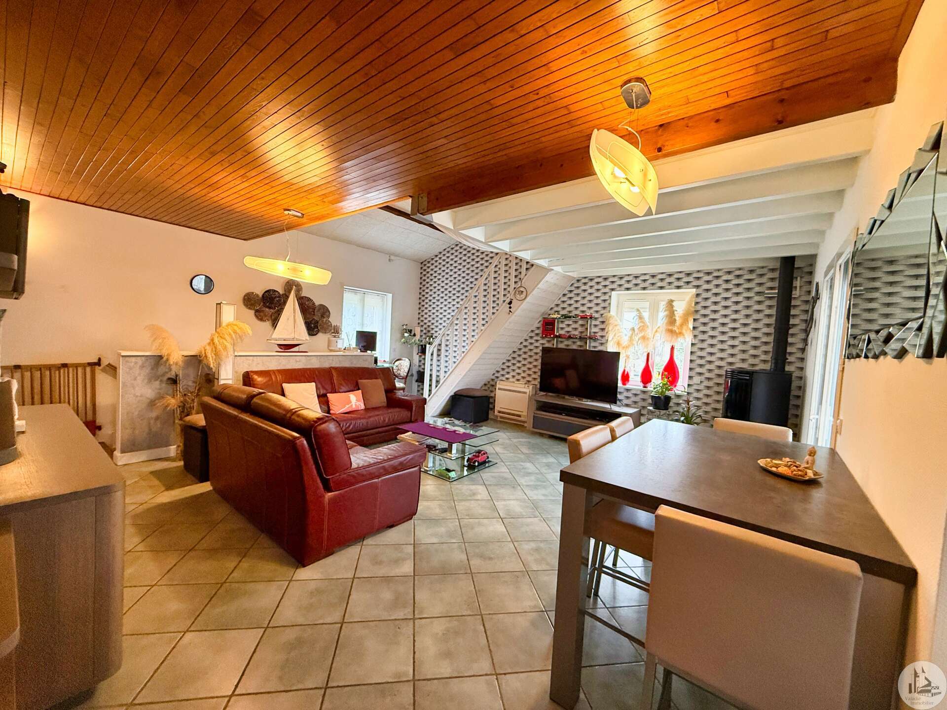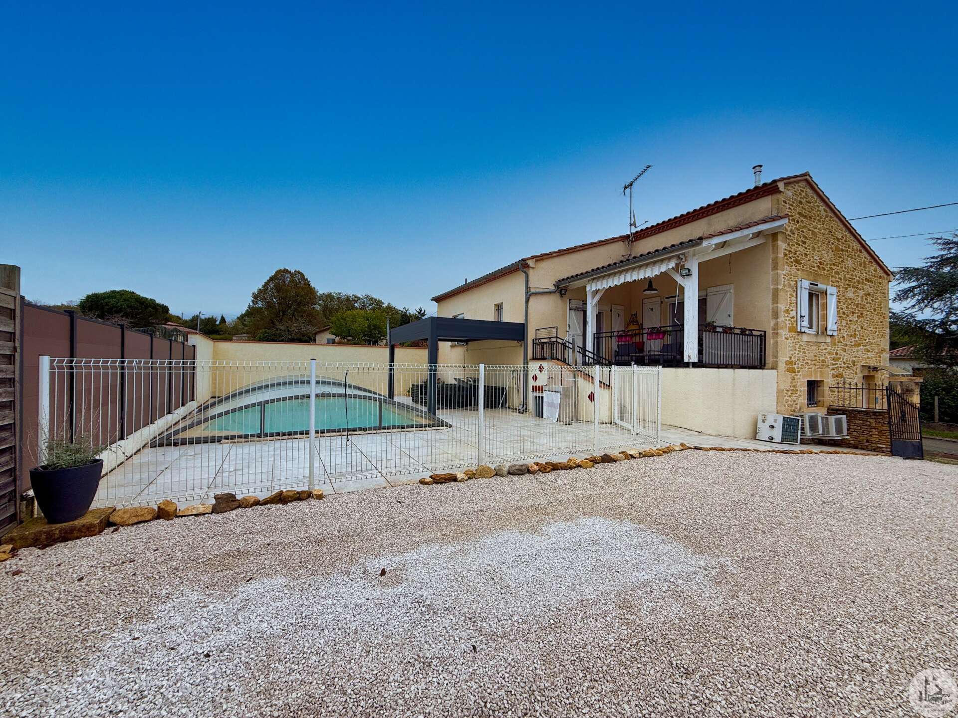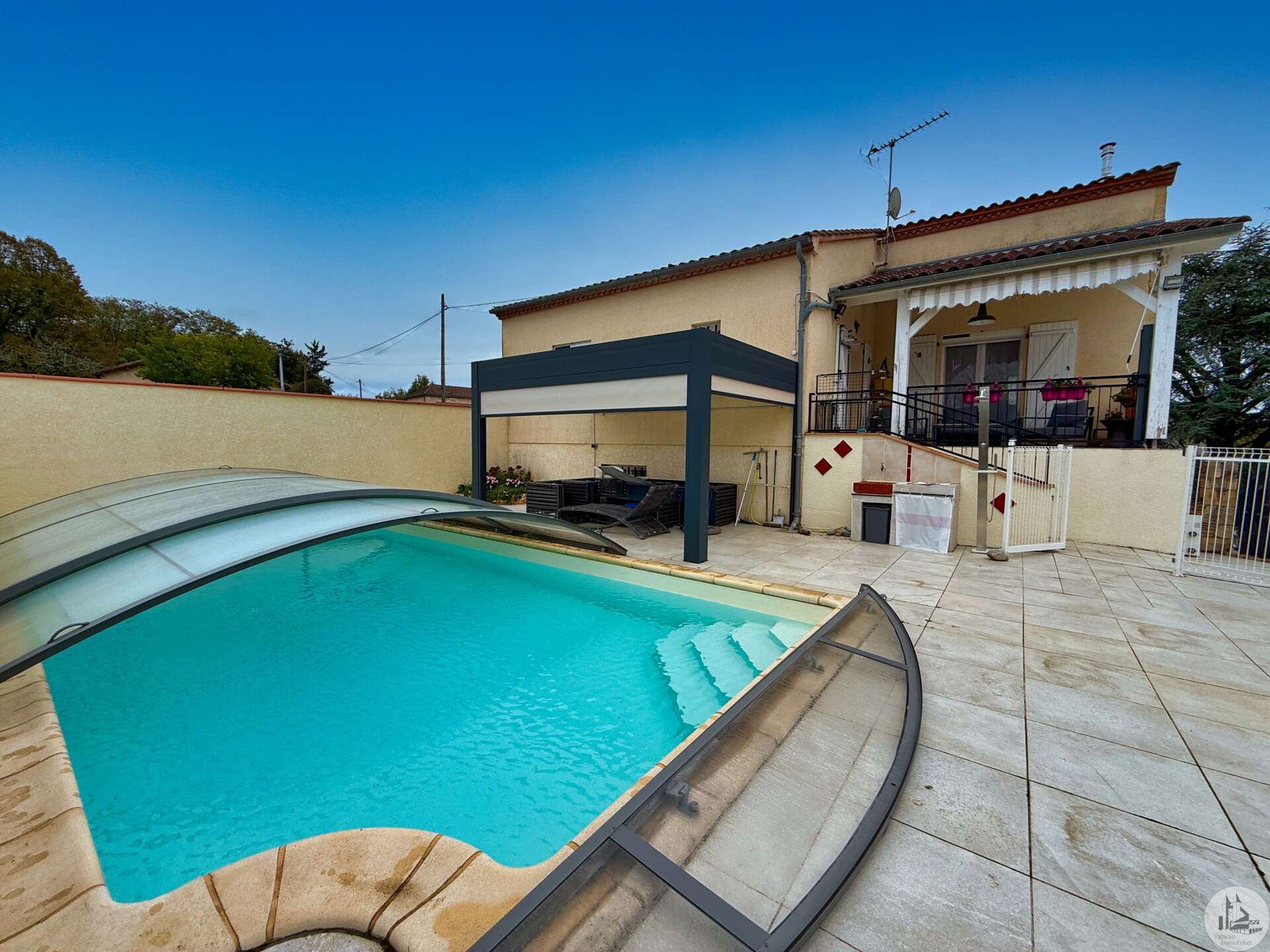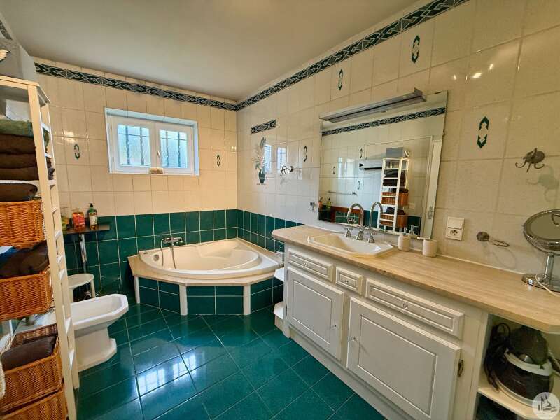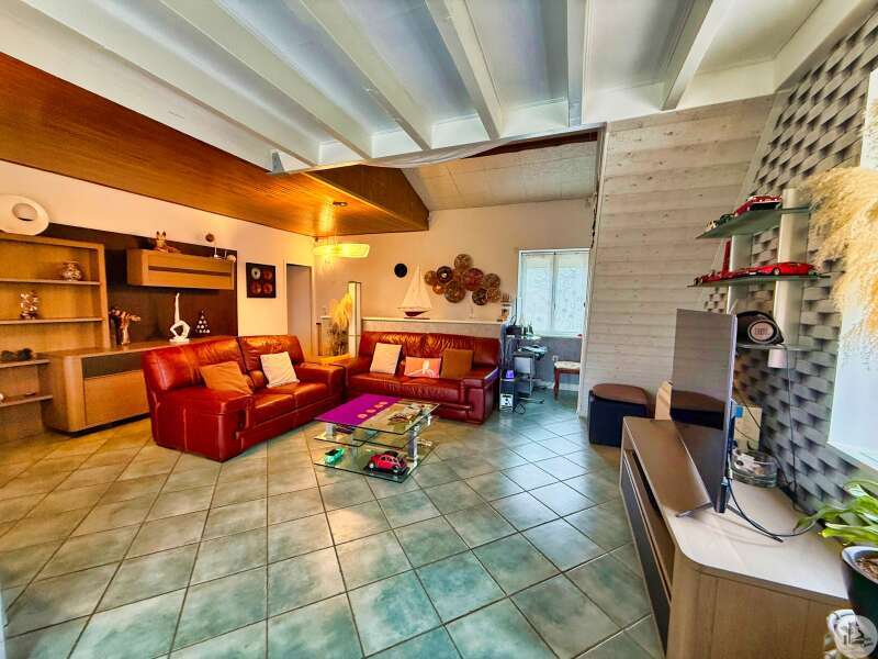 A gate leads to the garden, and a ground-floor entrance provides access to the house, which features a 16m² master suite (bedroom and shower room) with a separate toilet. There is also access to a 32m² single-car garage with an electric door, an 18.32m² boiler room housing the reversible heat pump and thermodynamic water heater, and a 9.31m² wine cellar. On the first floor, a 37m² living room with a pellet stove opens onto a 13m² kitchen with access to a terrace and a view of the swimming pool. Also on this level are two bedrooms of 14.79m² and 11.76m², as well as an 8.26m² bathroom with built-in wardrobes. A 9.29m² mezzanine, currently used as a bedroom, could be converted into an office. Double-glazed wooden windows. Reversible heat pump in all rooms. Solar-powered roller shutters. Mains drainage. Solar panels with buyback agreement with EDF (€1500/year, until 2030), inverter installed in 2025. 8x4m swimming pool with a liner installed in 2012 and a pump installed in 2024, with a manual cover and fully secured by barriers. Bioclimatic pergola with blinds on both sides.