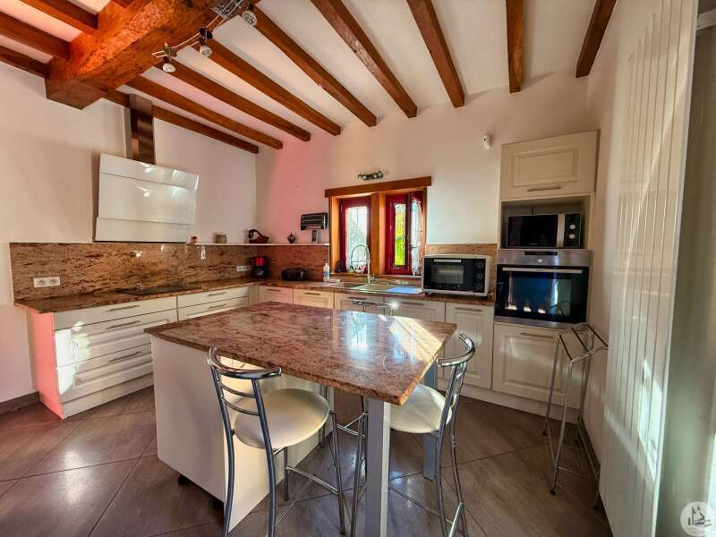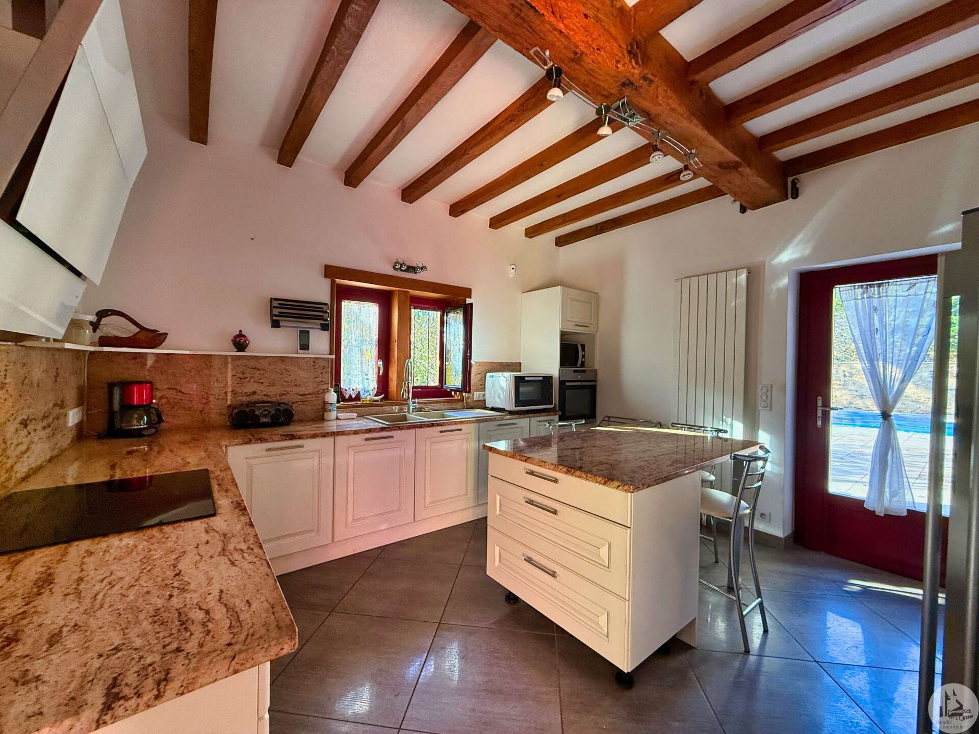 The house, equipped with ducted air conditioning and oil-fired central heating, includes a 16.69 sq m kitchen, two dining rooms measuring 24.39 sq m and 26.93 sq m, and a 41.12 sq m living room with an open fireplace and access to a covered terrace. The ground floor also features an 11.17 sq m bedroom, a 5.18 sq m shower room, and a 2.99 sq m pantry. Upstairs, a 5 sq m landing leads to three bedrooms measuring 12.75 sq m, 15.07 sq m, and 12.42 sq m with exposed beams, a 12.29 sq m shower room with double vanity, and a 7.69 sq m laundry room or dressing room. In the basement, a 19.92m² wine cellar awaits, and a second cellar provides additional storage. There is also a 4.53m² boiler room with a 1999 Wissmann boiler for hot water production and a recently installed (never used) thermodynamic water heater. Outside, there is a 41.21m² two-car garage with an electric sectional door, a 23.52m² section housing the fuel tank, a 30.08m² storage room, an 8.42m² summer kitchen opening onto the swimming pool, a toilet, and a mezzanine. Furthermore, a fully equipped dovecote with reversible air conditioning, accessible via a stone staircase, offers potential as a guest house or holiday rental. It comprises an entrance leading into an 18.78m² room with a kitchenette, a shower room, and upstairs, an 18.78m² bedroom. On the garden level, a 19.05m² bedroom with a shower room and kitchenette could be used as a guest room. Double-glazed aluminum windows Aluminum shutters Non-compliant septic tank Oil-fired heating system (installed in 1999) Reversible air conditioning throughout Electric aluminum gate (installed in 2023) Pool liner (installed in 2022)