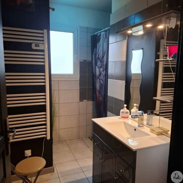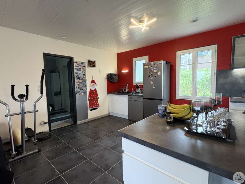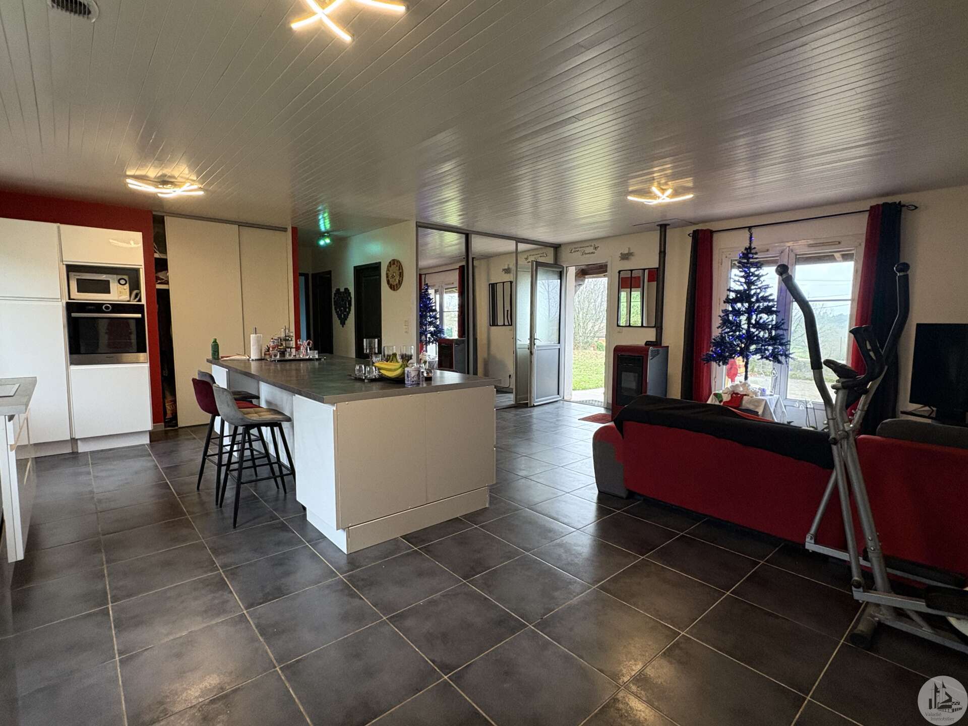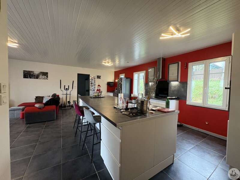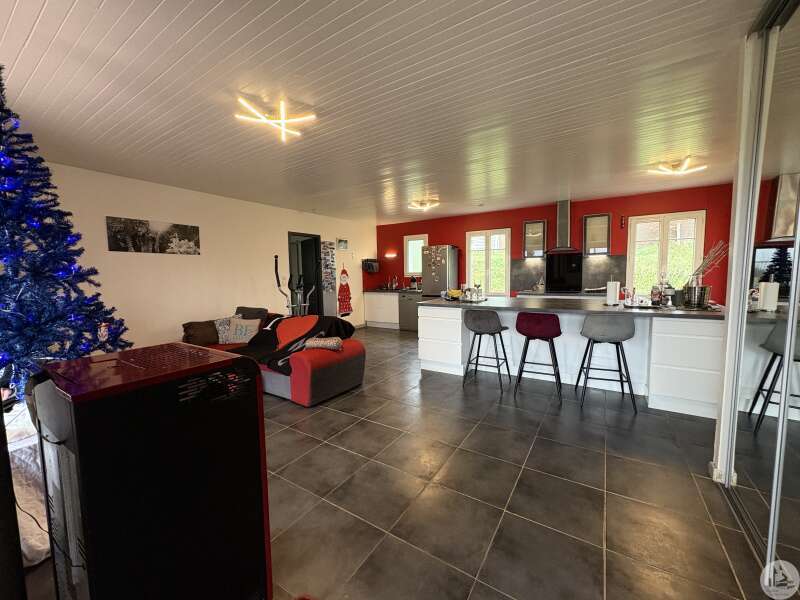 Single-story house built in 2001 on a 1058 m² plot. The approximately 90 m² house comprises: A main room with a fitted kitchen and central island opening onto the living/dining room, three bedrooms, a shower room, a laundry room, and a separate toilet. Adjoining the house is a storage room. Outside, a terrace overlooks an enclosed garden. The windows are double-glazed PVC. Heating is provided by a pellet stove and electric radiators. Mains drainage.