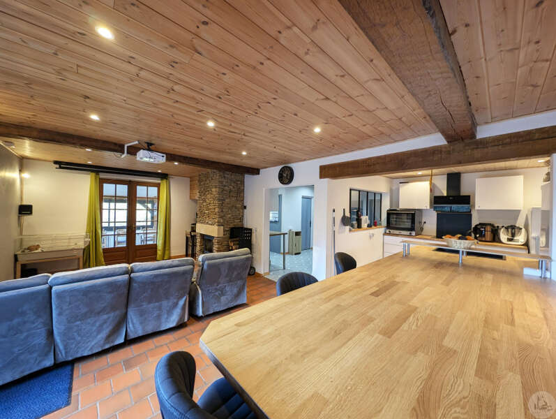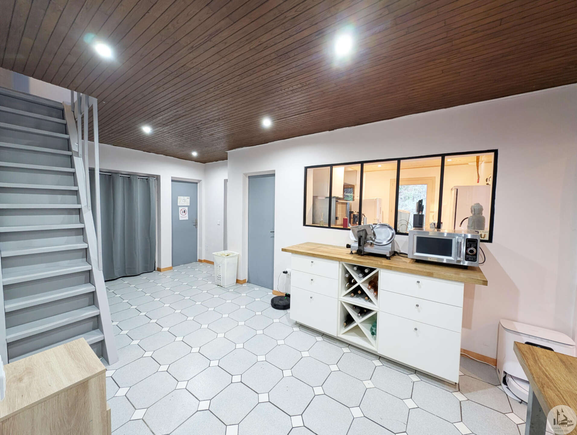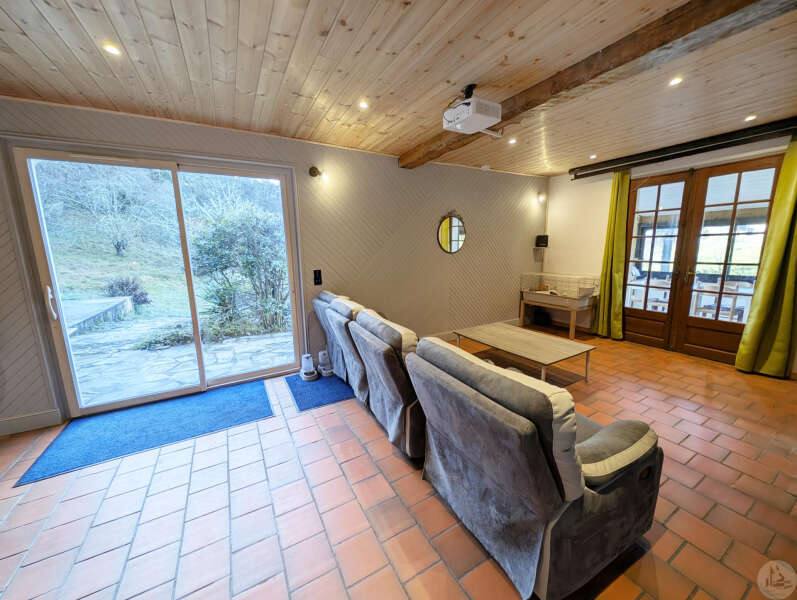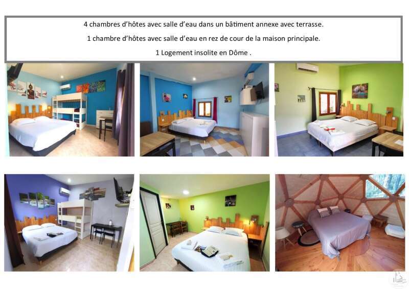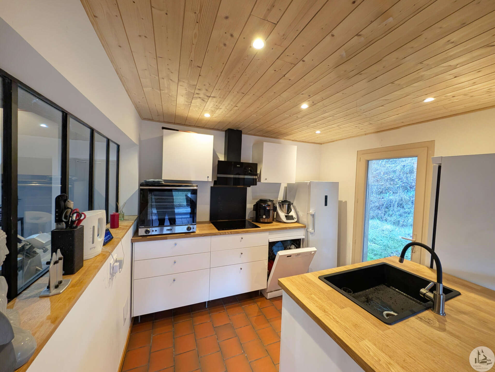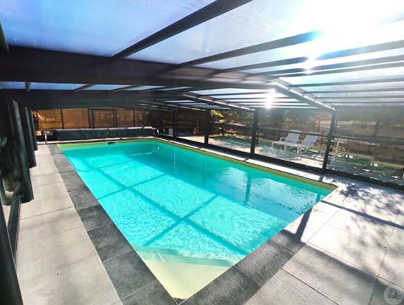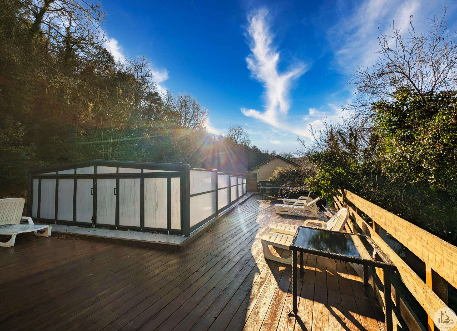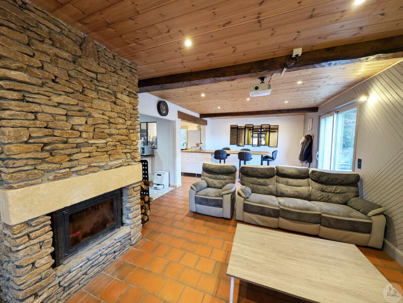 Main House: 16 m² veranda, 18 m² entrance hall, approximately 40 m² living room with a recently fitted kitchen and small pantry, dining room with French doors opening onto a terrace, living room with fireplace and French doors opening onto a terrace. Bedroom 1 (12.70 m²), Bedroom 2 (12.35 m²), recently renovated bathroom with shower and bathtub, an office or child's bedroom, and a toilet. Upstairs (Attic): A playroom of approximately 11 m² and two bedrooms of approximately 9 m² each. Ground Floor/Basement: A 22 m² guest room (sleeps 2) with a separate entrance. It faces west and is located on the ground floor of a two-story house, on the front facade. The sleeping area includes a double bed (160x200 cm), a shower room, and a toilet. A private terrace with a garden table is located in front of the room. A basement of approximately 100 m². * Double glazing * Electric heating + reversible air conditioning + fireplace insert with heat distribution system. * Solar panels * Carport for 2 cars * Fast charger for electric vehicles In an annex building, there are 4 guest rooms with independent entrances and a large suspended terrace: - Room 1, a family room of 20 m² (sleeps 5) with a separate entrance. It faces south and overlooks the swimming pool. The sleeping area includes a double bed (160x200 cm), a triple bed (3 bunk beds of 90x190 cm), a shower room, and a toilet. Reversible air conditioning. - Room 2, a double room of 20 m² (sleeps 4) with a separate entrance. It faces south. Facing west and opening onto the main terrace. The sleeping area includes a double bed (160x200 cm), shower room, and toilet. Reversible air conditioning. - Bedroom 3, a 20 m² double room (sleeps 3) with a separate entrance. It faces west and opens onto the main terrace. The sleeping area includes a double bed (160x200 cm), a single bed (90x200 cm), a table, a shower room, and a toilet. Reversible air conditioning. - Bedroom 4, a 20 m² family room (sleeps 5) with a separate entrance. It faces north and overlooks the forest. The sleeping area includes a double bed (160x200 cm), a triple bed (3 bunk beds, 90x190 cm), a shower room, and a toilet. Reversible air conditioning. 1 unusual accommodation: The Dome is a geodesic hemisphere 12m² (sleeps 2) with a wooden frame and canvas exterior, fully insulated. The sleeping area includes a double bed (140x1900). Dry toilet and outdoor solar shower. Private parking for guests. Heated, covered swimming pool with a retractable dome. Summer kitchen area for guests with a sheltered terrace.