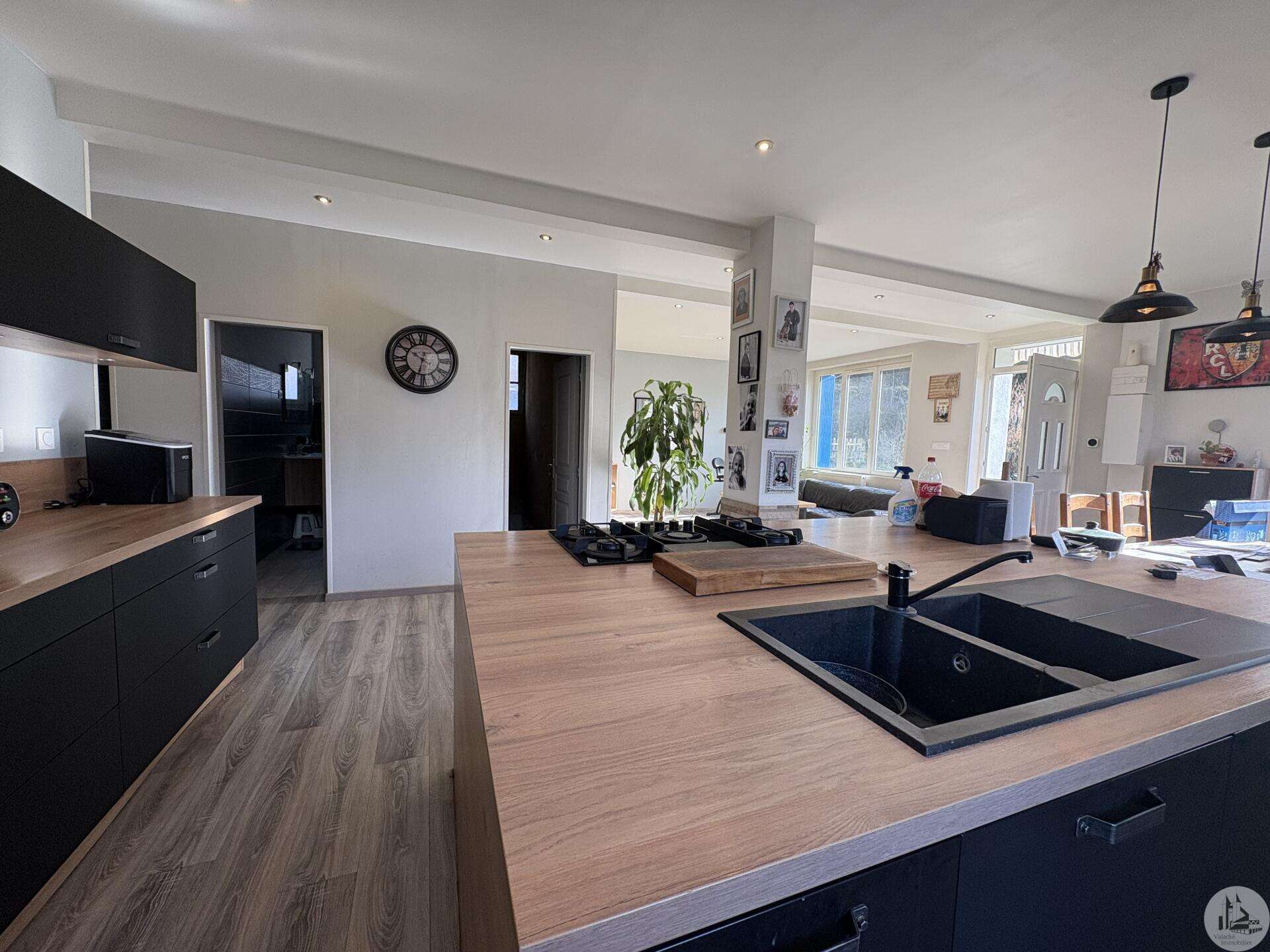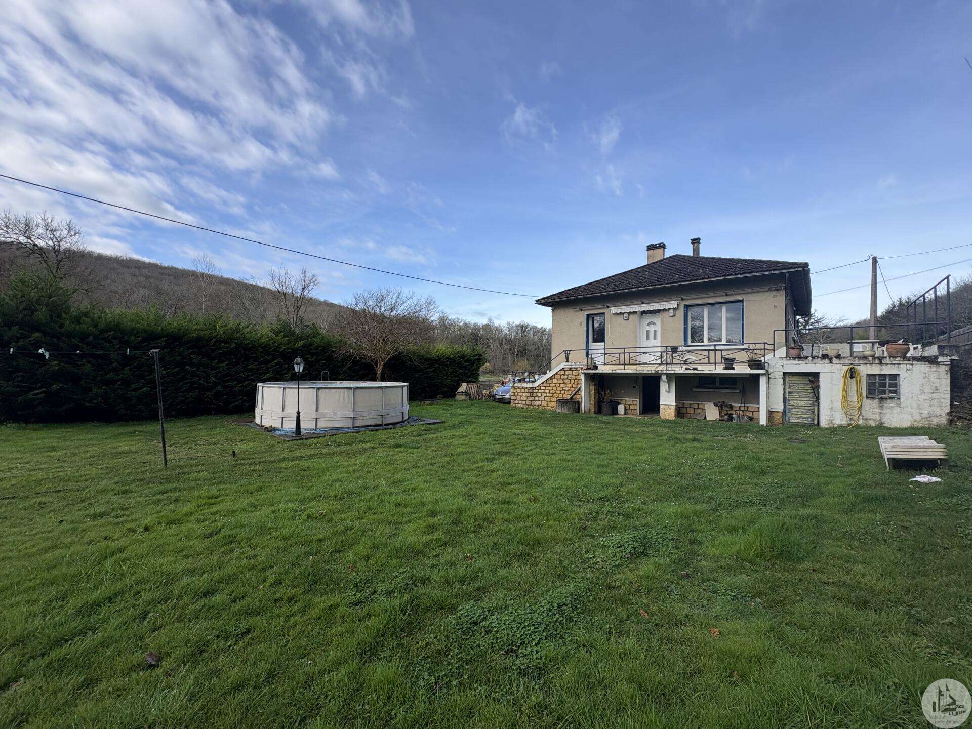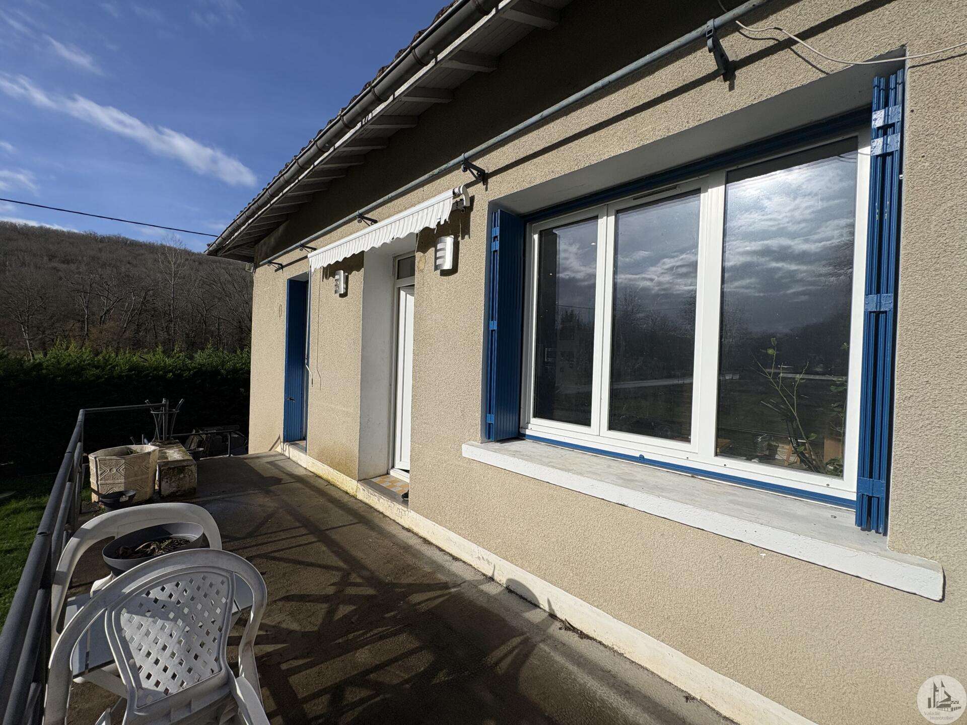 House with a basement, built in 1959 on a 1375 m² plot. The living area on the first floor, approximately 83 m², comprises: A main living/dining room with an open-plan fitted kitchen, two bedrooms, a shower room with double vanity, and a separate toilet. The basement, of the same size with access from both inside and outside, comprises: A double garage, a laundry area, and a storage room. Two outbuildings: A detached garage and a workshop. Outside, there is a terrace on each level with a courtyard and enclosed garden. The windows and doors are double-glazed PVC. The heating system is mains gas with a recently installed boiler. The wastewater treatment system is an individual septic tank. Solar panels.