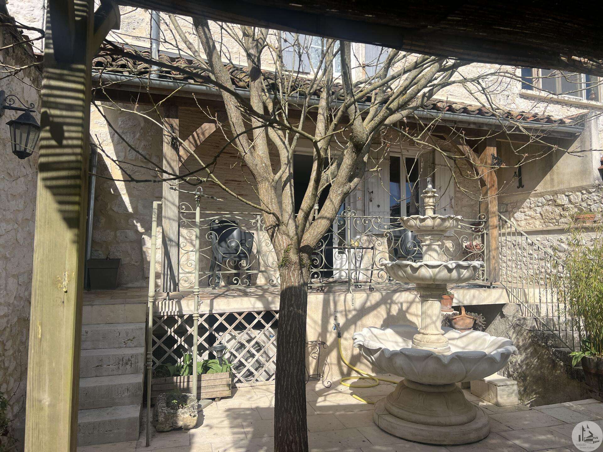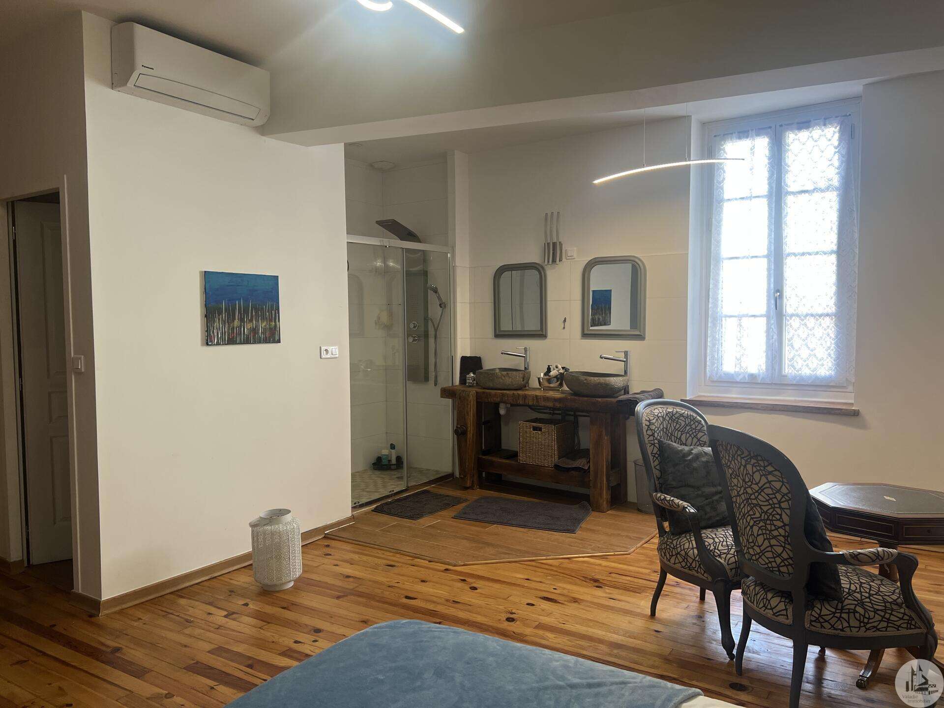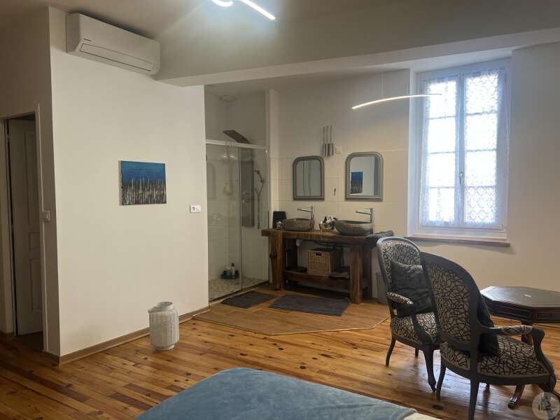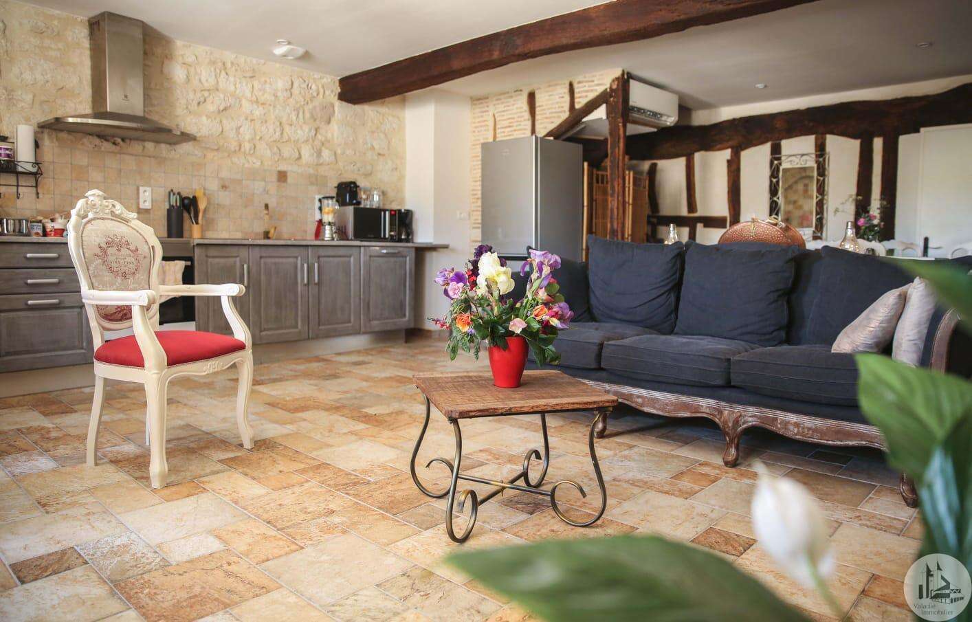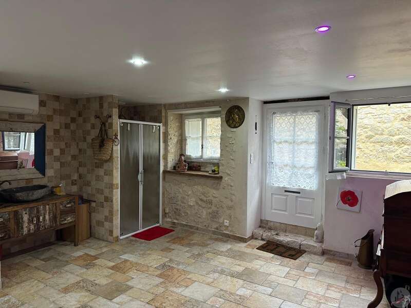 Issigeac, Dordogne – Fully Renovated | Private Courtyard boasting a Wellness Area Located in the heart of the highly sought-after medieval village of Issigeac, this beautifully renovated character home (2019) offers the perfect balance between historic charm and modern comfort. Just 20 minutes from Bergerac International Airport . This is an ideal lock-up-and-leave home, full-time residence, or income-generating rental property. Key Features 150 m² (1,615 sq ft) of living space 70 m² of additional spaces (hammam, spa, garage, cellar, terrace) 75 m² private landscaped courtyard Energy rating: B (excellent efficiency) Heat pump system with full heating & air conditioning throughout Private well for garden use Annual property tax: €702 Shops, restaurants, cafés and weekly markets are all within walking distance. Layout Overview Ground Floor A bright 37.5 m² open-plan living and dining area with wood-burning stove and fully equipped kitchen — perfect for entertaining or relaxed family living. A major asset: a 23 m² fully fitted space with shower room and WC, pre-plumbed for a kitchenette. With its own independent entrance onto the medieval street, this area can function as an eventual Self-contained studio apartment or Home office or creative workspace First Floor 25 m² bedroom overlooking the courtyard with en-suite shower room 29 m² bedroom overlooking the medieval street with en-suite shower room Both feature walk-in Italian showers and private WC. Second Floor 20 m² bedroom with en-suite shower room + additional space under the eaves 15 m² relaxation area or additional bedroom + further attic space Private Wellness Area A rare feature for a village property: A 16 m² dedicated wellness space in the courtyard including: Hammam Spa Shower WC Ideal for rental or boutique guest accommodation. The property also benefits from a cellar with a stone well.