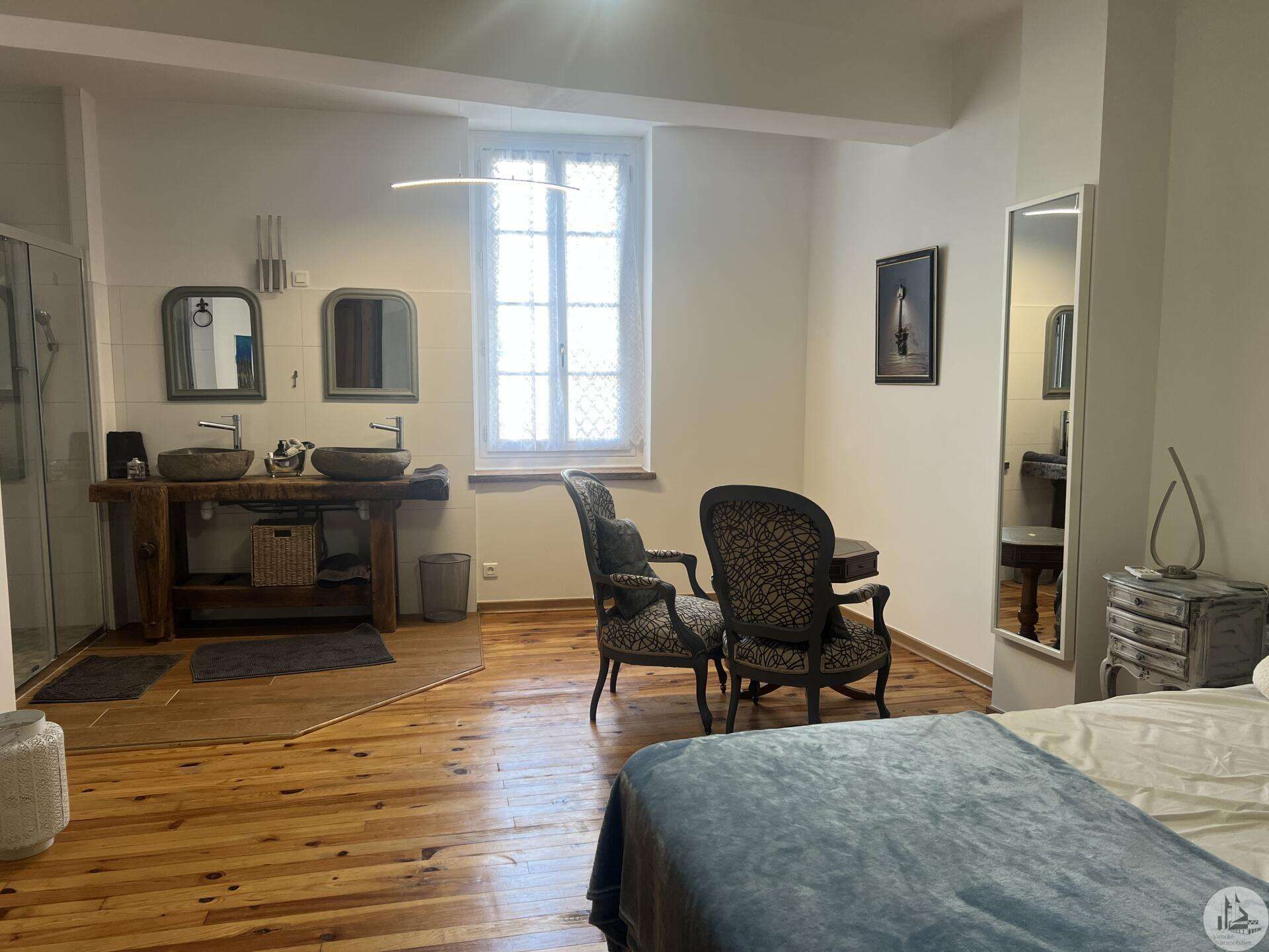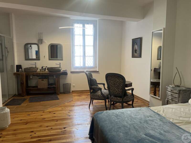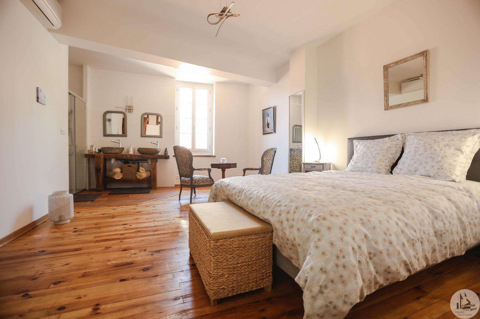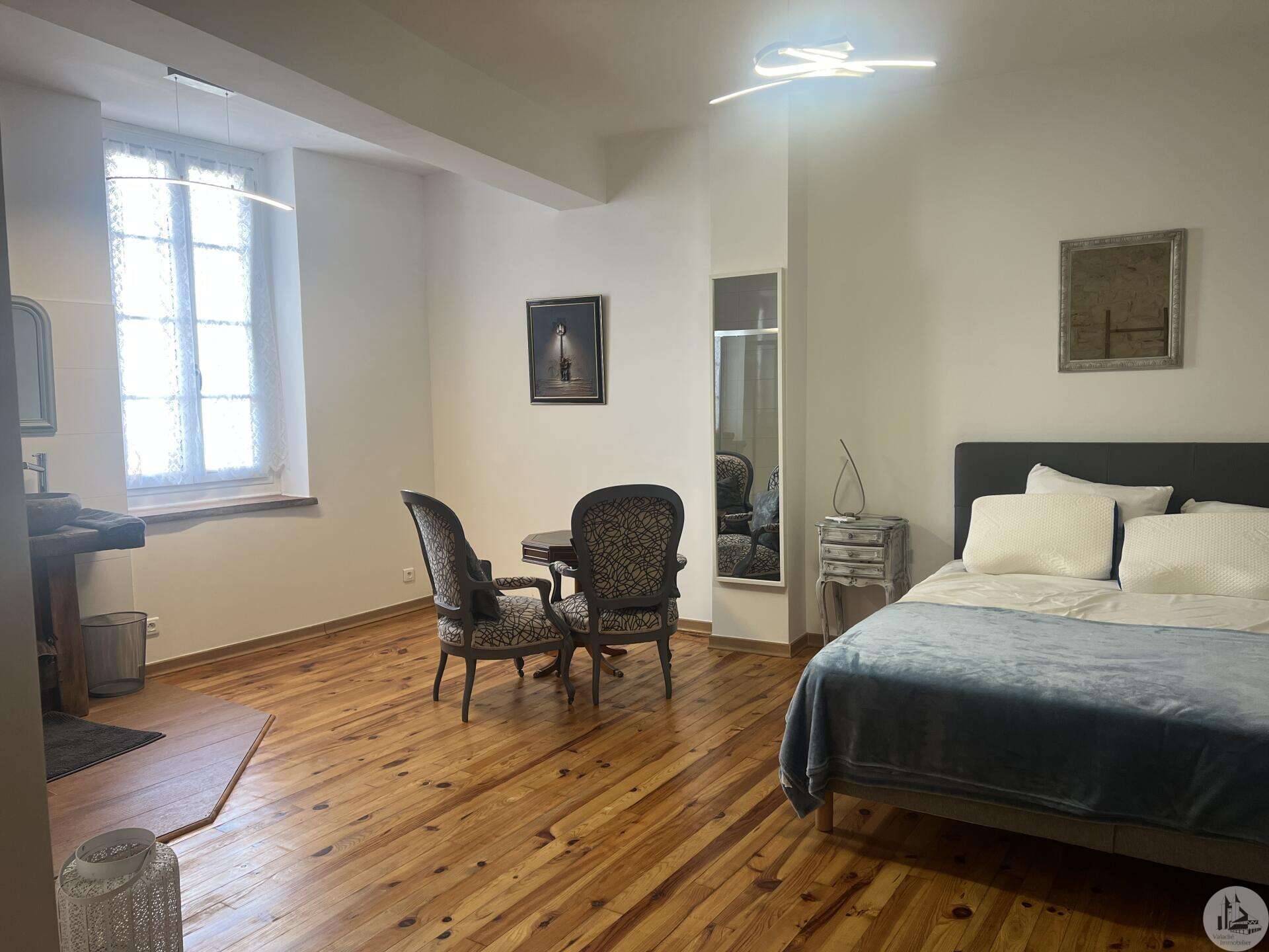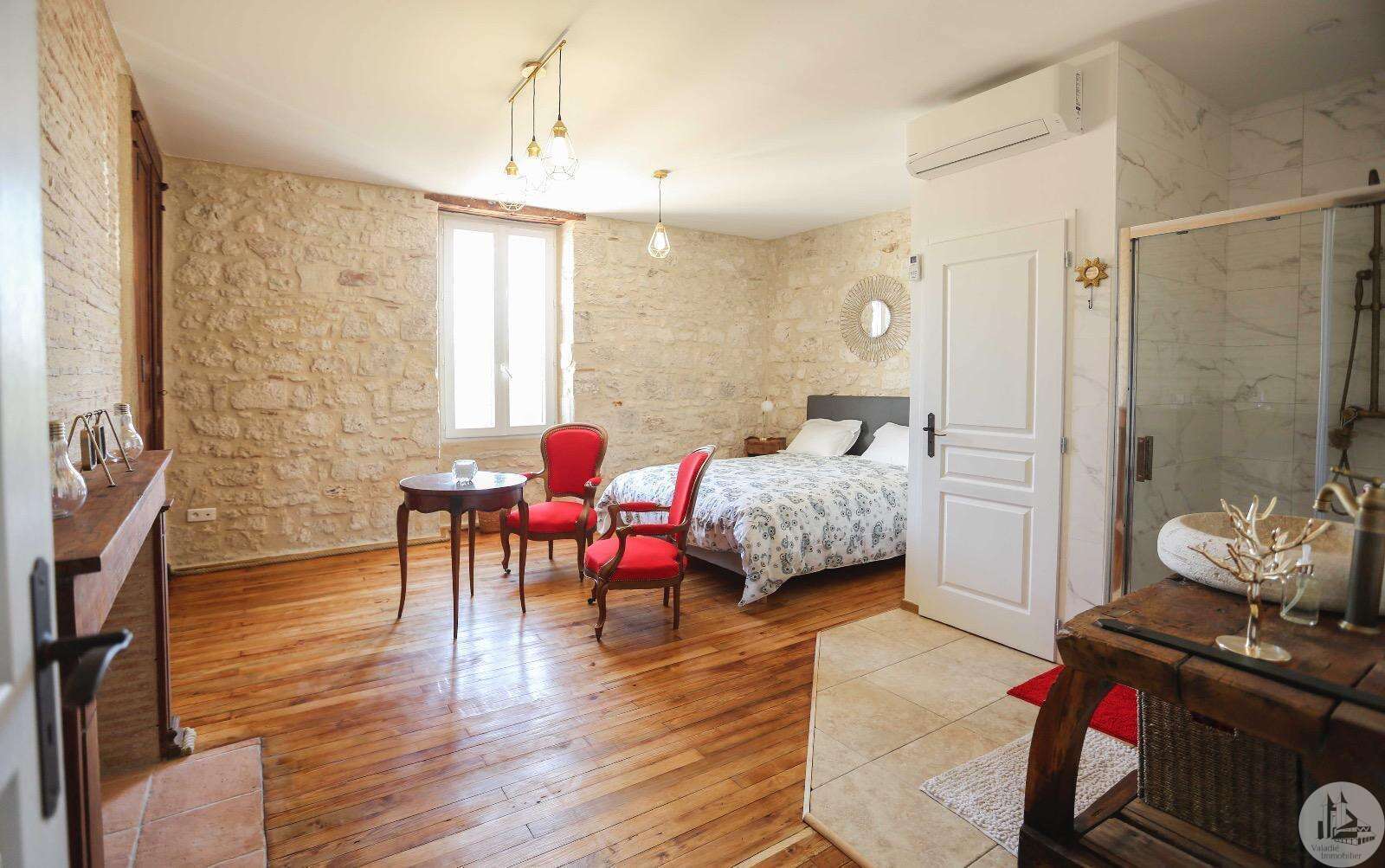 Issigeac, Dordogne – Fully Renovated | Private Courtyard boasting a Wellness Area Located in the heart of the highly sought-after medieval village of Issigeac, this beautifully renovated character home (2019) offers the perfect balance between historic charm and modern comfort. Just 20 minutes from Bergerac International Airport . This is an ideal lock-up-and-leave home, full-time residence, or income-generating rental property. Key Features 150 m² (1,615 sq ft) of living space 70 m² of additional spaces (hammam, spa, garage, cellar, terrace) 75 m² private landscaped courtyard Energy rating: B (excellent efficiency) Heat pump system with full heating & air conditioning throughout Private well for garden use Annual property tax: €702 Shops, restaurants, cafés and weekly markets are all within walking distance. Layout Overview Ground Floor A bright 37.5 m² open-plan living and dining area with wood-burning stove and fully equipped kitchen — perfect for entertaining or relaxed family living. A major asset: a 23 m² fully fitted space with shower room and WC, pre-plumbed for a kitchenette. With its own independent entrance onto the medieval street, this area can function as an eventual Self-contained studio apartment or Home office or creative workspace First Floor 25 m² bedroom overlooking the courtyard with en-suite shower room 29 m² bedroom overlooking the medieval street with en-suite shower room Both feature walk-in Italian showers and private WC. Second Floor 20 m² bedroom with en-suite shower room + additional space under the eaves 15 m² relaxation area or additional bedroom + further attic space Private Wellness Area A rare feature for a village property: A 16 m² dedicated wellness space in the courtyard including: Hammam Spa Shower WC Ideal for rental or boutique guest accommodation. The property also benefits from a cellar with a stone well.