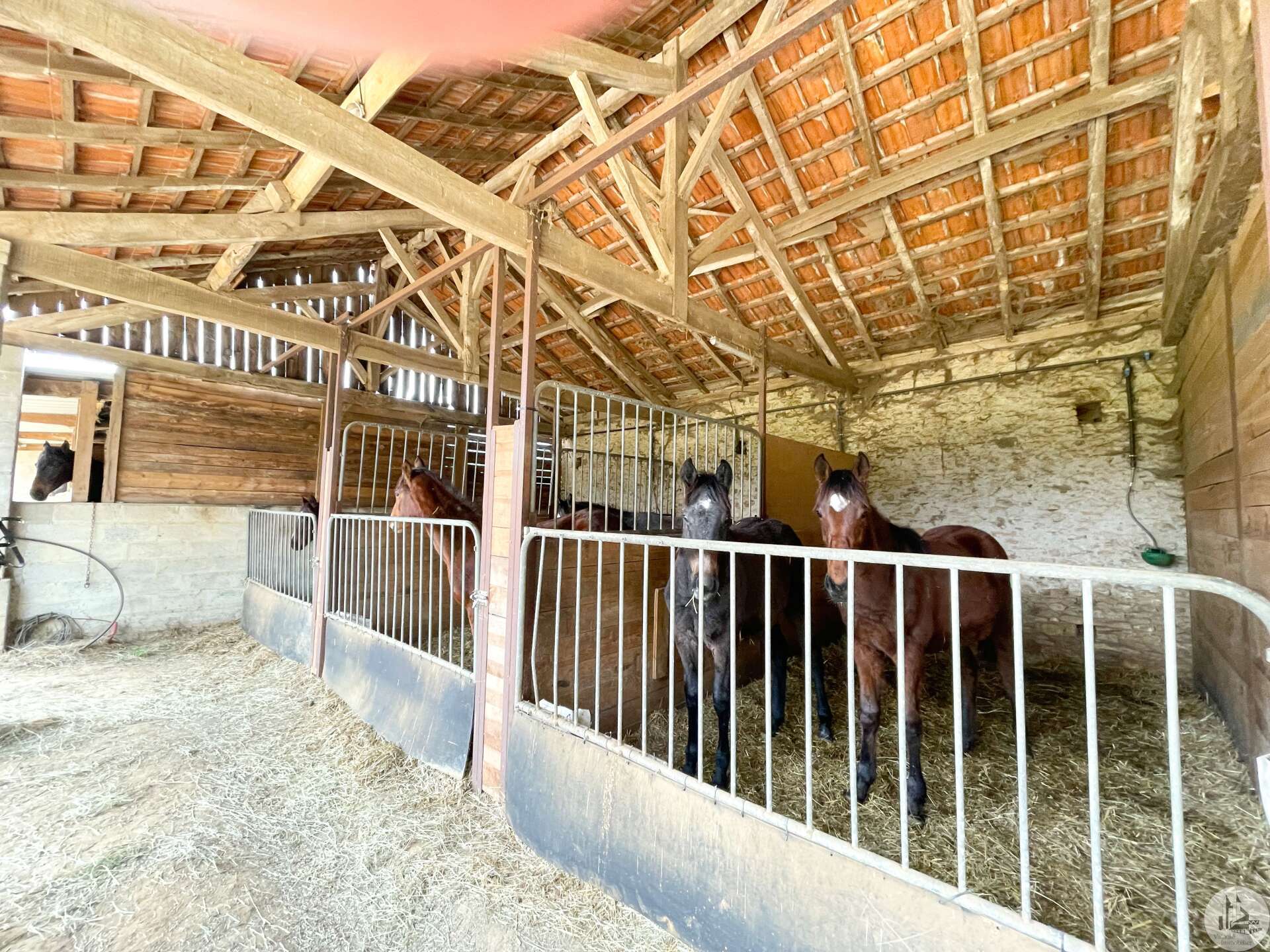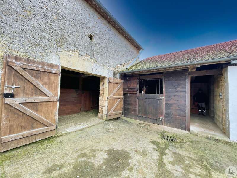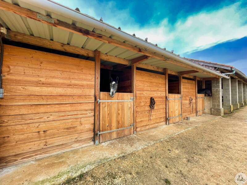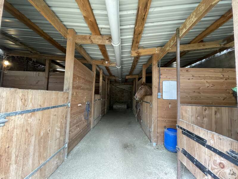 The 140 m² house is composed as follows: On the garden level, two cellars of 25 and 43 m², a boiler room of 12 m² (wood boiler from 1970) The bolet (covered terrace) is accessed by an exterior stone staircase opening onto the living area consisting of a living room with open kitchen of 20 m² with fireplace closed by an insert (an inglenook fireplace), two bedrooms of 10 m² and a bathroom. water of 8.23 m² served by a corridor, and a second living room of 13 m² or bedroom, as well as a bathroom of 7 m². All the attics can be converted, having an area of 70 m² with a good ceiling height (between 2.80 and 3.10 m) and partly insulated with a beautiful old exposed framework and a dovecote with the possibility of making three bedrooms. Septic tank PVC double glazing Interior design proposal in latest photos Close to an equine veterinary clinic, these stables are practical thanks to the different dimensions of the boxes allowing the horses to be properly separated as desired: Pony boxes, horses, broodmares or foaling boxes... The outbuildings used as stables, opposite the house, are nearby with a pretty interior courtyard in the center. The environment is wooded and calm. All fences are made of electrical tape (4cm) Paddocks have been set up, fenced in smooth wood. The stone outbuildings are arranged in a stable and composed as follows: -two indoor boxes of 3x7m -three indoor boxes of 3.5x3m -two outdoor boxes of 3x7m -an outdoor box of 3x4m -three outdoor boxes of 4x4m -two indoor boxes of 3.5x3m -three indoor boxes of 4x3m -a saddlery -a grain store in the form of a lean-to -a workshop -an insulated office with double glazing and electric heating to accommodate customers -a shed which allows fodder, straw, etc. to be stored (or possibility of stabling) -a four-seater electric walker -protrusion bar -ultrasound bar Possibility of additional land Three-phase Three small relaxation paddocks (the size of a lunge ring) with stabilized soil for a quarry. Water rights