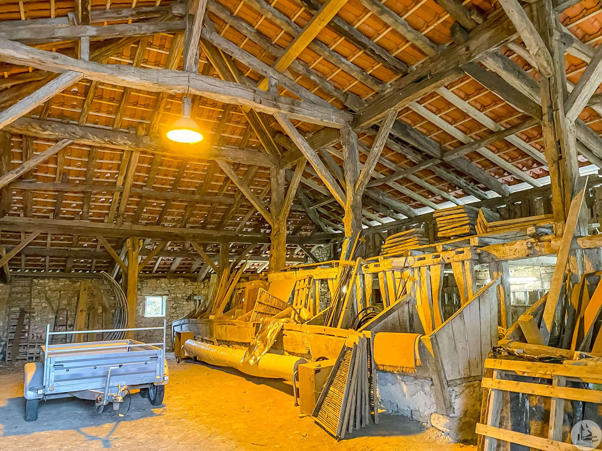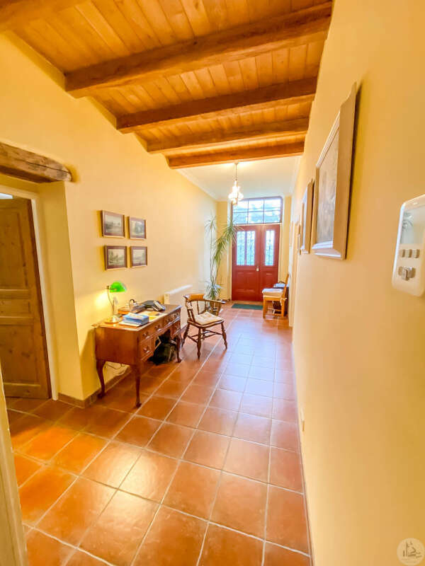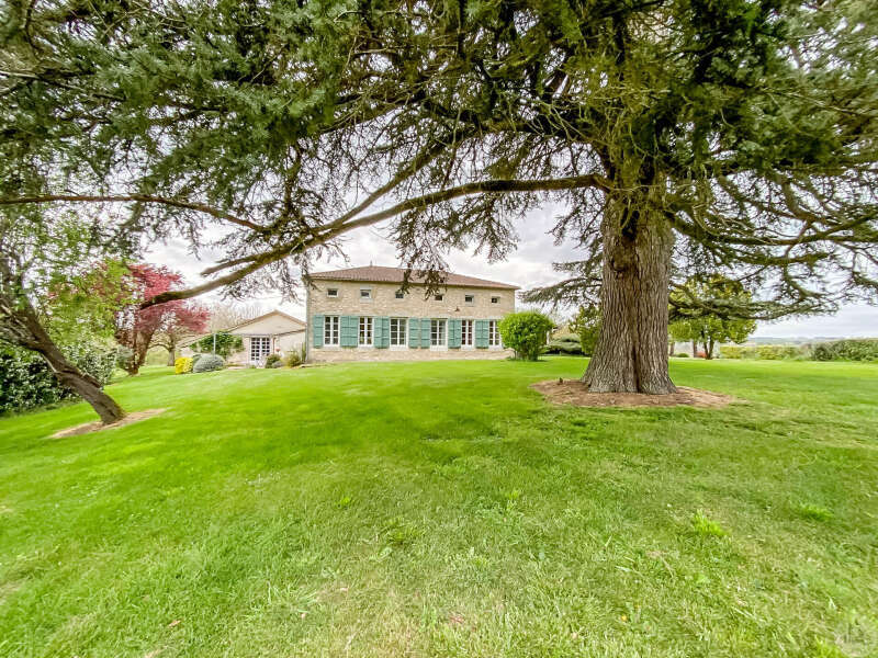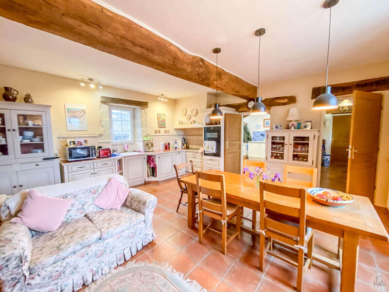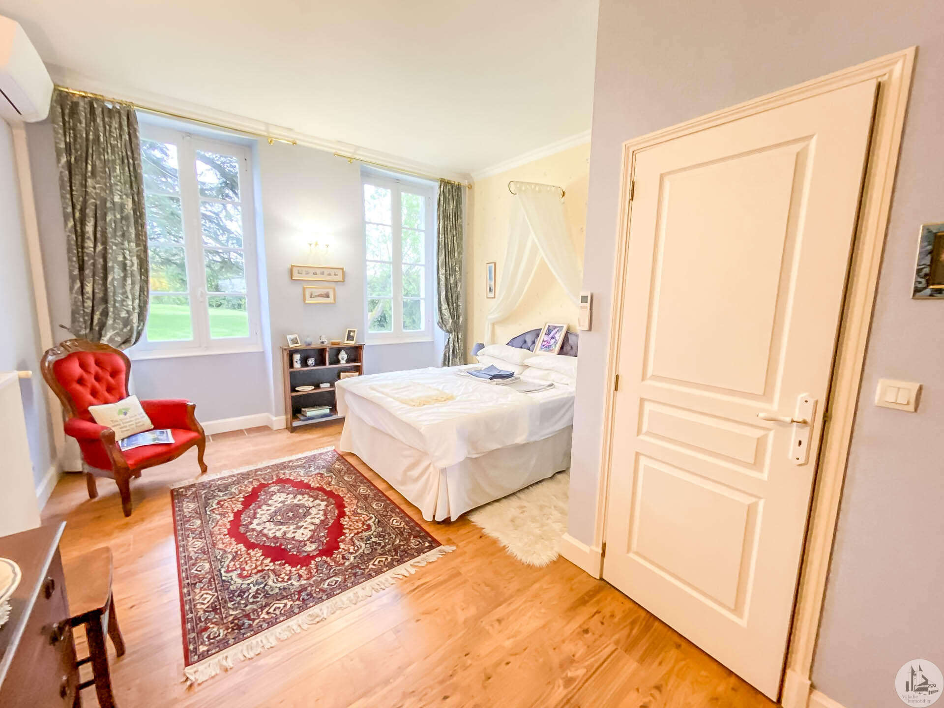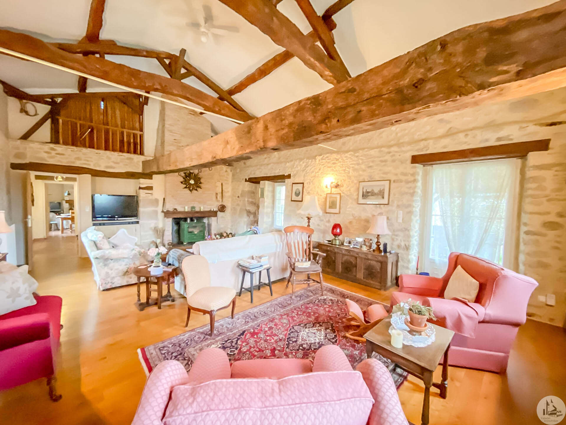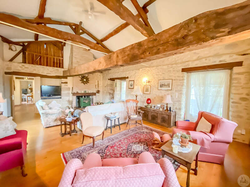 A stone house with approximately 363 m² of living space, comprising: On the ground floor: - An entrance hall of approximately 6 m², tiled floor. - A living room of approximately 45.2 m², parquet flooring, two French doors (one opening onto the covered terrace), a fireplace with a wood-burning stove. Ceiling height of 4.8 m. - A kitchen of approximately 28.7 m², tiled floor, a fireplace with a wood-burning stove. The kitchen is fitted with cupboards and equipped with an oven, extractor hood, induction hob, and tiled walls. - A pantry/laundry room of approximately 12 m², tiled floor, upper and lower cupboards, and tiled walls. A French door opens onto the rear garden. - A spacious entrance hall/corridor of approximately 19.7 m², tiled floor. - A bedroom of approximately 21.8 m², with tiled flooring, and an en-suite bathroom of approximately 3.34 m², with tiled floor and walls, a bathtub, a sink, a toilet, a towel warmer, a ventilation system, and a bidet. - A bedroom of approximately 24.7 m², with tiled flooring, and an en-suite shower room of approximately 4.2 m², with tiled floor and walls, a shower, a sink, a toilet, a towel warmer, a ventilation system, and a bidet. - A bedroom of approximately 21.2 m², with laminate flooring, and an en-suite shower room of approximately 3.3 m², with tiled floor and walls, a shower, a sink, a toilet, a towel warmer, and a ventilation system. - A separate toilet in the hallway under the stairs, approximately 2 m², with a hand basin, tiled floor, and tiled walls. From the hallway, there is access to a studio apartment of approximately 47.4 sq m, with tiled floors, ample storage, French doors opening onto a terrace and garden, and another door opening onto the courtyard. Adjoining this space are two rooms of approximately 24.2 and 10 sq m, requiring finishing touches to potentially create a bedroom and a bathroom. From the hallway, a staircase leads to the upper floor: - A landing of approximately 11 sq m, with parquet flooring. - A bedroom or office of approximately 28.2 sq m (floor area), with a sloping ceiling, a skylight, built-in wardrobes, and carpeting. - A living room of approximately 21.3 sq m, with parquet flooring. Open to the living area. - A dressing room of approximately 13.6 sq m, with carpeting. - A bedroom of approximately 15.5 sq m, with laminate flooring. A bathroom of approximately 6.7 sq m with a shower, toilet, bidet, and sink. - A room of approximately 30.5 m² to be finished, with plumbing already in place for a potential bathroom. - A cellar extending under the entire living room. Additional information: - Heating via a heat pump and radiators, plus reversible air conditioning in the bedrooms. - The windows and doors are double-glazed PVC with wooden shutters; some windows are still single-glazed wood. - Sewage system with a septic tank, grease trap, and drainage (5 drains). Outside: - A stone barn of approximately 228 m² (17.4m x 13.1m), with an earthen floor. It includes a lean-to of approximately 80 m² (5.32m x 15.03m). The roof was replaced 8 years ago. - A garage of approximately 11.4 m², with a concrete floor. - A garage of approximately 18 m², with a concrete floor. - A workshop of approximately 19.2 m². - A garden shed of approximately 11.5 m². - A 12m x 6m saltwater swimming pool with a flat bottom and a depth of 1.4m, a surrounding terrace, and corner steps. (It was heated, but the heat pump is out of order). - A covered terrace overlooking the courtyard and the pool. - A summer kitchen of approximately 10.8 m² with a toilet and sink. - A well. - A garden of approximately 1 hectare with beautiful mature trees.