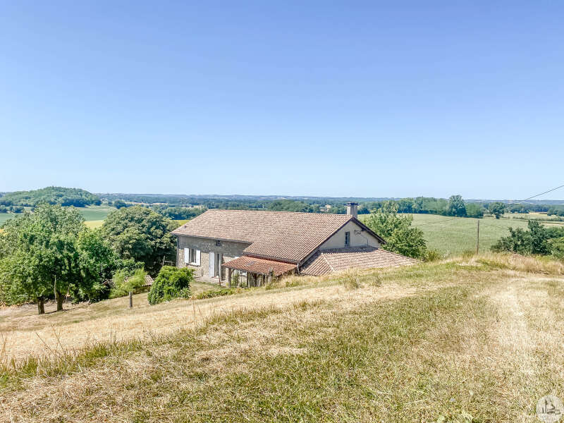 Juchée à flan de colline, lui procurant une splendide vue panoramique sur la campagne, ancienne ferme en pierre offrant une maison de plain-pied, une grange et un garage. Terrain d'environ 6,8 ha attenant.