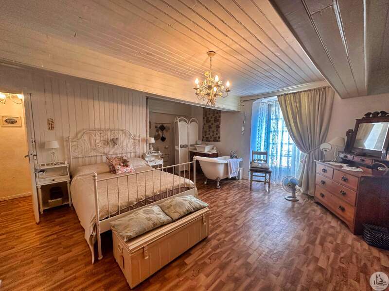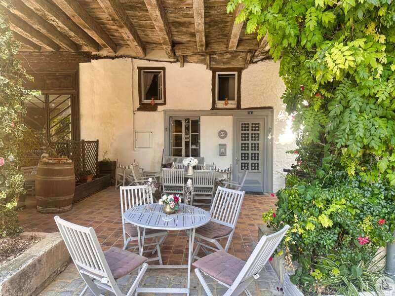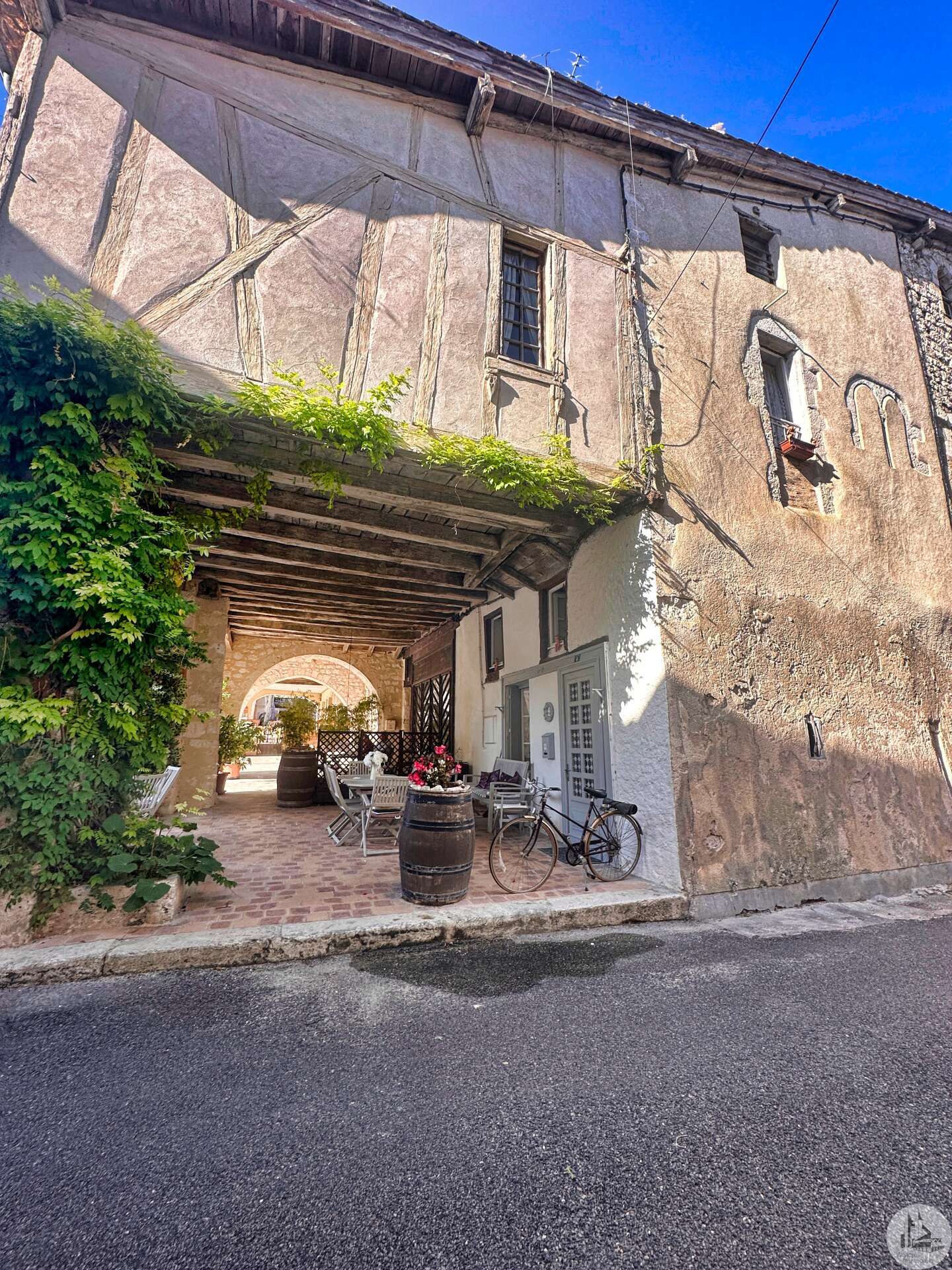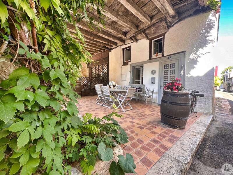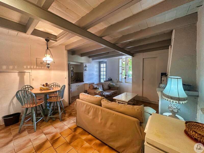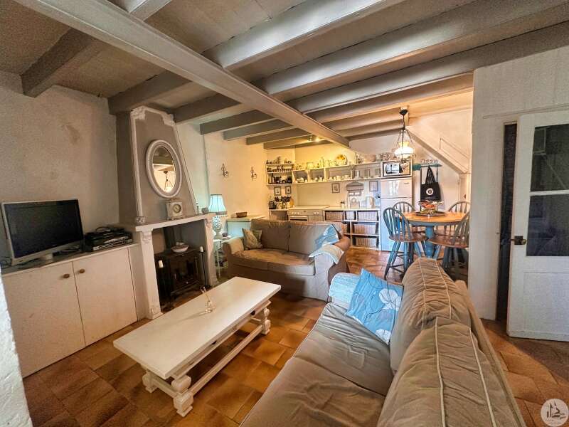 Une maison de village avec terrasse sous les arcades comprenant : - pièce de vie avec coin cuisine, électroménager inclus (23m2), - porte d'accès à la cave; Au premier étage : - pallier, sol ciment (3,4m2), - chambre (10,5m2), - salle de douches avec vasque (5,8m2), - wc avec lave-mains; Etage 2 : - chambre avec baignoire, vasque et wc (22,5m2); Etage 3 : buanderie pouvant tout à fait être une chambre avec salle d'eau (25m2). Tout à l'égout, simple vitrage, chauffage électrique, vendu entièrement MEUBLÉ ET ÉQUIPÉ, plus qu'à poser les valises !!!