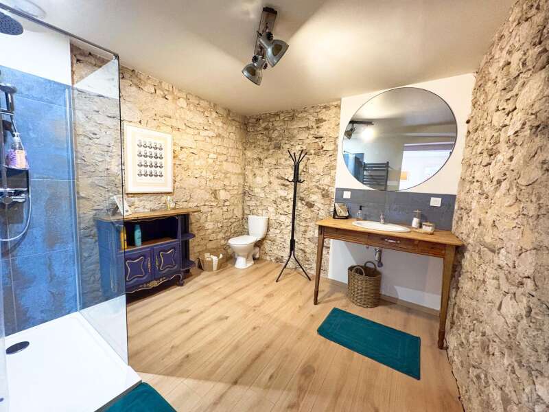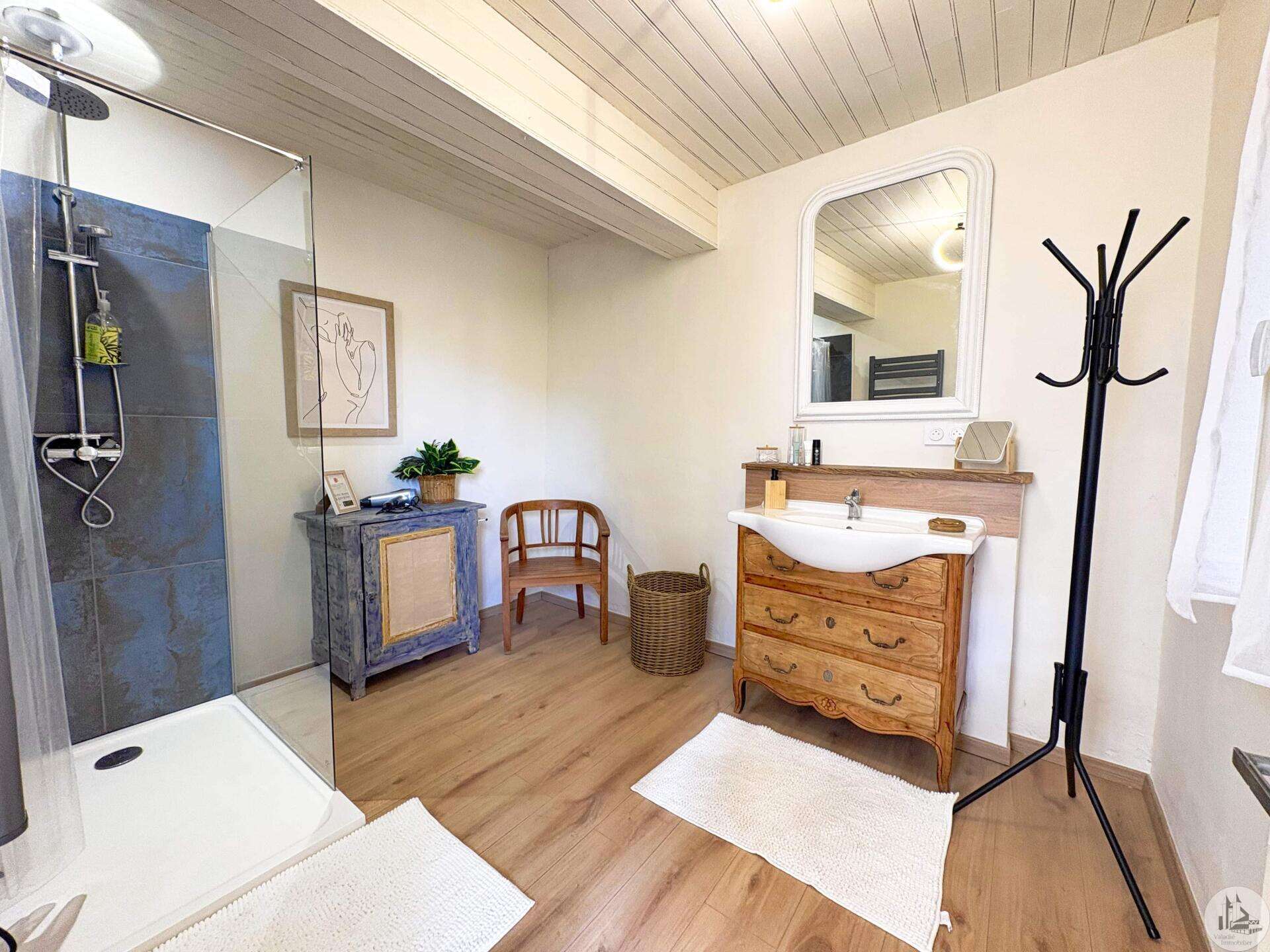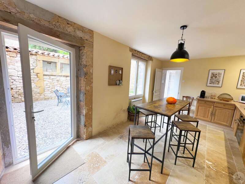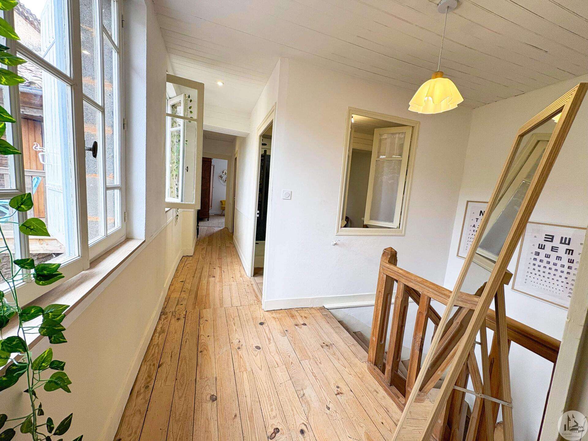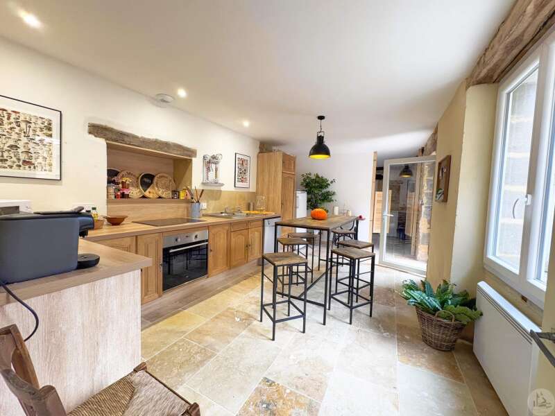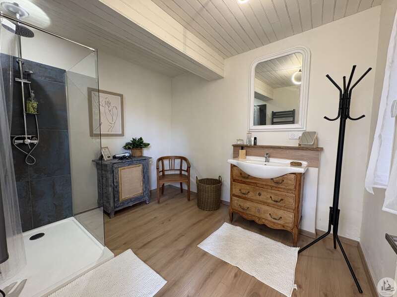 Maison de village mitoyenne, rénovée, d'environ 123 m2 avec extérieur. L'habitation se compose; Au rez de chaussée, d'une entrée, une cuisine équipée, une pièce principale salon/salle à manger, une buanderie, un toilette séparé avec lavabo. A l'étage, un palier, trois chambres dont une en suite et une avec balcon, une seconde salle d'eau, un toilette avec lavabo. A l'extérieur une cour avec jardinet. Les huisseries sont en double et simple vitrage. Le chauffage est électrique nouvelle generation.
