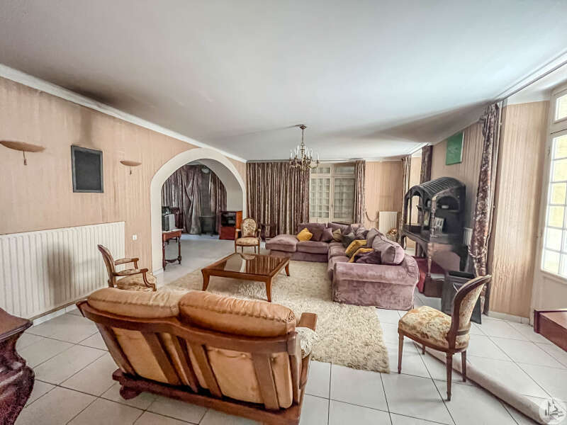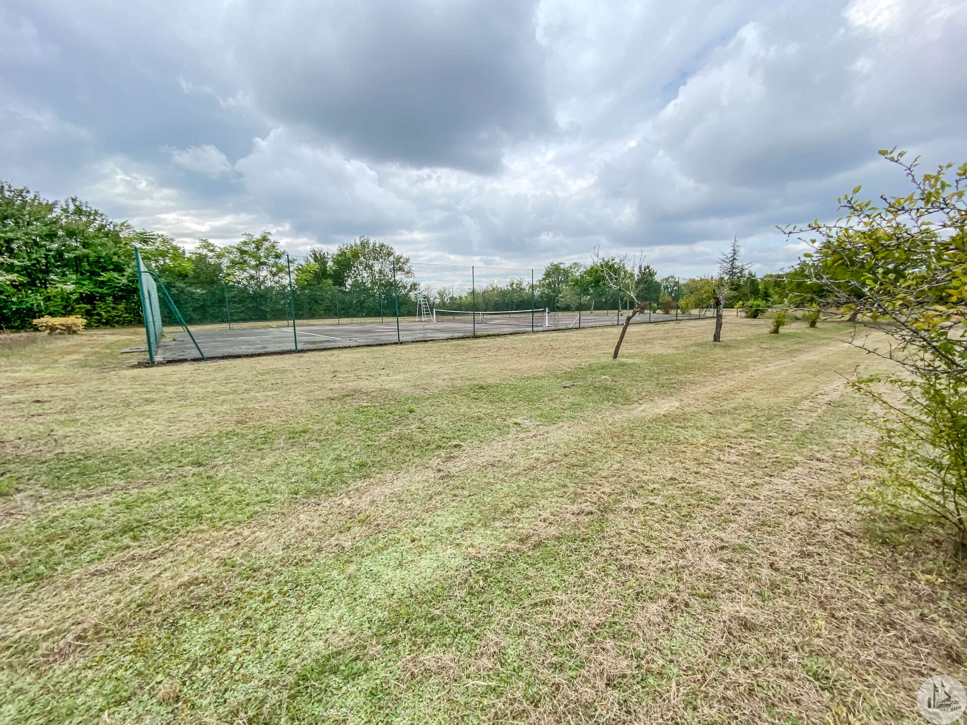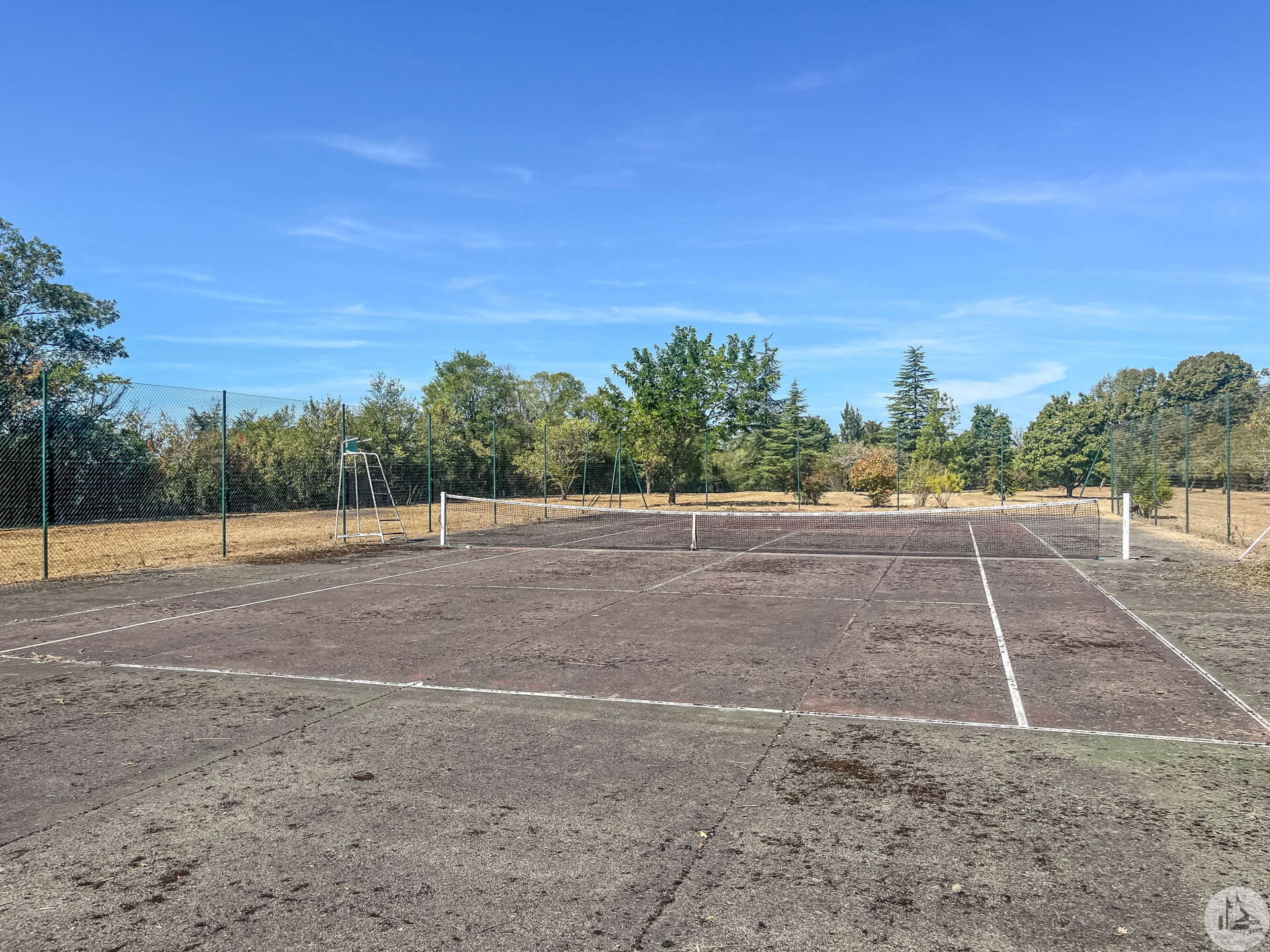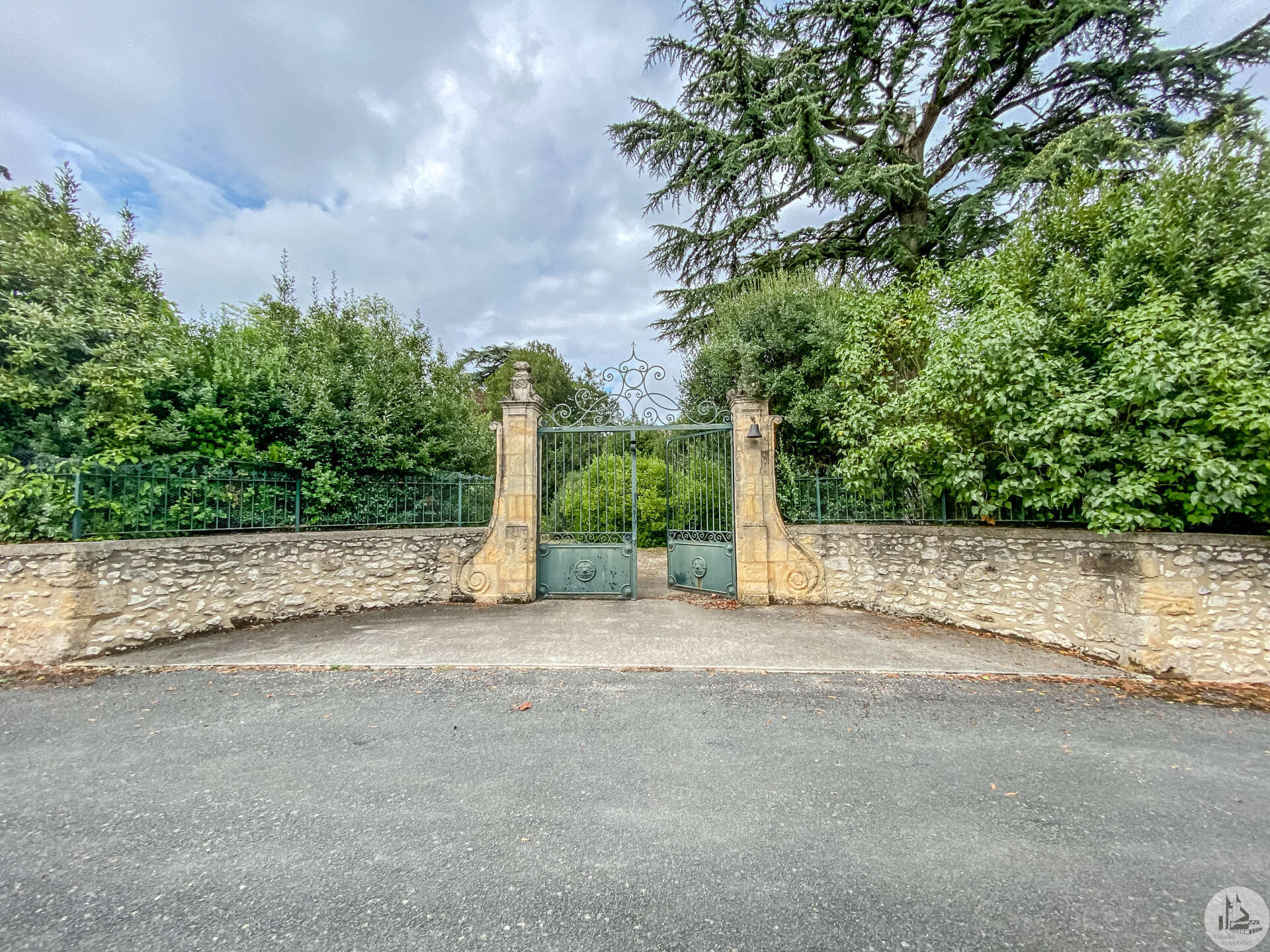 Une maison d'habitation de type maison de Maitre avec une extension moderne, comprenant - Un hall d'entrée de 21,2 m2 environ, carrelage au sol, bel escalier en bois desservant l'étage. Depuis ce hall d'entrée sur la droite : - Un séjour/salon/ salle à manger en forme de L de 77 m2 environ, avec 6 portes-fenêtres, carrelage au sol, une cheminée équipée d'un insert, tapisseries aux murs. - Un sas de rangement de 3 m2 environ, lino au sol. - Une cuisine/salle à manger de 42 m2 environ avec une porte desservant l'extérieur. Cuisine aménagée d'un évier et placard. - Un couloir de distribution de 10,7 m2 environ, carrelage au sol et placards. - Un dégagement de 3 m2 environ avec un évier, et un wc séparé. - Une salle d'eau en cours de restauration de 9,3 m2 environ, une porte-fenêtre, parquet flottant, faience carrelage. - Un bureau de 12,6 m2 environ, moquette au sol, une porte-fenêtre, tapisserie aux murs. A l'étage : - Un palier de 21 m2 environ, avec une cage d'escalier, parquet massif au sol, une porte-fenêtre donnant un accès sur un balcon. Nous continuons le sens de la visite sur la droite : - Une chambre de 19,5 m2 environ, moquette au sol sur plancher, une cheminée décorative, une fenêtre, un placard. - Une chambre ensuite mais aussi accessible par un couloir, surface de 15,5 m2 environ, moquette au sol sur plancher, 2 fenêtres. - Un dégagement de 2,6 m2 environ, carrelage au sol - Une salle de bains de 14,5 m2 environ, carrelage au sol, faïence aux murs et tapisserie légèrement décollé à certains endroit. Un lavabo, une baignoire, un wc, un bidet, 2 fenêtres en double vitrage. - Un wc séparé - Une chambre de 14,9 m2 environ, moquette au sol, un placard, 2 fenêtres, un lavabo, tapisserie aux murs. - Une lingerie de 5,4 m2 environ, parquet au sol - Un couloir traversant de 12,8 m2 environ, parquet - Une chambre de 15,5 m2 environ, parquet au sol, une fenêtre en simple vitrage, avec une salle d'eau ensuite. - Une chambre de 17,6 m2 environ, moquette au sol, avec la même salle d'eau ensuite. Lavabo, cabine de douche, lino au sol, faïence (3,7 m2 environ). - Une chambre de 21,6 m2 environ, placards, 2 fenêtre simple vitrage, moquette au sol. - Un salon de 31,4 m2 environ, parquet au sol, 3 fenêtres en simple vitrage, avec une cheminée en marbre avec des moulures, et plafonniers en moulures. Un second étage desservant : - Un grenier sur toute la surface de la maison (171 m2 environ), parquet au sol. - Un toit terrasse exposé Nord-Est Chauffage central au fuel avec des radiateurs en fonte. Un adoucisseur d'eau. Un ancien chai en pierre de 18m X 6m. Très joli parc arboré, avec une piscine couverte par un dome de 9m X 4,5m avec un escalier roman. Un chalet en bois pour abriter la pompe de la piscine a été placé à côté. Un terrain de tennis se situe sur le parc aussi. Le grillage est en bon état mais le revêtement en quick est à refaire. Un garage en pierre et parpaings qui se trouve en face de la propriété. Un ancien chai en pierre de 18m X 6m.
