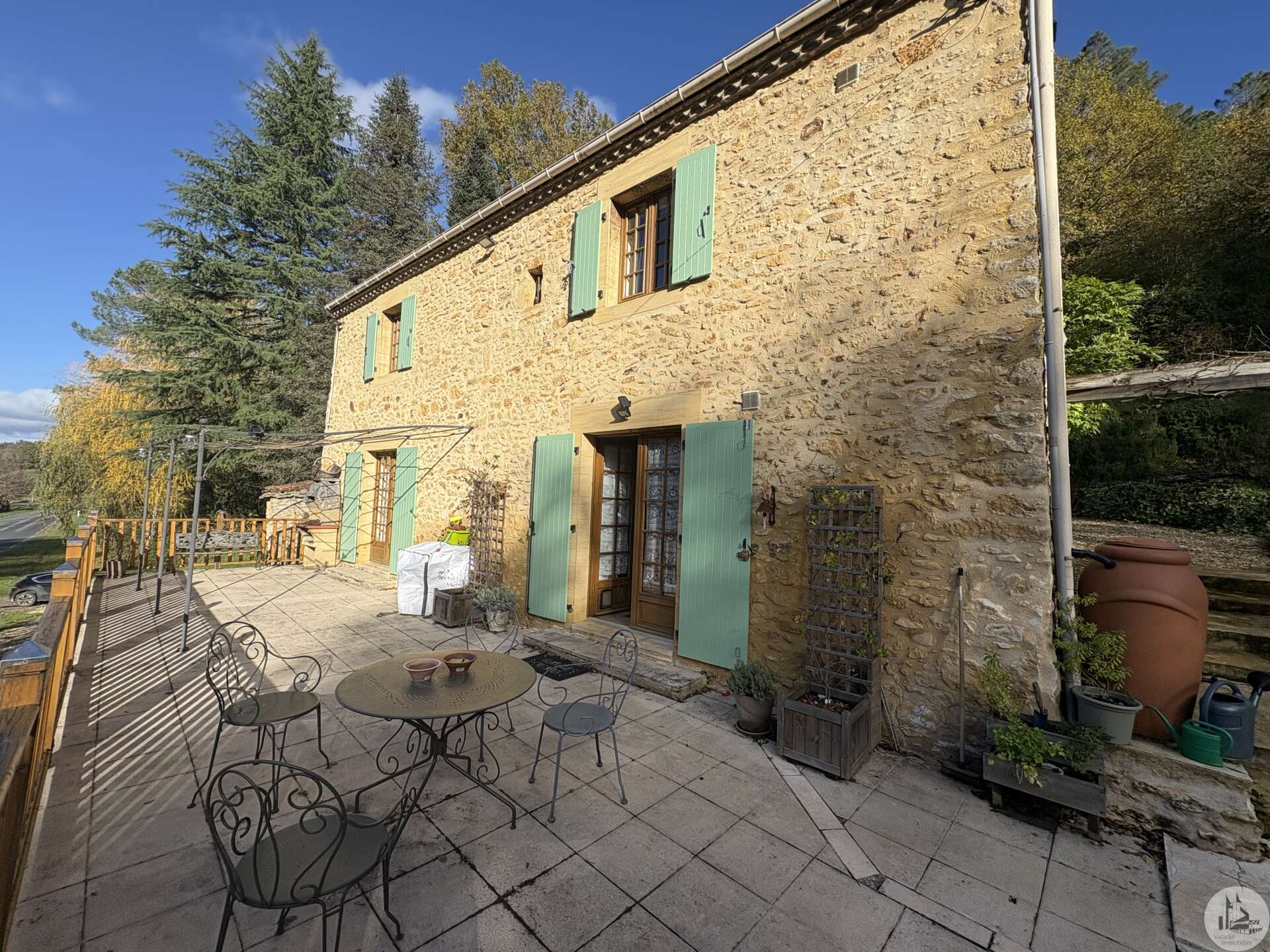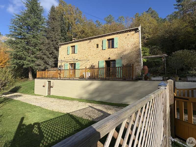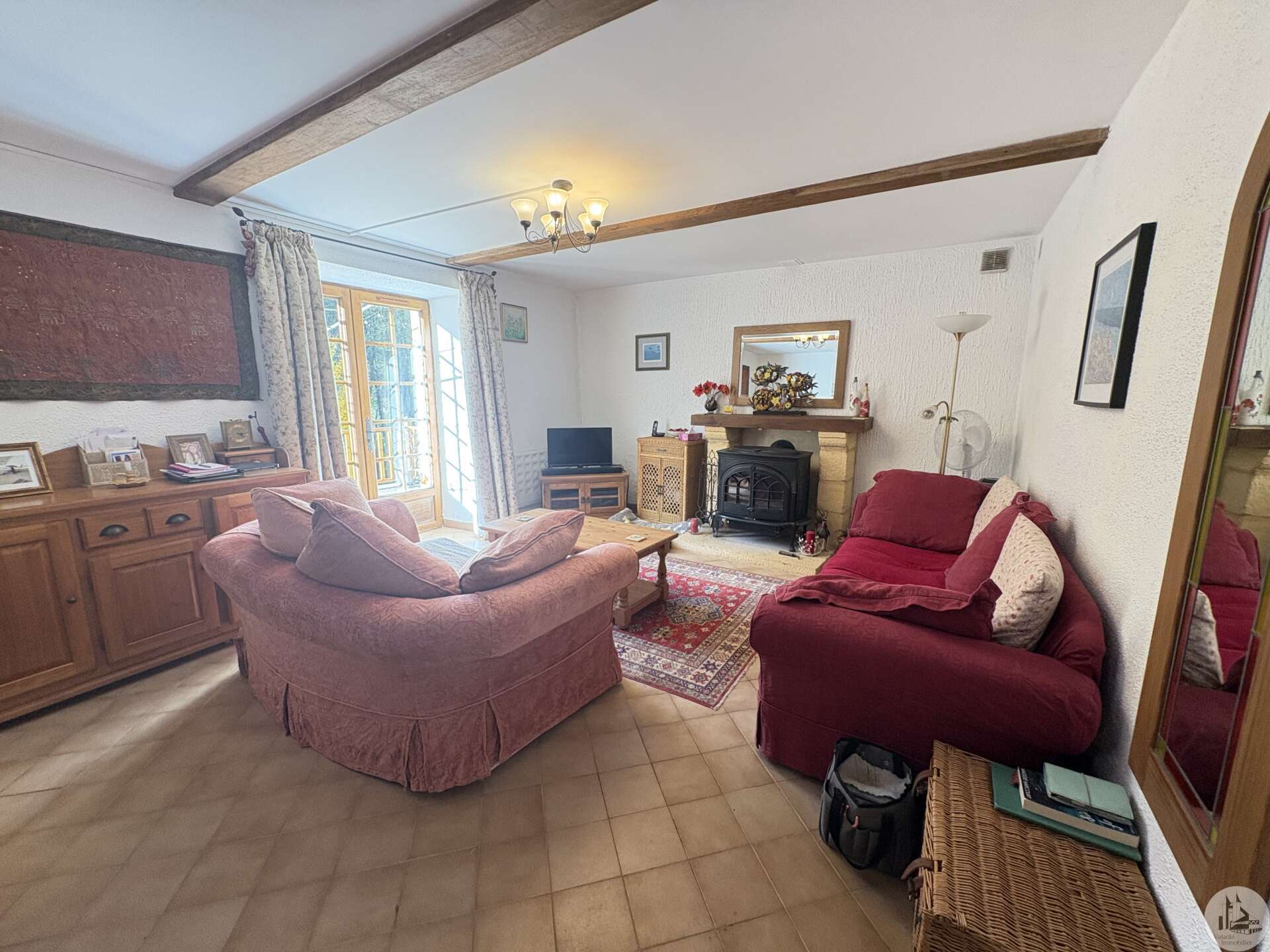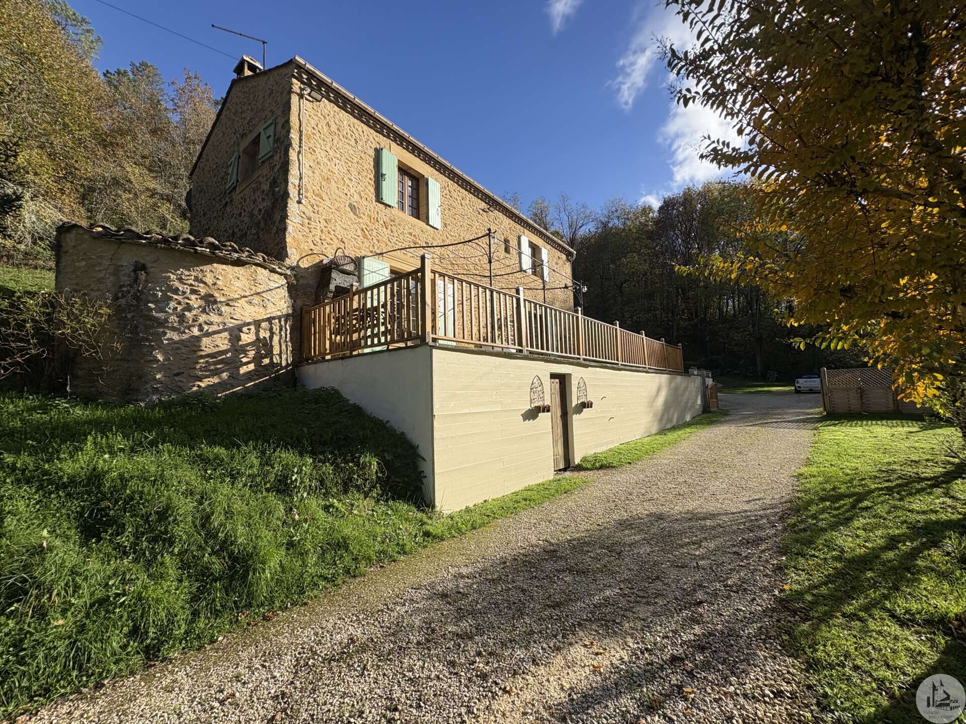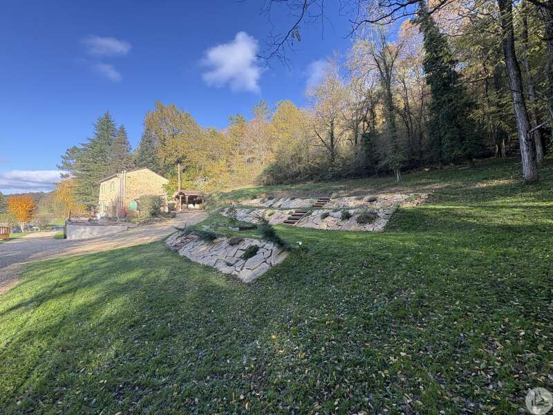 Maison en pierre de 86 m2 avec dépendances sur un terrain de 2429 m2. L'habitation se compose; Au rez de chaussée, d'une cuisine équipée/salle à manger et un salon avec poêle à bois. A l'étage, d'un palier avec deux chambres et deux salles d'eau chacune avec un toilette ainsi qu'un bureau. Les dépendances se composent, d'une cave en sous sol ainsi qu'un abri de jardin avec appentis et pièces de stockage. Le chauffage se fait par des radiateurs électriques. Les huisseries sont en double vitrage bois. A l'extérieur plusieurs terrasses donnent accès à un jardin arboré avec parking. Assainissement individuel conforme.