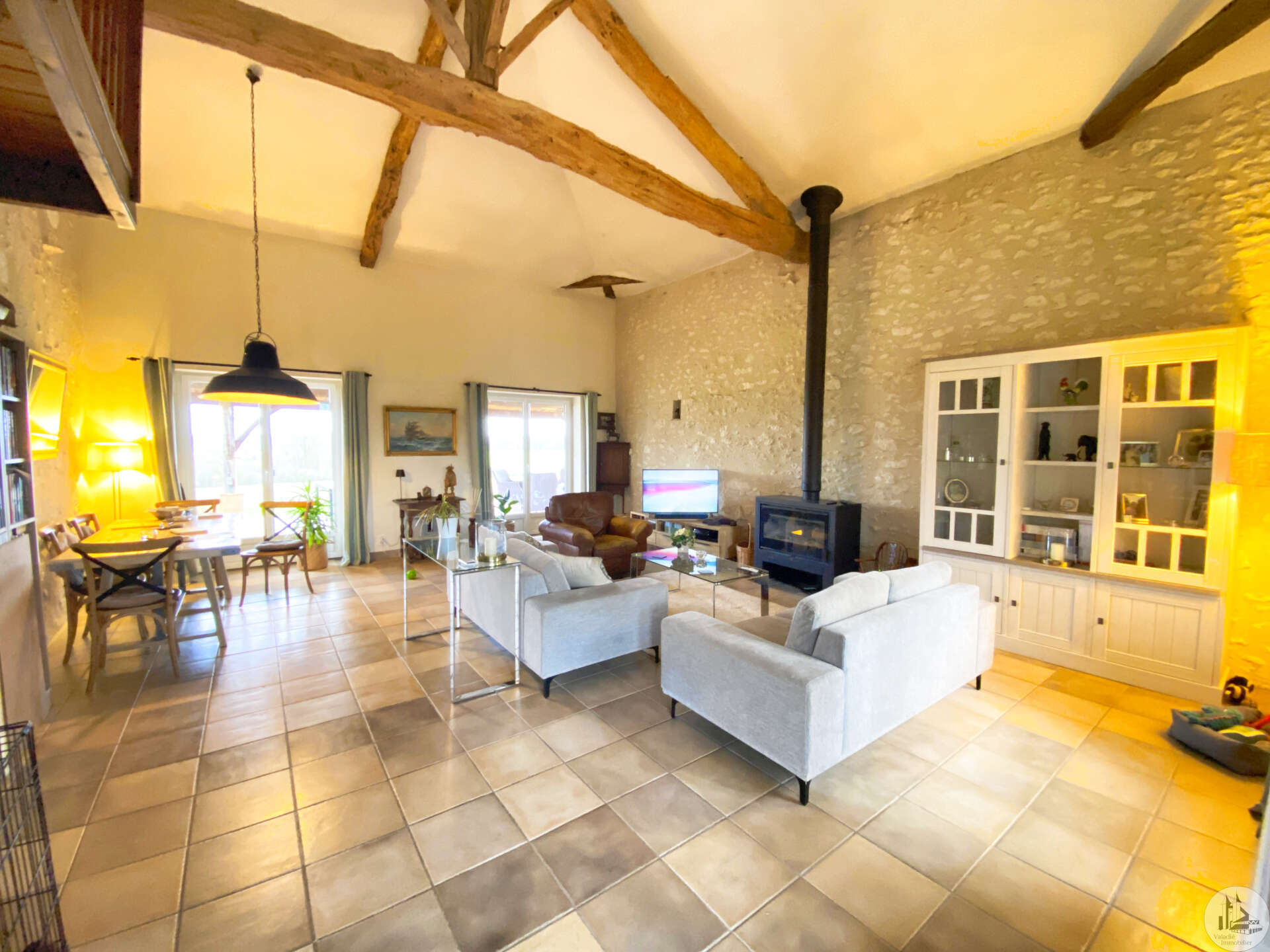 Une maison d'une surface habitable de 112 m2 environ, avec la possibilité de vivre en plain-pied, tout confort et très lumineuse, comprenant : Au rez-de-chaussée : - Une entrée sur une cuisine de 18,6 m2 environ, carrelage au sol, aménagée de placards haut et bas et placards mural, et équipée d'un piano de cuisson, une hotte aspirante, un évier, un lave-vaisselle. - Un salon de 43,5 m2 environ, carrelage au sol, belle hauteur sous plafond de 4,8 m env.; Un poele à bois a été installé en 2023, deux portes-fenêtres donnent sur la grange terrasse couverte de 50 m2 environ. - Une salle d'eau de 6,7 m2 environ, carrelage au sol, faïence aux murs, meubles vasque, un sèche-serviette, une douche à l'italienne, un wc suspendu, vmc. - Une chambre en suivant de 9,7 m2 environ, carrelage au sol, avec une longue penderie. A l'étage : - Un palier/bureau de 5,8 m2 environ, parquet au sol, un vélux. - Une chambre de 10,4 m2 environ, plancher au sol, un vélux. - Une chambre de 13,7 m2 environ avec une salle d'eau ensuite de 3,6 m2 environ (cabine de douche, lavabo). Eléments d'information : - Taxe foncière 1783 € (2025) - Chauffage par une pompe à chaleur avec radiateurs. - Menuiseries en pvc avec double vitrage et volets bois, installées en 2023. - Toiture refaite en 2020 - Assainissement non conforme. - Panneaux solaires pour l'auto-consommation de la maison. Une annexe habitable de 20 m2 au sol environ, construit en 1998, comprenant : - Une entrée sur une pièce à vivre avec kitchenette, carrelage au sol. - Une salle d'eau de 2,7 m2 environ, carrelage au sol, faïence aux murs, un wc, une douche et un lavabo. - Un placards sous l'escalier. - Une mezzanine pour une chambre. (chauffage par pompe à chaleur, menuiseries en double vitrage bois). A l'extérieur : - Une piscine (coque) construite en 2022 de 8m X 4,5m, au chlore, avec un fond plat de 1,5 m. Terrasse travertin autour. Couverture électrique. - Un car port pour deux véhicules, un lieu de stockage de 6,3 m2 environ attenant et local technique de la piscine. - Une remise/garage de 17,5 m2 environ, sol cimenté. - Un puits avec une pompe pour arroser le jardin. - Terrain de 3000 m2 environ avec un parking et un portail d'entrée.