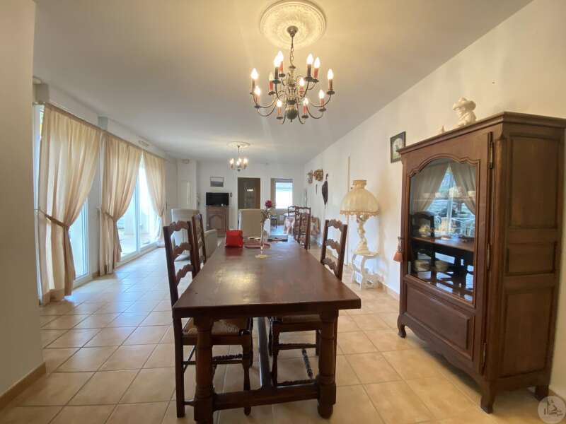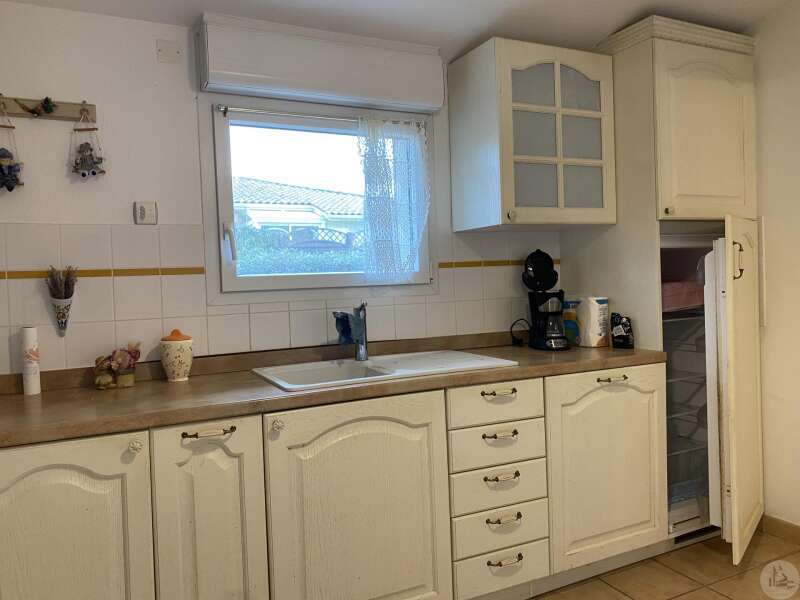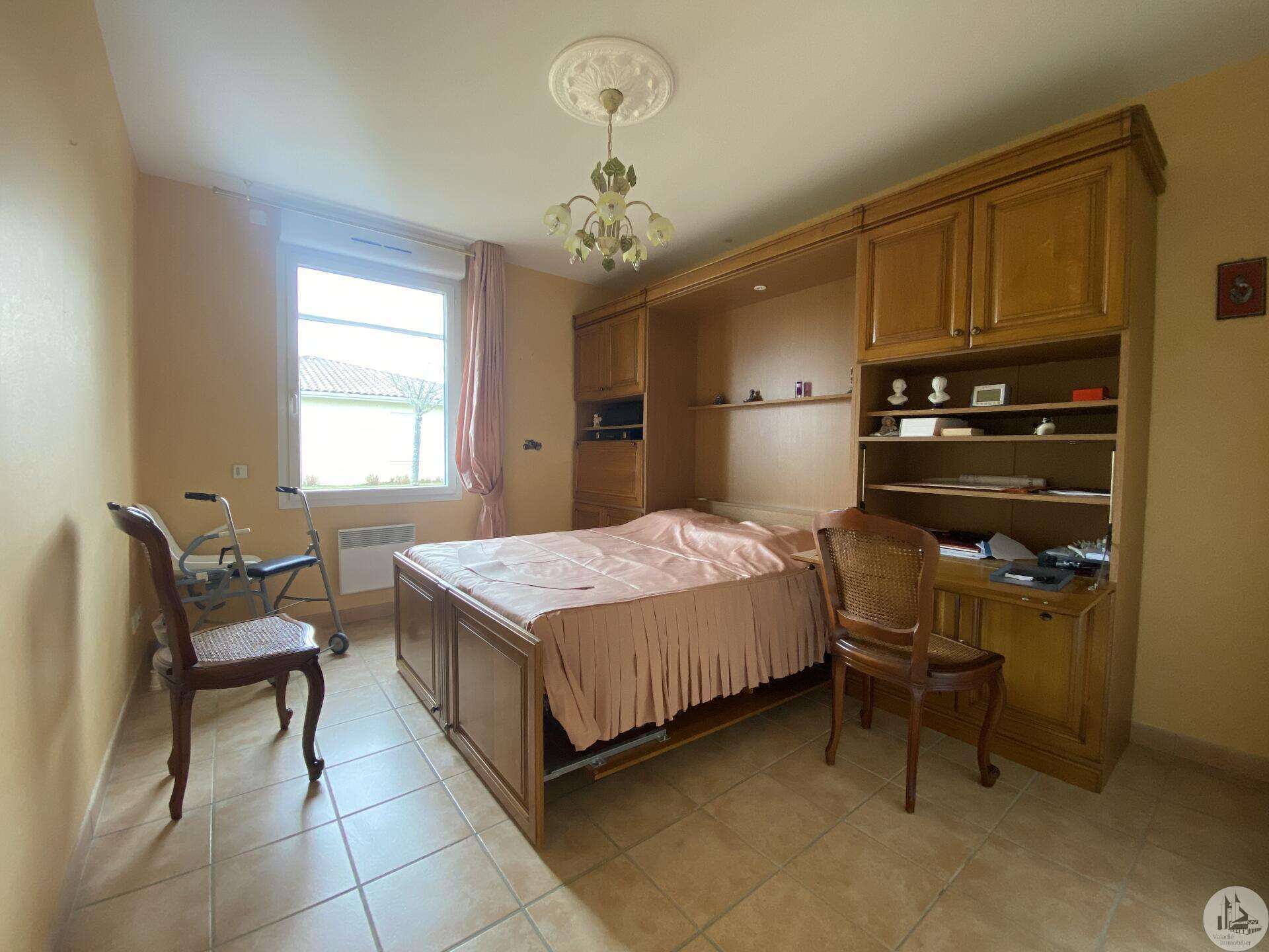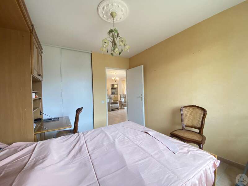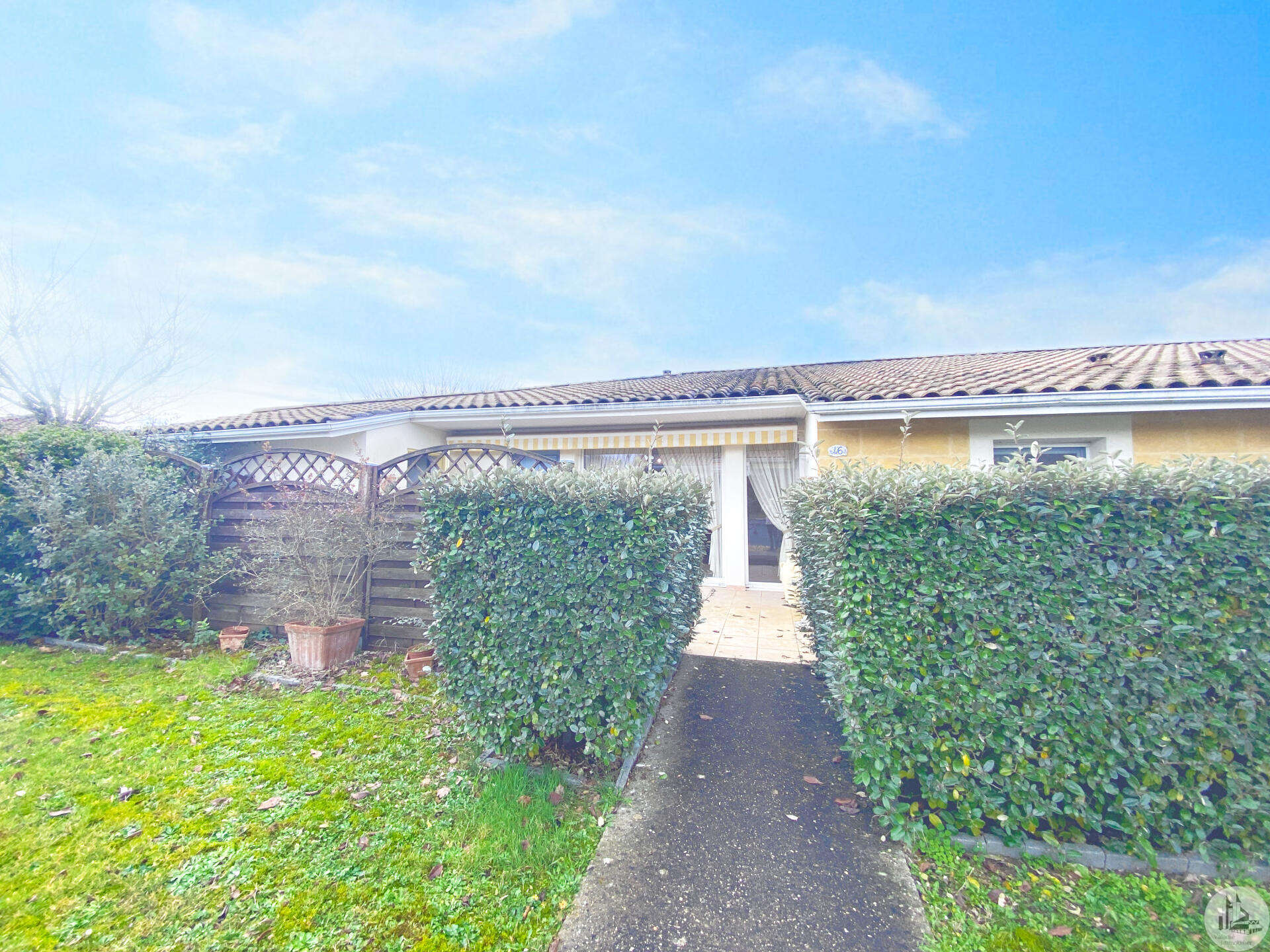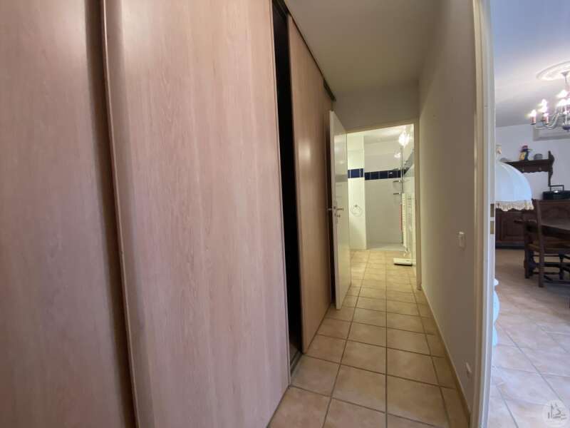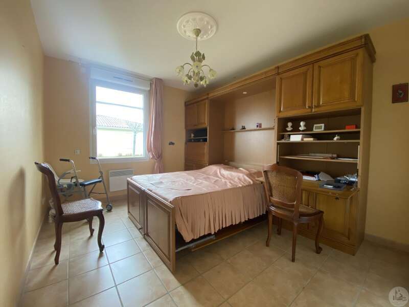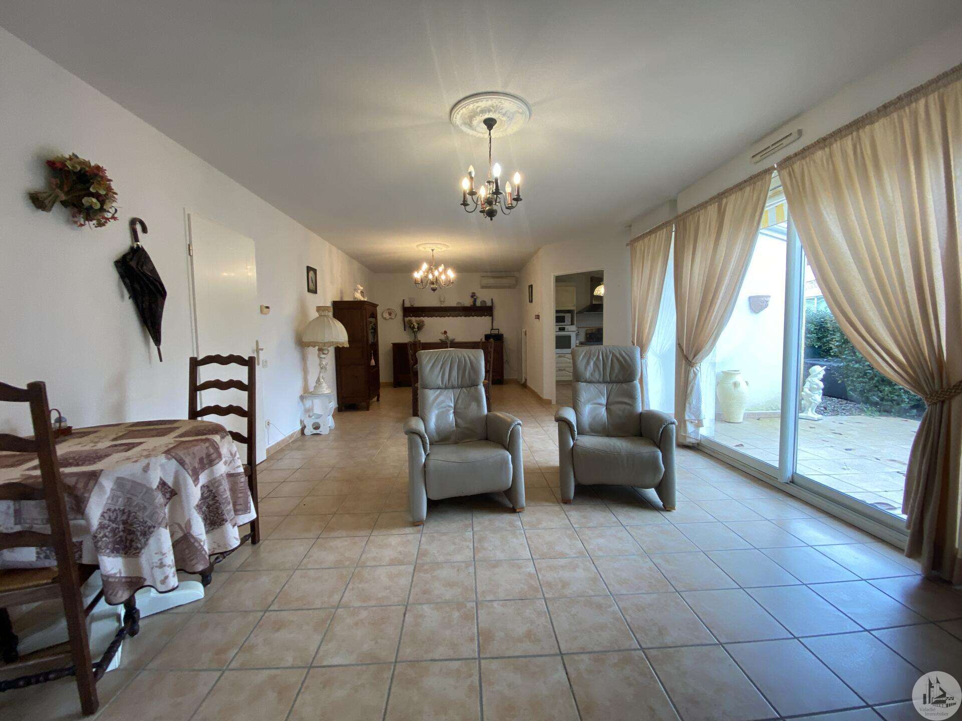 Dans une résidence réservée au Seniors, maison de plain pied d’environ 85 m2 comprenant : - séjour / salon (25,40 m2), - une cuisine ouverte (8,7 m2) aménagée de placards hauts et bas, équipée d’une plaque de cuisson, d’une hotte, réfrigérateur et lave-vaisselle intégrés et un évier. - 2 chambres (dont une avec placard) de 11,6 et 10,5 m2 - une salle de douche (double vasque et douche) de 5,2 m2 - w.c séparé avec espace pour cumulus et lave-linge - un couloir avec un dressing - un patio de 18,5 m2 - une place de parking - un cellier extérieur de 4,14 m2 (non chauffé) - une place de parking (N° 98) dans la résidence. Eléments de confort : Chauffage par climatisation réversible dans le salon et convecteurs électriques dans les chambres. - Fenêtres double vitrage PVC avec volets roulants électriques et volets bois dans les chambres. - Isolation refaite en 2015 ; chauffe-eau de 2023 ; 3 convecteurs électriques de 2013. Atouts de la copropriété : environnement sécurisé, très joli jardin bien entretenu - Un pool house, salle de réception commune, club house - Une piscine en commun pour les lots - Un gardien et une animatrice