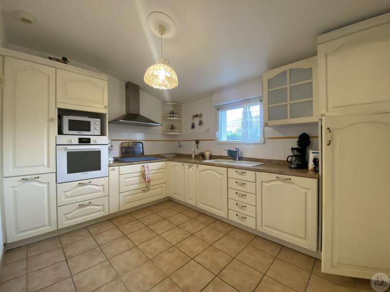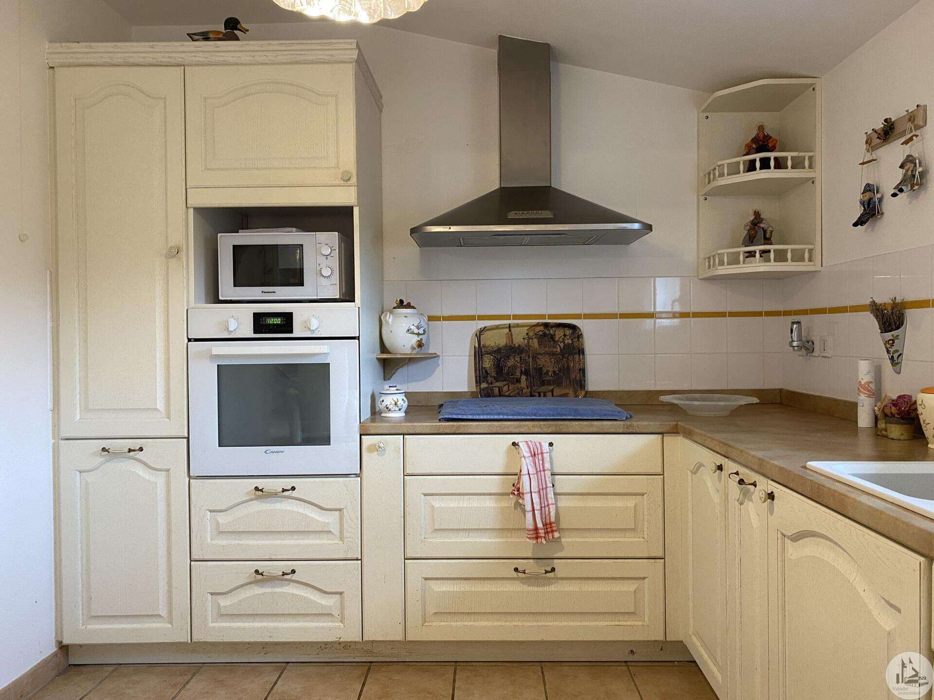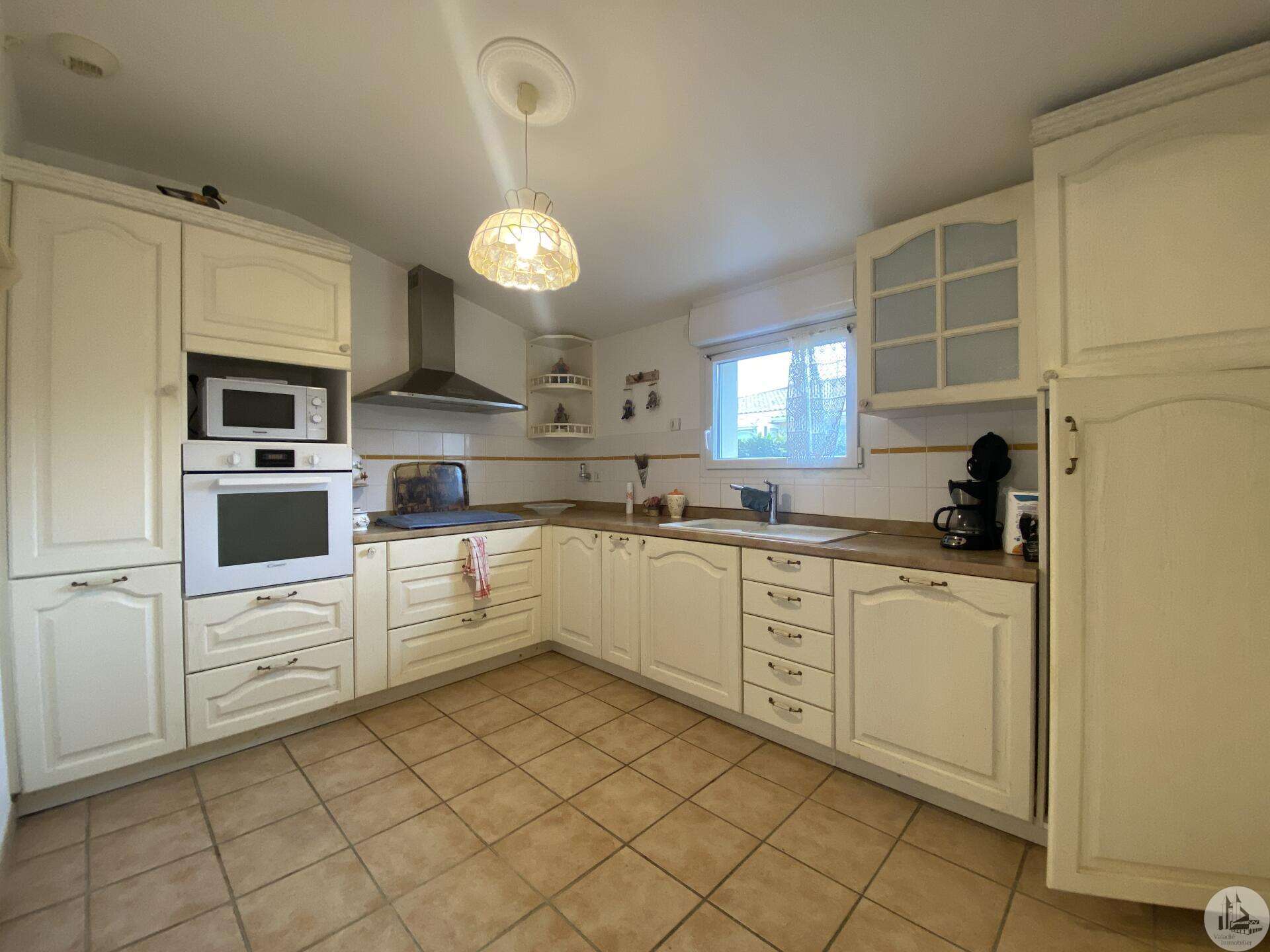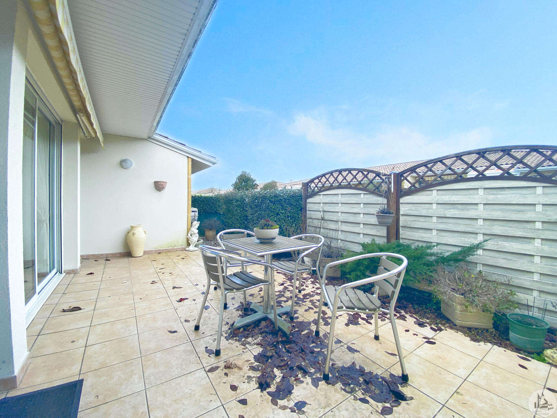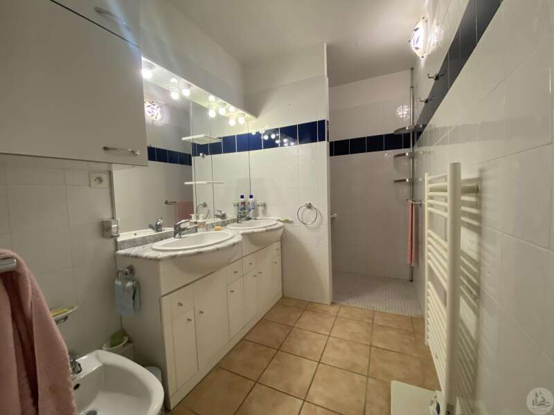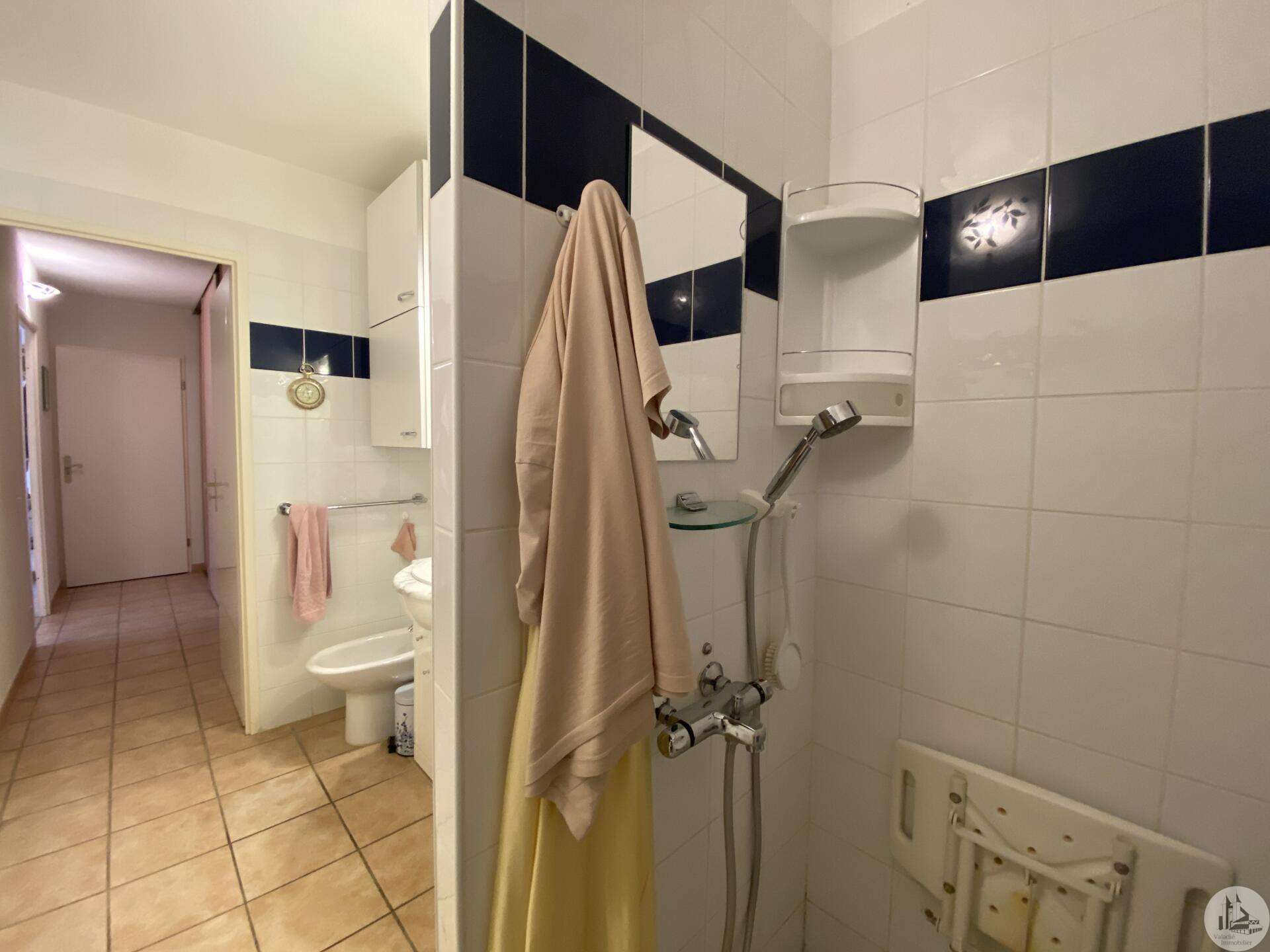 Dans une résidence réservée au Seniors, maison de plain pied d’environ 85 m2 comprenant : - séjour / salon (25,40 m2), - une cuisine ouverte (8,7 m2) aménagée de placards hauts et bas, équipée d’une plaque de cuisson, d’une hotte, réfrigérateur et lave-vaisselle intégrés et un évier. - 2 chambres (dont une avec placard) de 11,6 et 10,5 m2 - une salle de douche (double vasque et douche) de 5,2 m2 - w.c séparé avec espace pour cumulus et lave-linge - un couloir avec un dressing - un patio de 18,5 m2 - une place de parking - un cellier extérieur de 4,14 m2 (non chauffé) - une place de parking (N° 98) dans la résidence. Eléments de confort : Chauffage par climatisation réversible dans le salon et convecteurs électriques dans les chambres. - Fenêtres double vitrage PVC avec volets roulants électriques et volets bois dans les chambres. - Isolation refaite en 2015 ; chauffe-eau de 2023 ; 3 convecteurs électriques de 2013. Atouts de la copropriété : environnement sécurisé, très joli jardin bien entretenu - Un pool house, salle de réception commune, club house - Une piscine en commun pour les lots - Un gardien et une animatrice