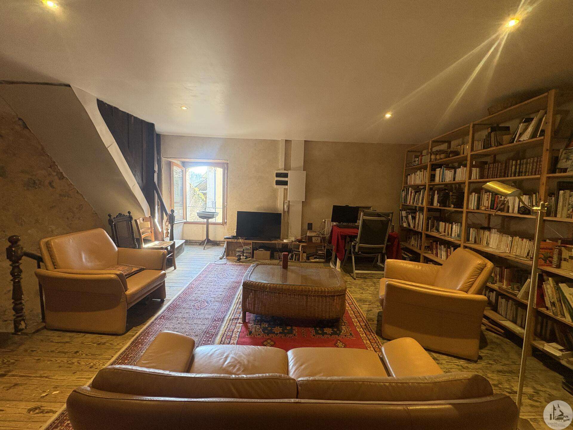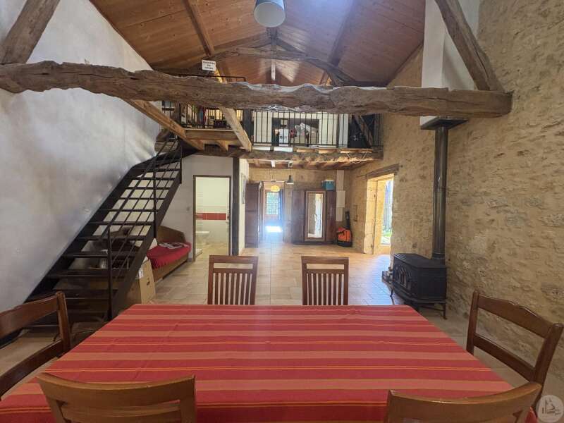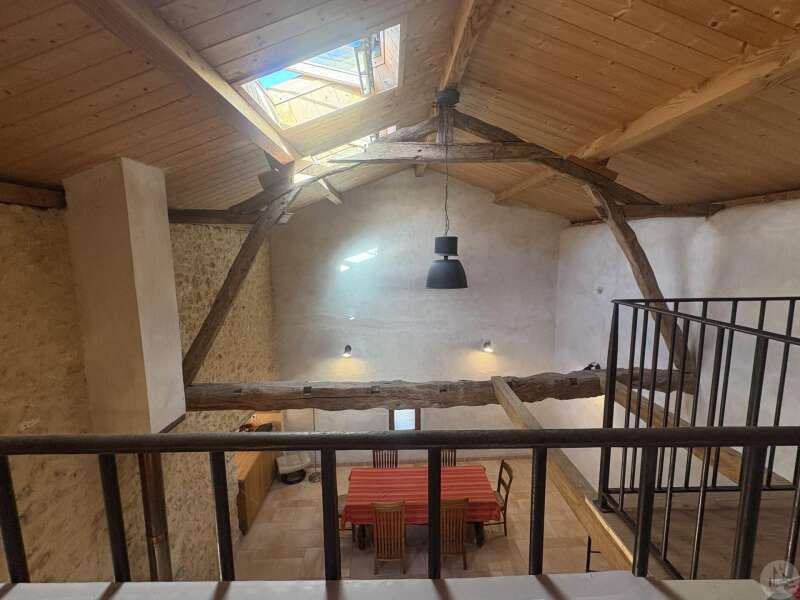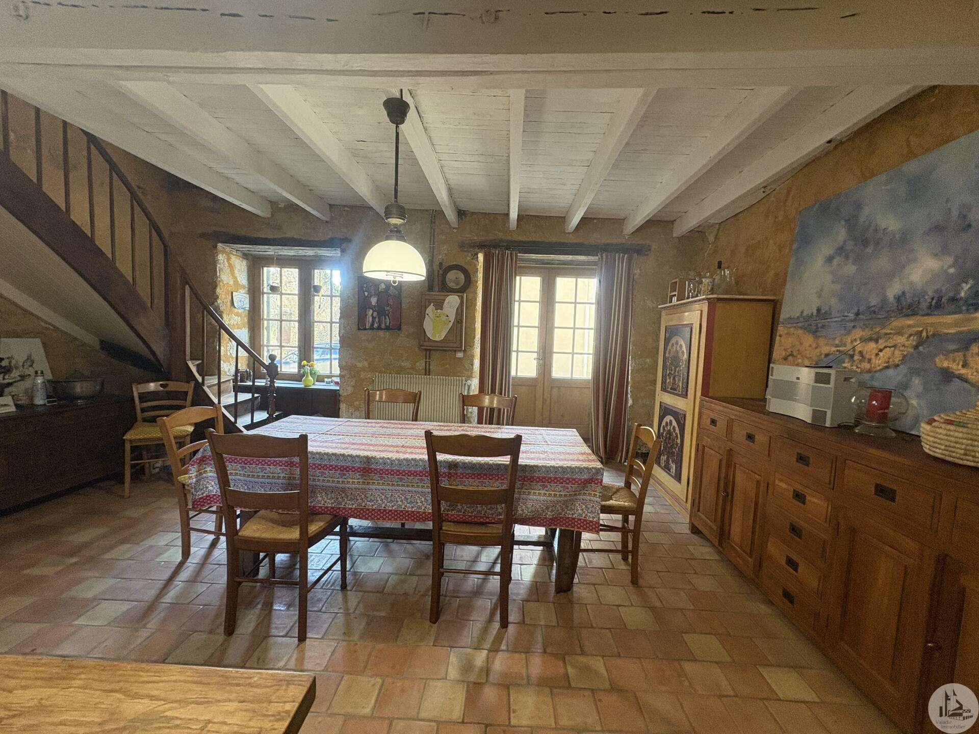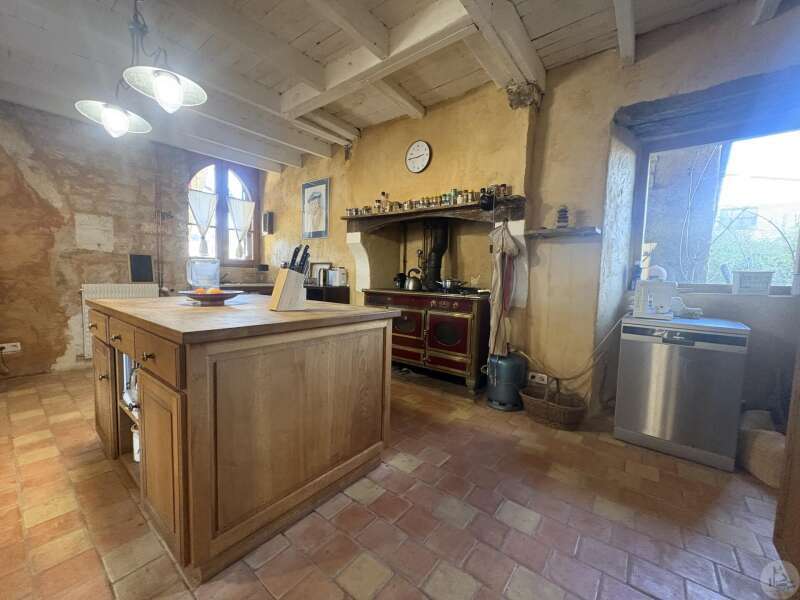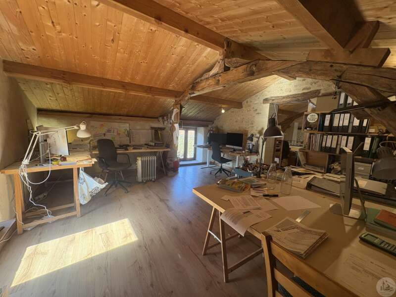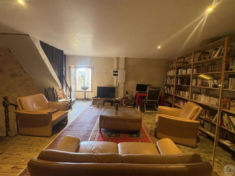 Ensemble immobilier en pierre composé de deux maisons pour un total d'environ 342 m2 sur une parcelle de 449 m2. La maison principale, d'environ 194 m2 se compose; Au rez de chaussée, d'une entrée traversante donnant sur la pièce principale avec cuisine/salle à manger équipée d’un piano, une chambre et une salle d'eau avec toilette. A l'étage, d'un salon, deux chambres, une salle d'eau avec toilette et un bureau. Au second, d'un grenier de la surface totale de la maison. Au sous sol, d'une cave, une pièce de stockage et une chaufferie avec chaudière à pellets. Les huisseries sont en double vitrage bois. La maison secondaire, d'environ 148 m2 se compose; Au rez de chaussée, d'une entrée avec véranda, une pièce principale salon/salle à manger avec plafonds cathédrales et poêle à bois, une cuisine semi ouverte ainsi qu'une suite avec salle d'eau et toilettes, et une chambre et une deuxième salle d'eau avec toilettes. A l'étage : un palier et une chambre mansardée. Chauffage électrique. Huisseries en métal et en bois double vitrage. A l'extérieur, un jardin de curé ou se trouve une terrasse abritée par un appentis et d'anciennes porcheries transformées en pièces de stockage. Vente possible seulement à partir de Décembre 2026.