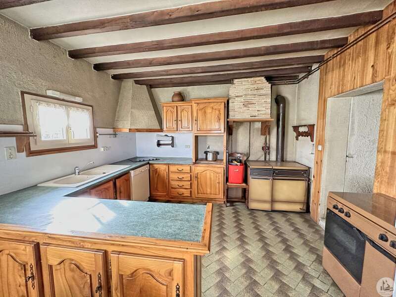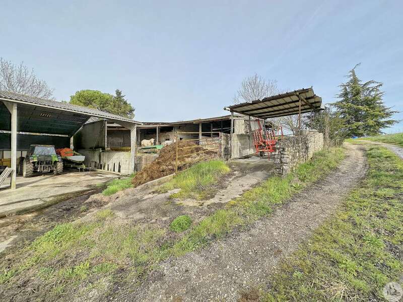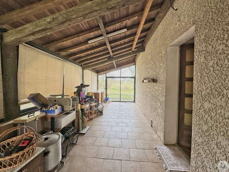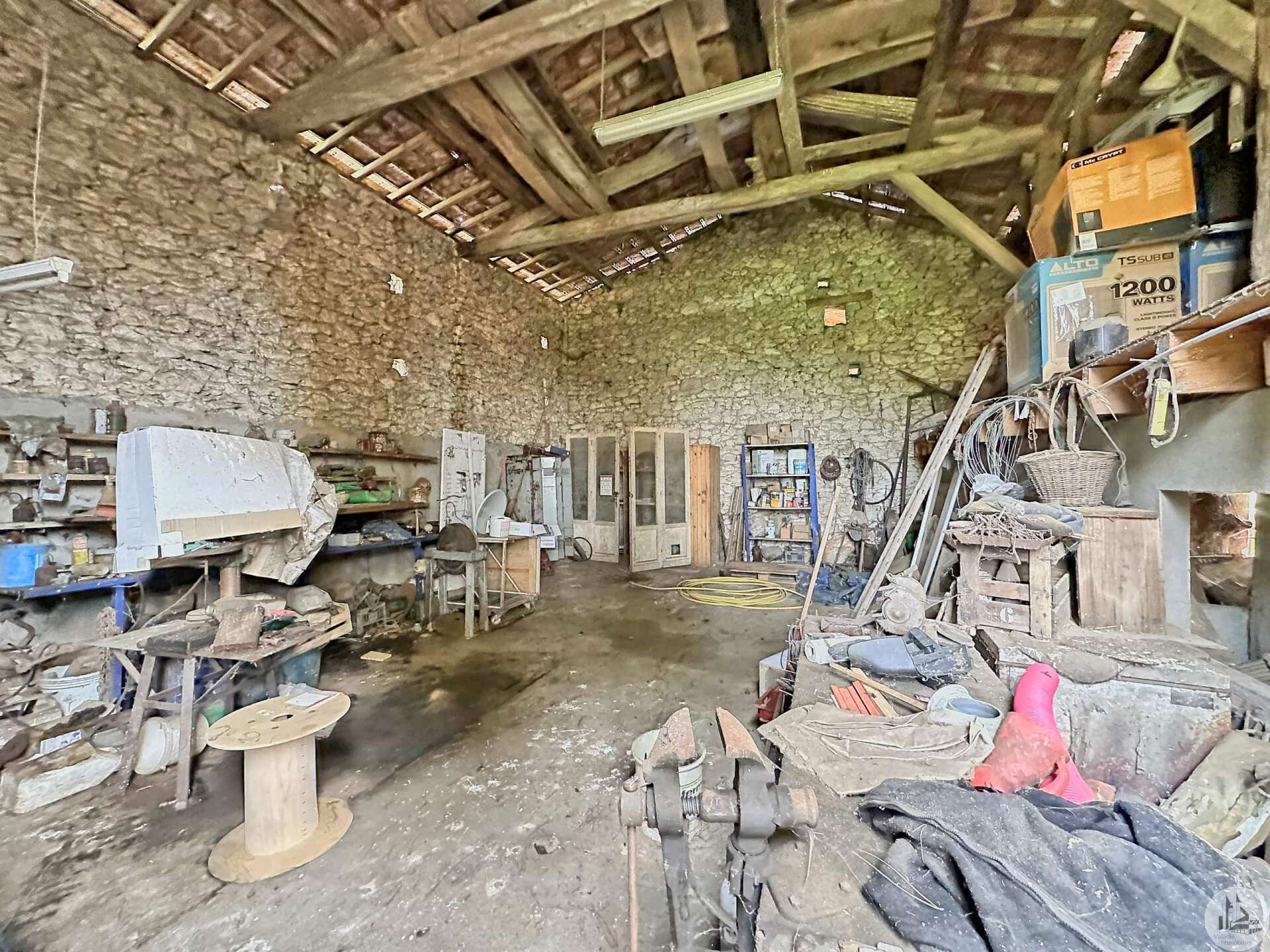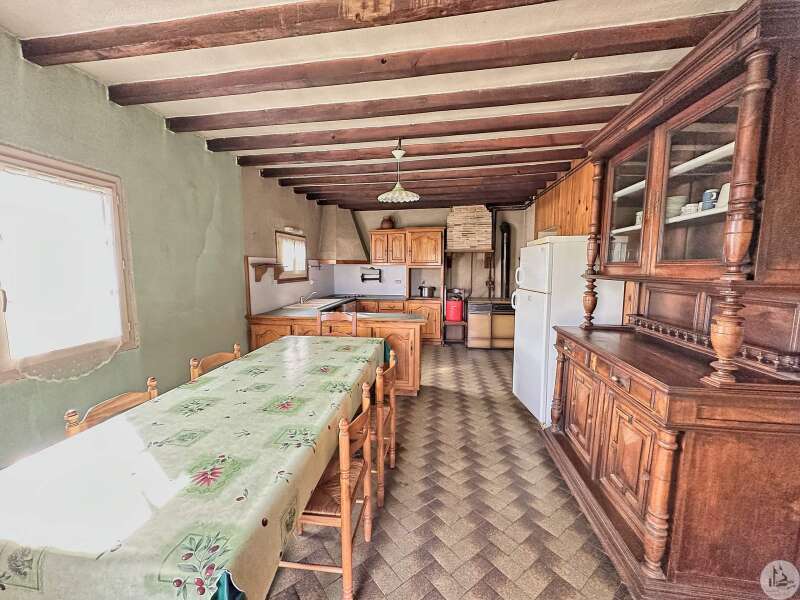 Maison d'habitation en pierres comprenant : Au rez-de-chaussée : - cuisine avec coin repas, - salon/salle à manger avec cheminée ouverte, véranda, - dégagement desservant : - 2 chambres, - douche, - wc indépendants. A l'étage : - pallier, - 4 chambres avec placards, - salle de bains avec wc. Chauffage bois (cuisinière raccordée à certains radiateurs du bas) et électrique (vétuste). Abris ouvert, grange, deux hangars ouverts. Box à chevaux.