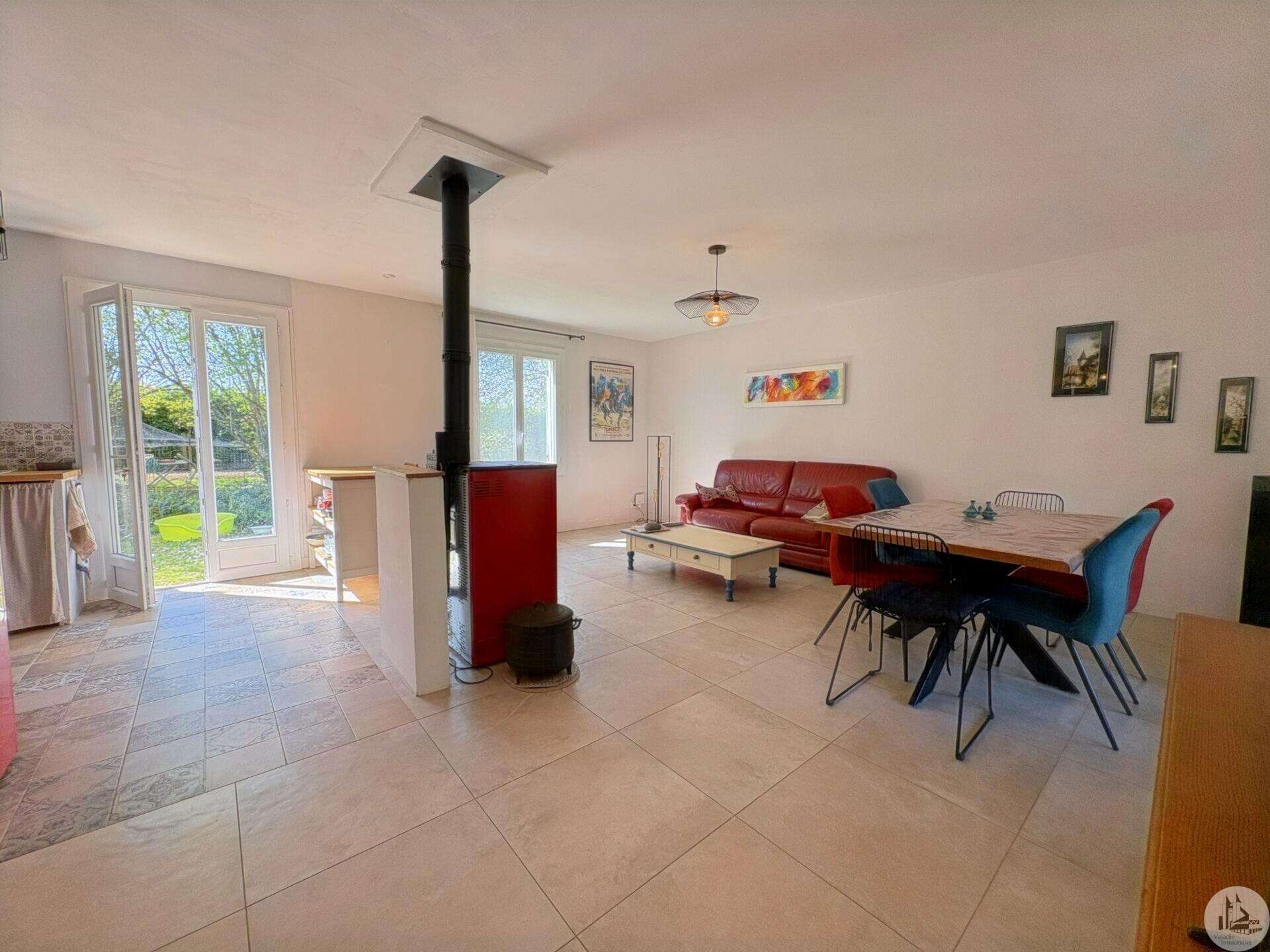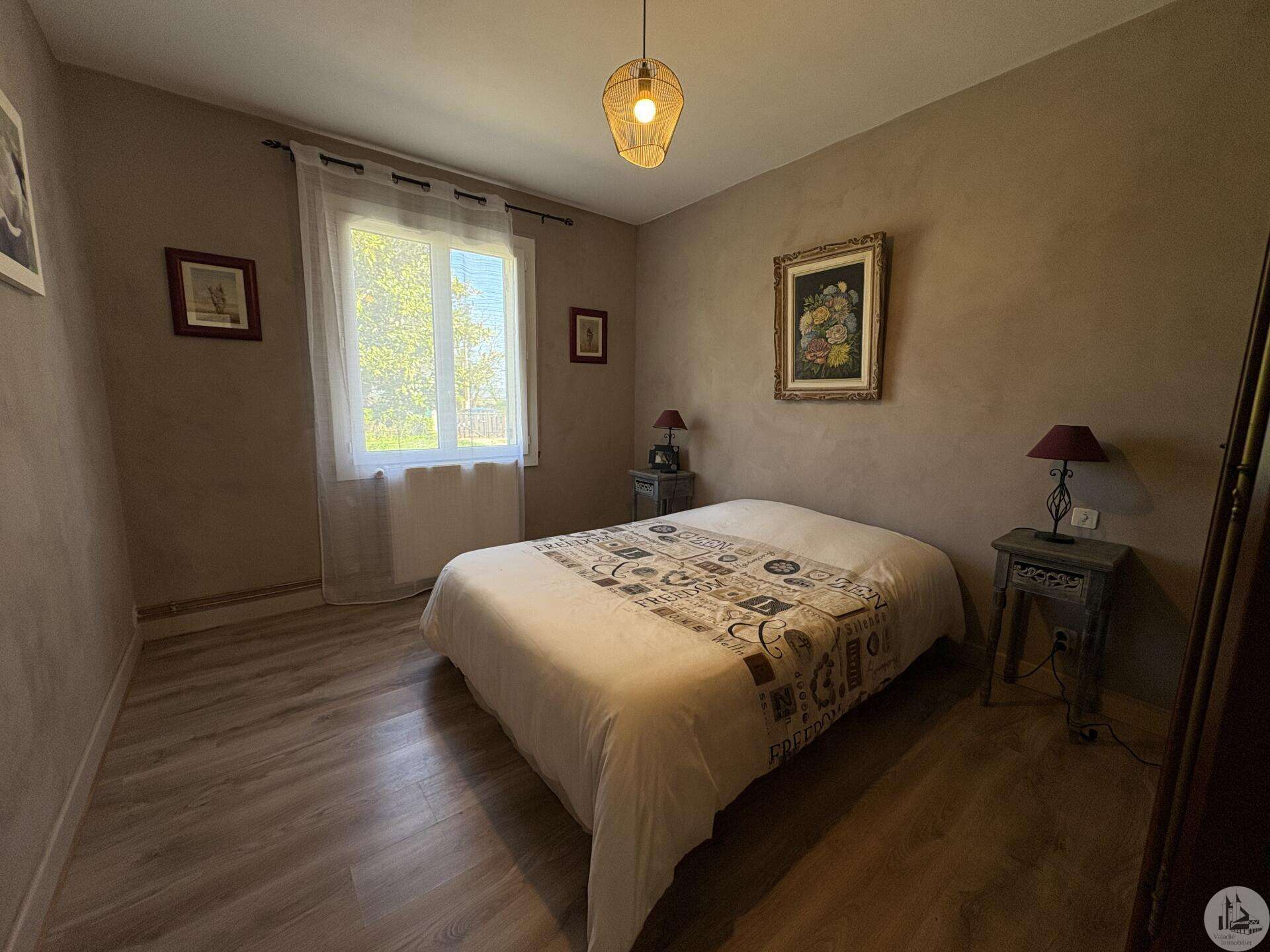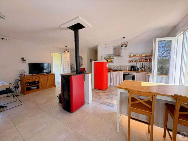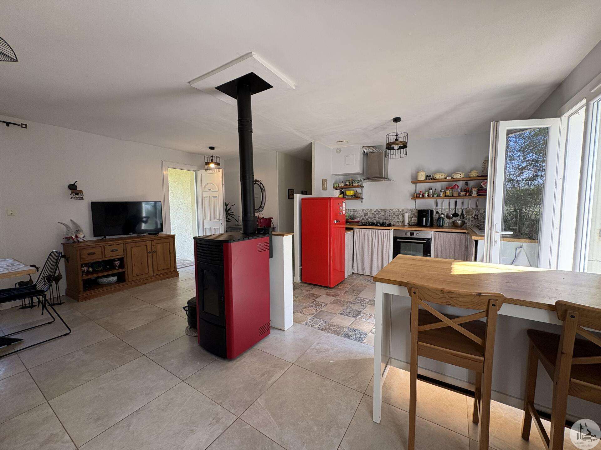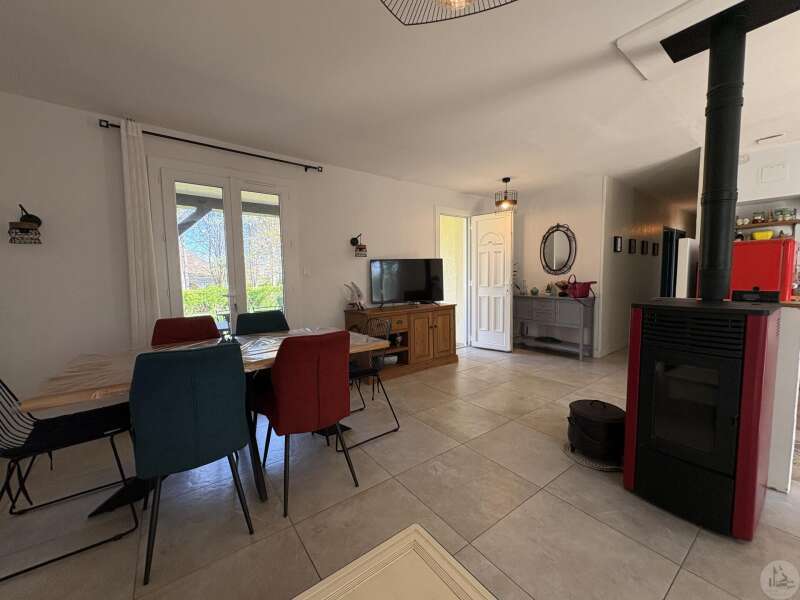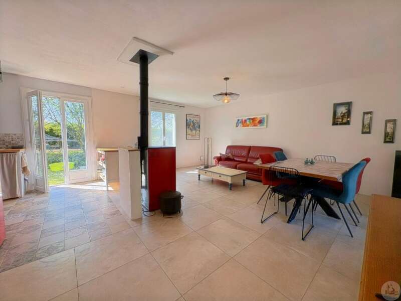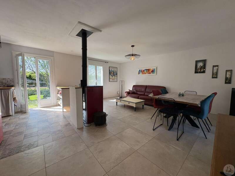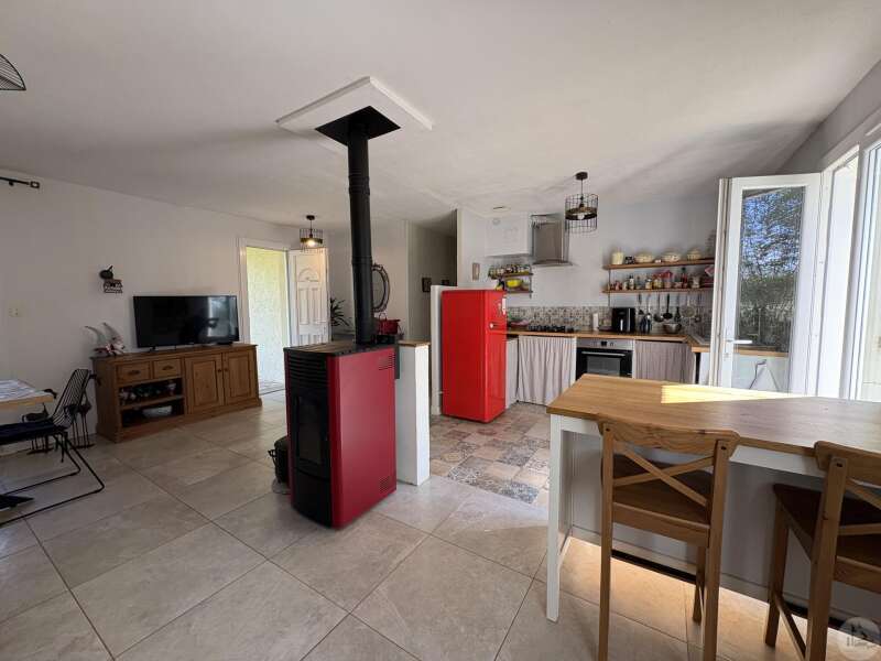 Maison de plain pied construite en 1975 avec dépendance sur un terrain de 3450 M2. L'habitation d'environ 104 M2 se compose; D'une pièce principale avec cuisine ouverte sur salon/salle à manger d'environ 39 M2 équipée d'un poêle à granulés, trois chambres, une salle d'eau, un toilette séparé et une pièce annexe (éventuelle quatrième chambre). En continuité une pièce utilisée comme buanderie et chaufferie. Les huisseries sont en double vitrage PVC. Chauffage au gaz avec citerne entérrée. Un bâtiment séparé avec un atelier et une remise. A l'extérieur, une terrasse abritée donnant sur un jardin arboré plat et clos avec espace de stationnement. Assainissement individuel.