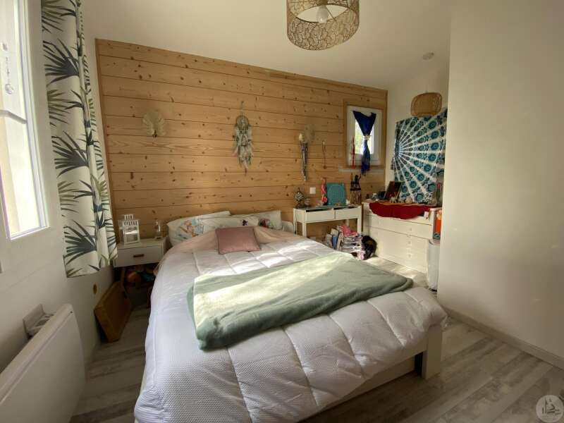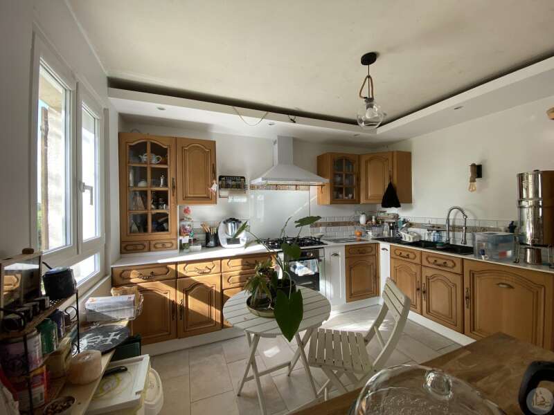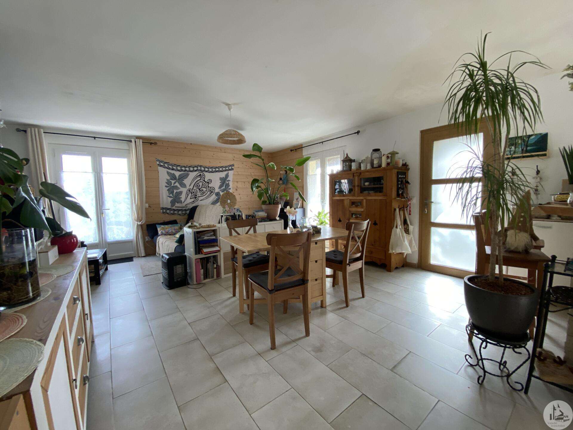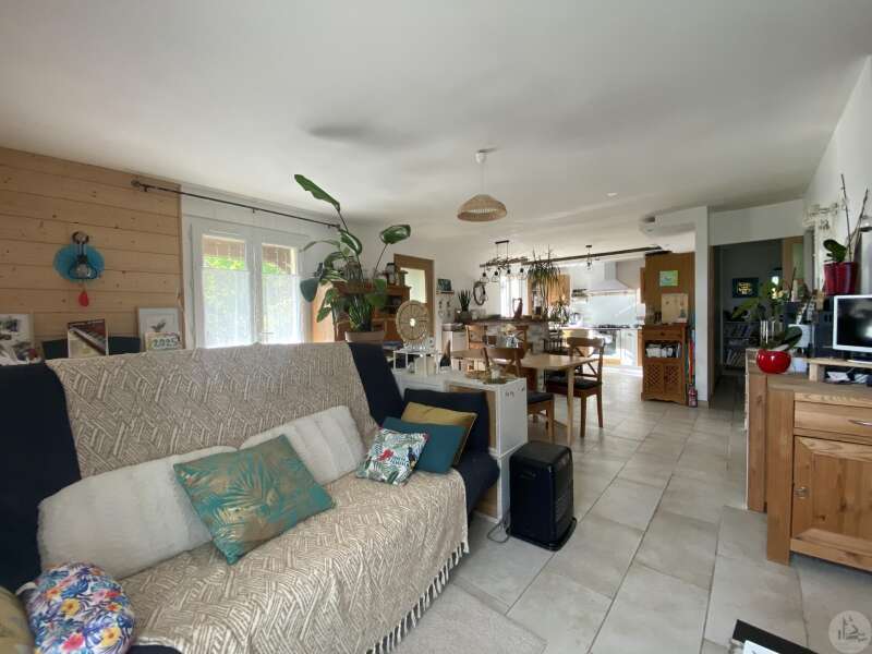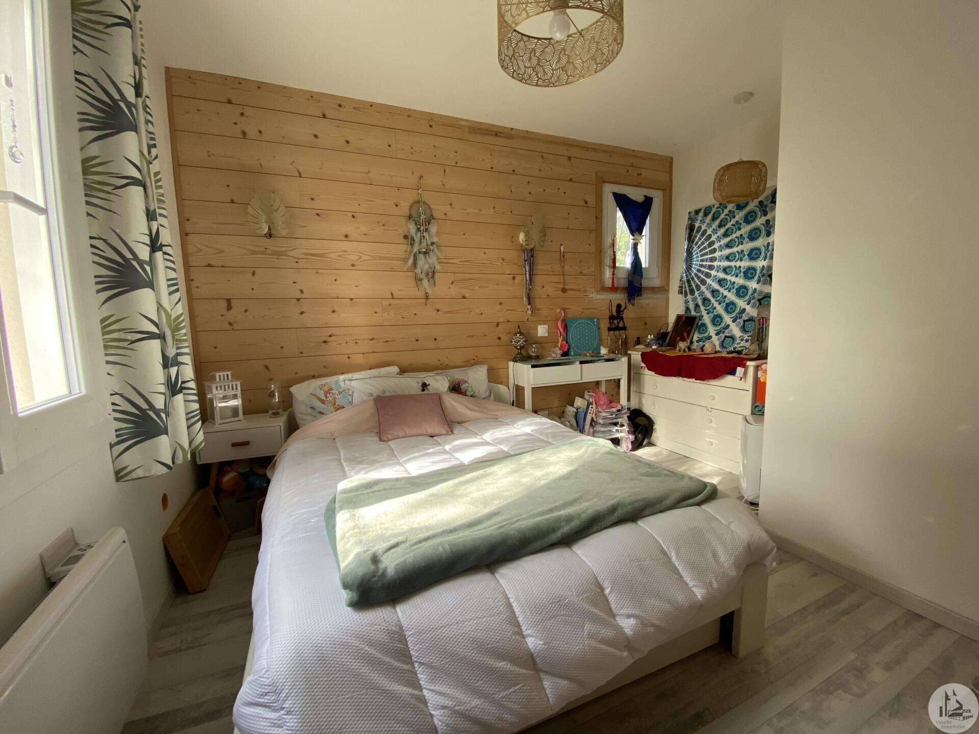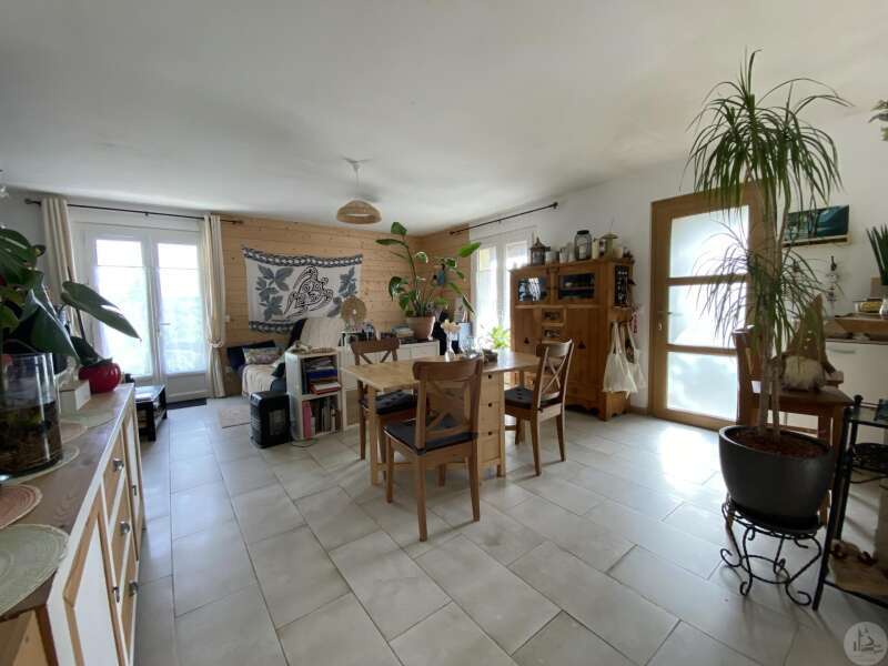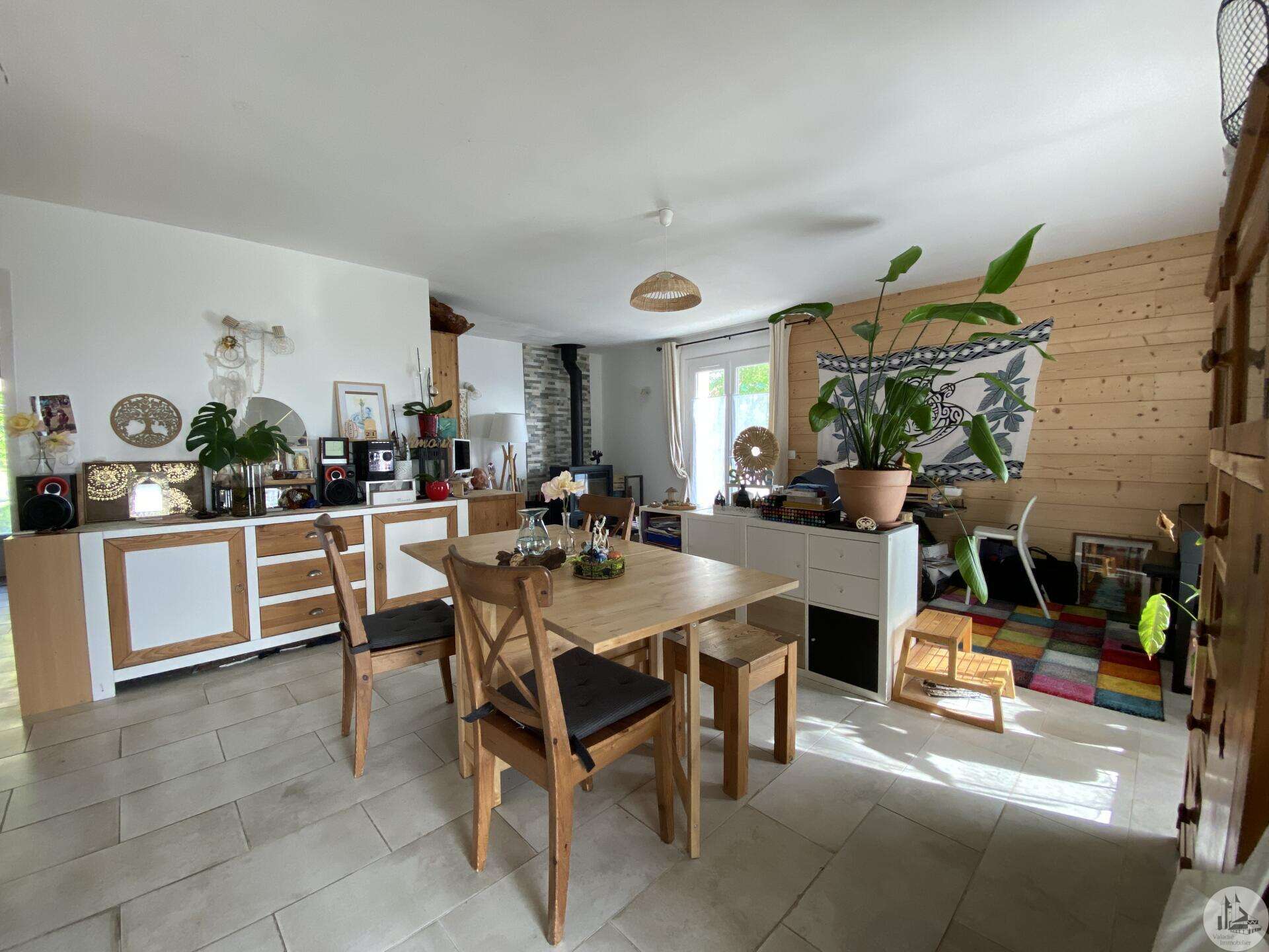 Maison de plain-pied récemment modernisée comprenant : cuisine (11,3 m2) ouverte sur salon/séjour (31,5 m2) avec poêle à bois, couloir (4,6 m2) distribuant 3 chambres (11,1 ; 9,5 et 9,3 m2) et une salle de bain - 4,1 m2 - (2 vasques, baignoire et sèche-serviette), un w.c. Une pièce à finir d'aménager (10,4 m2), une buanderie/cellier (5,4 m2) et l'ancien garage converti en chambre indépendante (13,6 m2) Ces 3 dernières pièces pourraient être aménagées pour y réaliser un studio indépendant ou recevoir du public (profession libérale par exemple) Chauffage par convecteurs électriques et poêle à bois (ce dernier chauffe toute la maison actuellement) Fenêtres en PVC double vitrage. Isolations des murs et du plafond refaites. Drains installés tout autour de la maison afin de l'assainir. Dépendance d'environ 15 m2. Jardin arboré, clôturé avec portail et portillon. Belle vue dominante.
