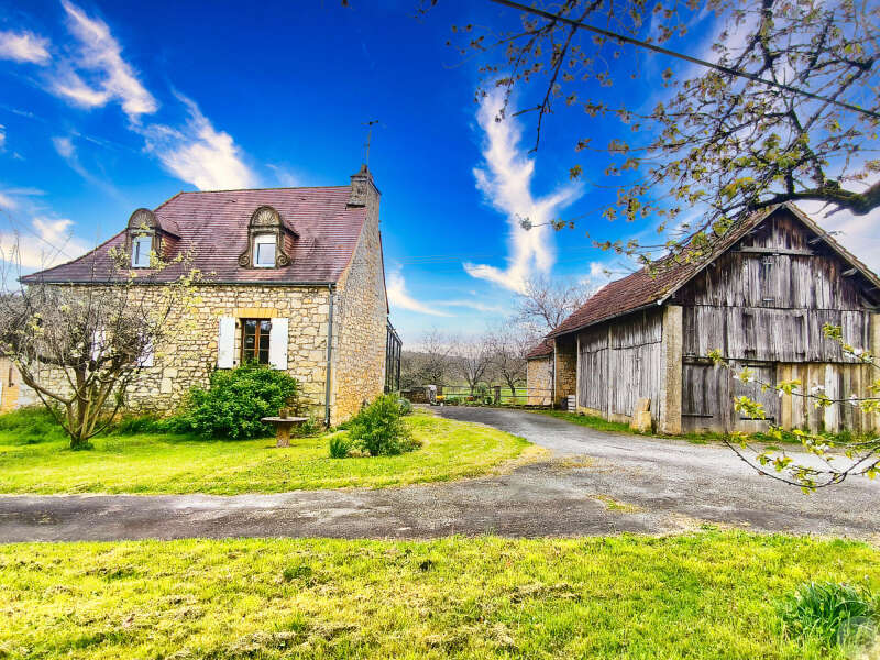 Au sud de Sarlat, à 5 minutes d'un village avec école et tous commerces, ensemble composé d'une maison d'habitation avec 3 chambres, une Grange/séchoir à tabac, et une dépendance en pierre à restaurer.