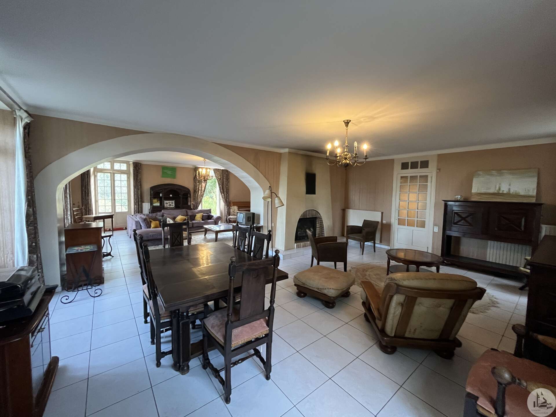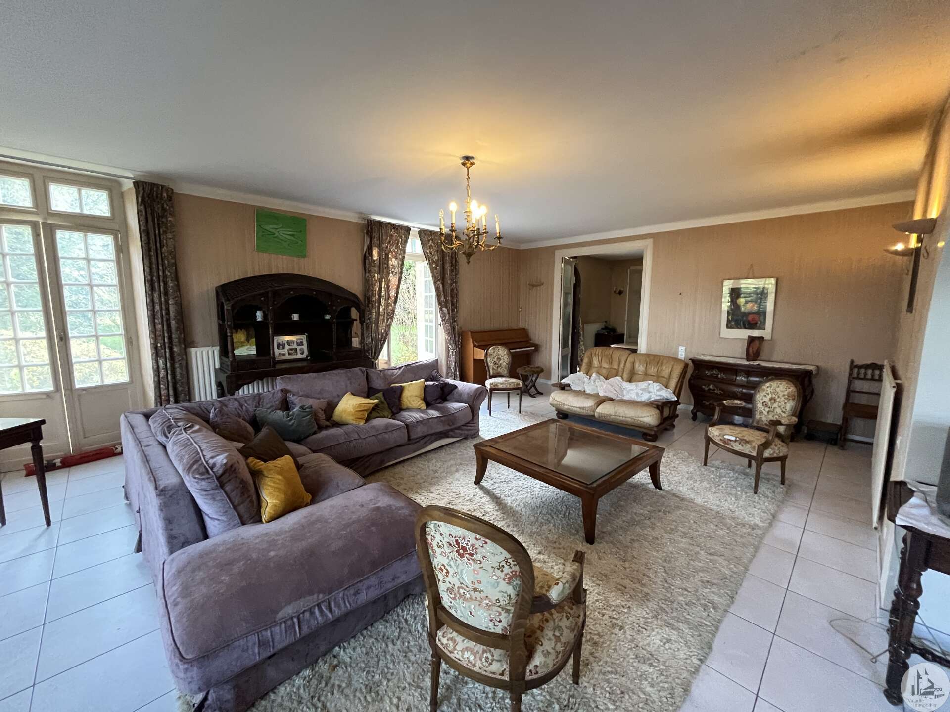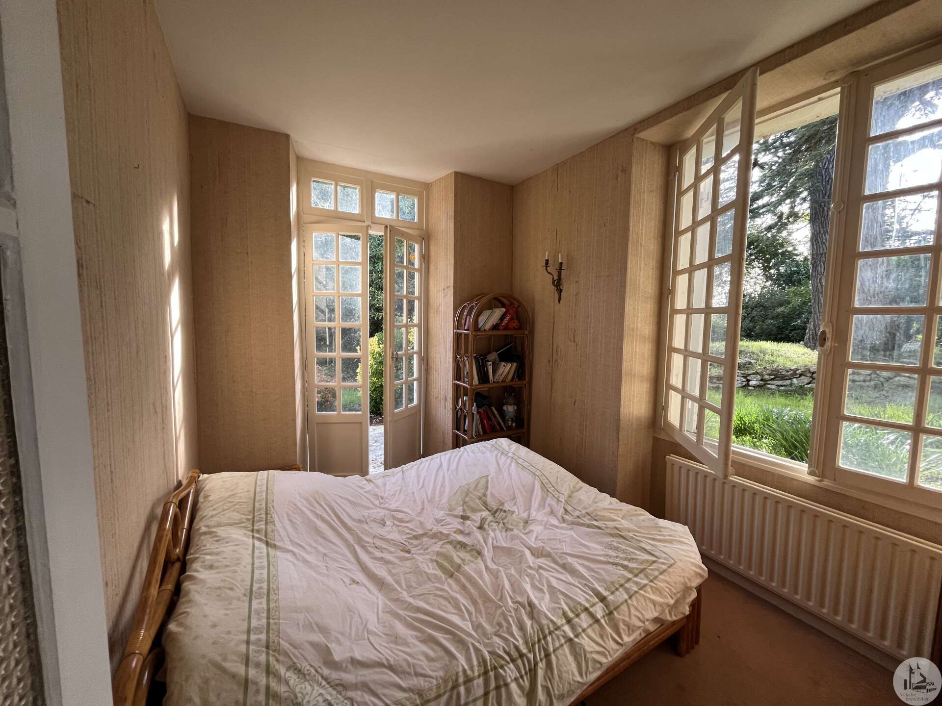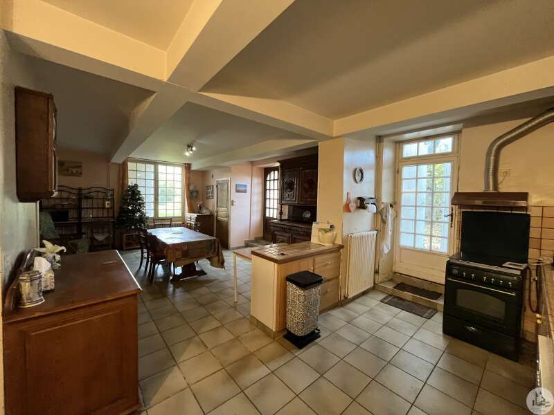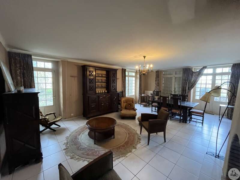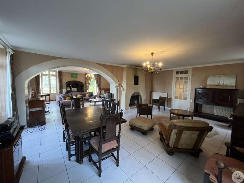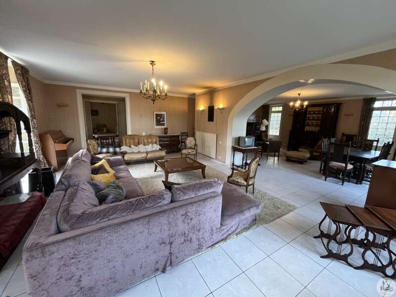 Een herenhuis met een moderne uitbouw, bestaande uit: - Een hal van circa 21,2 m² met tegelvloer en een prachtige houten trap naar de bovenverdieping. Vanuit deze hal, rechts: - Een L-vormige woon-/eetkamer van circa 77 m² met 6 openslaande deuren, tegelvloer, een open haard met inzethaard en behangen wanden. - Een berging van circa 3 m² met linoleumvloer. - Een woonkeuken van circa 42 m² met een deur naar buiten. De keuken is voorzien van een spoelbak en inbouwkasten. - Een hal van circa 10,7 m² met tegelvloer en inbouwkasten. - Een hal van circa 3 m² met een spoelbak en een apart toilet. - Een doucheruimte in restauratie van circa 9,3 m² met een openslaande deur, laminaatvloer en tegelvloer. - Een kantoor van circa 12,6 m² met vloerbedekking, een openslaande deur en behangen muren. Boven: - Een overloop van circa 21 m² met een trappenhuis, een massief parketvloer en een openslaande deur naar een balkon. Verder naar rechts: - Een slaapkamer van circa 19,5 m² met vloerbedekking, een decoratieve open haard, een raam en een kast. - Een slaapkamer met badkamer en suite, eveneens toegankelijk via een gang, van circa 15,5 m² met vloerbedekking en twee ramen. - Een gang van circa 2,6 m² met tegelvloer. - Een badkamer van circa 14,5 m² met tegelvloer, betegelde muren en op sommige plaatsen licht afgebladerd behang. Een wastafel, een bad, een toilet, een bidet en twee ramen met dubbel glas. - Een apart toilet. - Een slaapkamer van circa 14,9 m² met vloerbedekking, een kast, twee ramen, een wastafel en behangen muren. - Een linnenkamer van circa 5,4 m² met parketvloer. - Een doorgang van circa 12,8 m² met parketvloer. - Een slaapkamer van circa 15,5 m² met parketvloer en enkel glas, met een eigen badkamer met douche. - Een slaapkamer van circa 17,6 m² met vloerbedekking en dezelfde eigen badkamer met douche. Wastafel, douchecabine, linoleumvloer en tegelvloer (circa 3,7 m²). - Een slaapkamer van circa 21,6 m², inbouwkasten, twee ramen met enkel glas en vloerbedekking. - Een woonkamer van circa 31,4 m², parketvloer, drie ramen met enkel glas, een marmeren open haard met lijstwerk en plafondlampen met lijstwerk. Een tweede verdieping met toegang tot: - Een zolder over de gehele oppervlakte van het huis (circa 171 m², parketvloer). - Een dakterras op het noordoosten. Centrale verwarming op olie met gietijzeren radiatoren. Een waterontharder. Een oude stenen wijnmakerij van 18 x 6 m. Een prachtig bosrijk terrein met een zwembad, overdekt door een koepel van 9 x 4,5 m. met een romaanse trap. Ernaast is een houten chalet gebouwd om de zwembadpomp te huisvesten. Er is ook een tennisbaan op het terrein. De omheining is in goede staat, maar de Quick-Fire bestrating moet worden vernieuwd. Tegenover de woning bevindt zich een garage van steen en betonblokken. Een oude stenen kelder van 18 x 6 meter.
