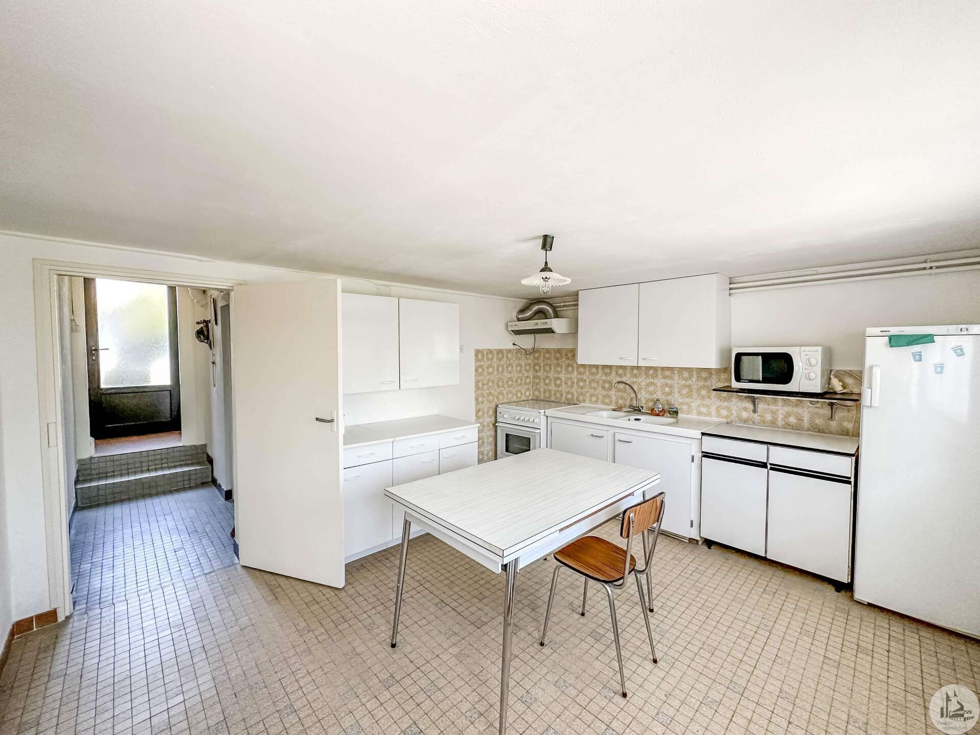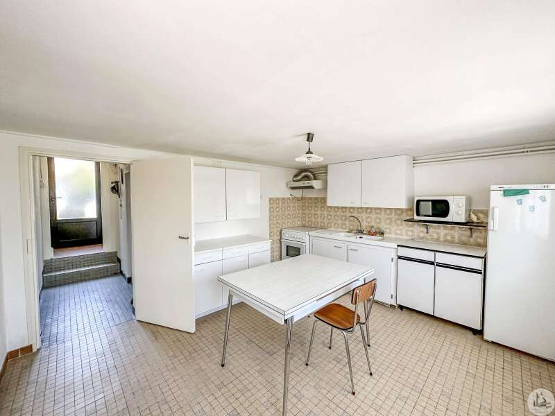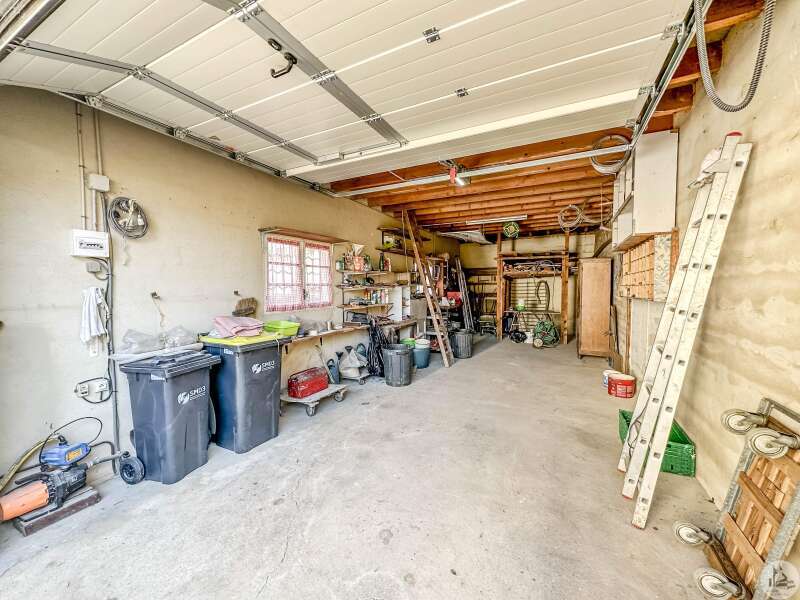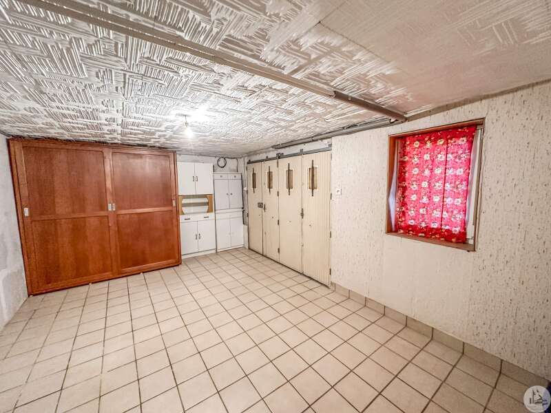 Woonhuis bestaande uit: - compenseren met kasten, - ingerichte keuken (gaskookplaat, oven, ruimte voorzien voor een vaatwasser (9,5m2), - woon-/eetkamer (15 + 9,8m2), parketvloer, - twee slaapkamers (circa 11,3m2 en 10m2), verglaasde parketvloeren, - doucheruimte met bidet, wastafel, spadouche (3,35m2), 3 jaar geleden vernieuwd, - onafhankelijke toiletten. In de kelder: - keuken (14m2), - woonkamer (11,5m2), - slaapkamer (9,3m2), - doucheruimte met toilet, wastafel, bidet, boiler, cumulus (9,3m2), - oude garage (15,5m2) hoogte = 1,99m, - Hal met kasten onder de trap. Onafhankelijke garage met nieuwe poort, aangrenzende tuin, waterput (alleen voor de tuin, pomp in de garage). Gemengd : - FIBER aangesloten - elektrische rolluiken boven
