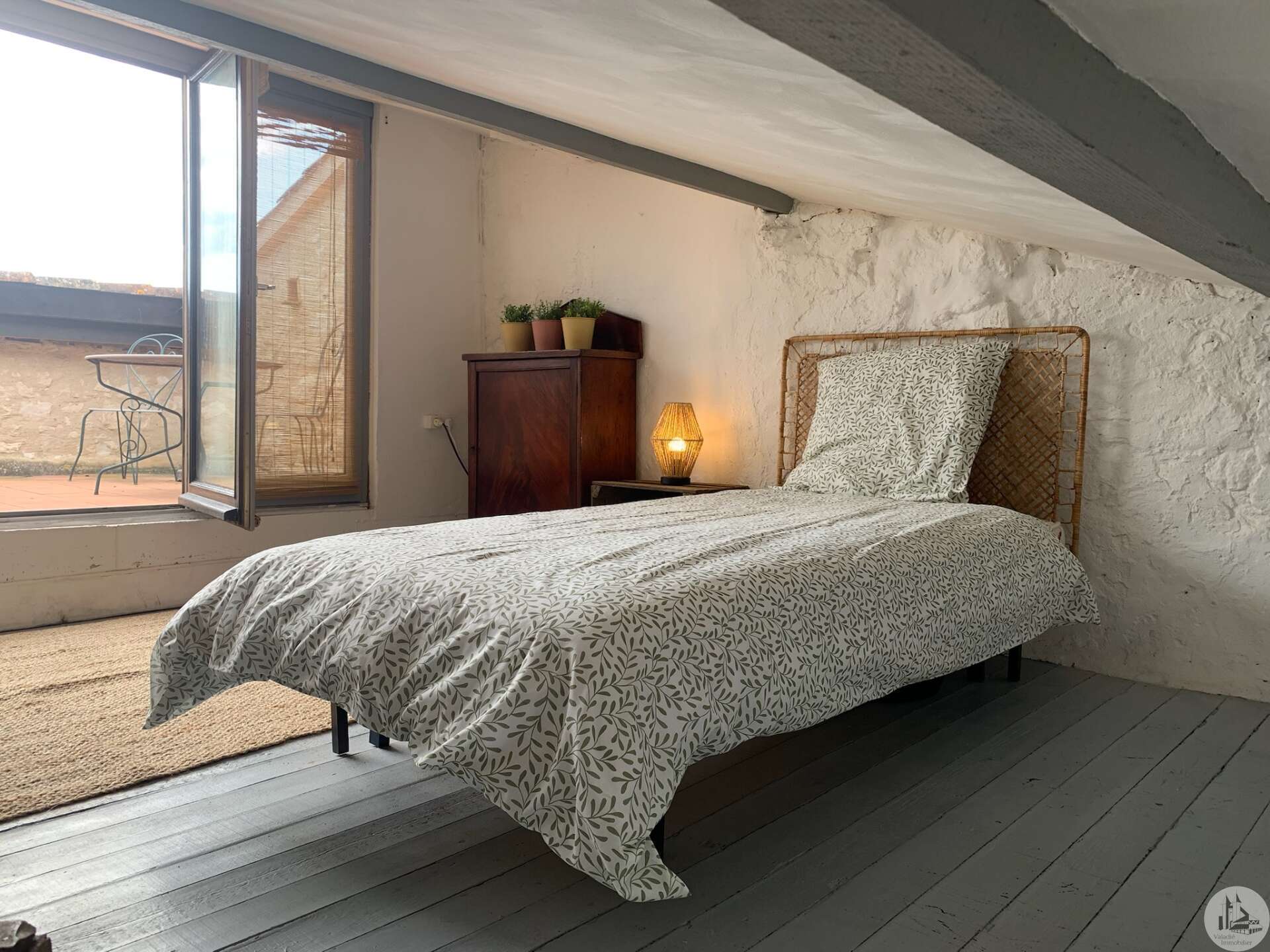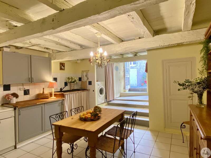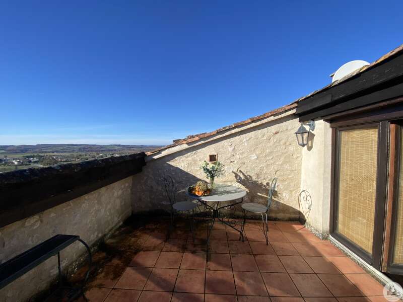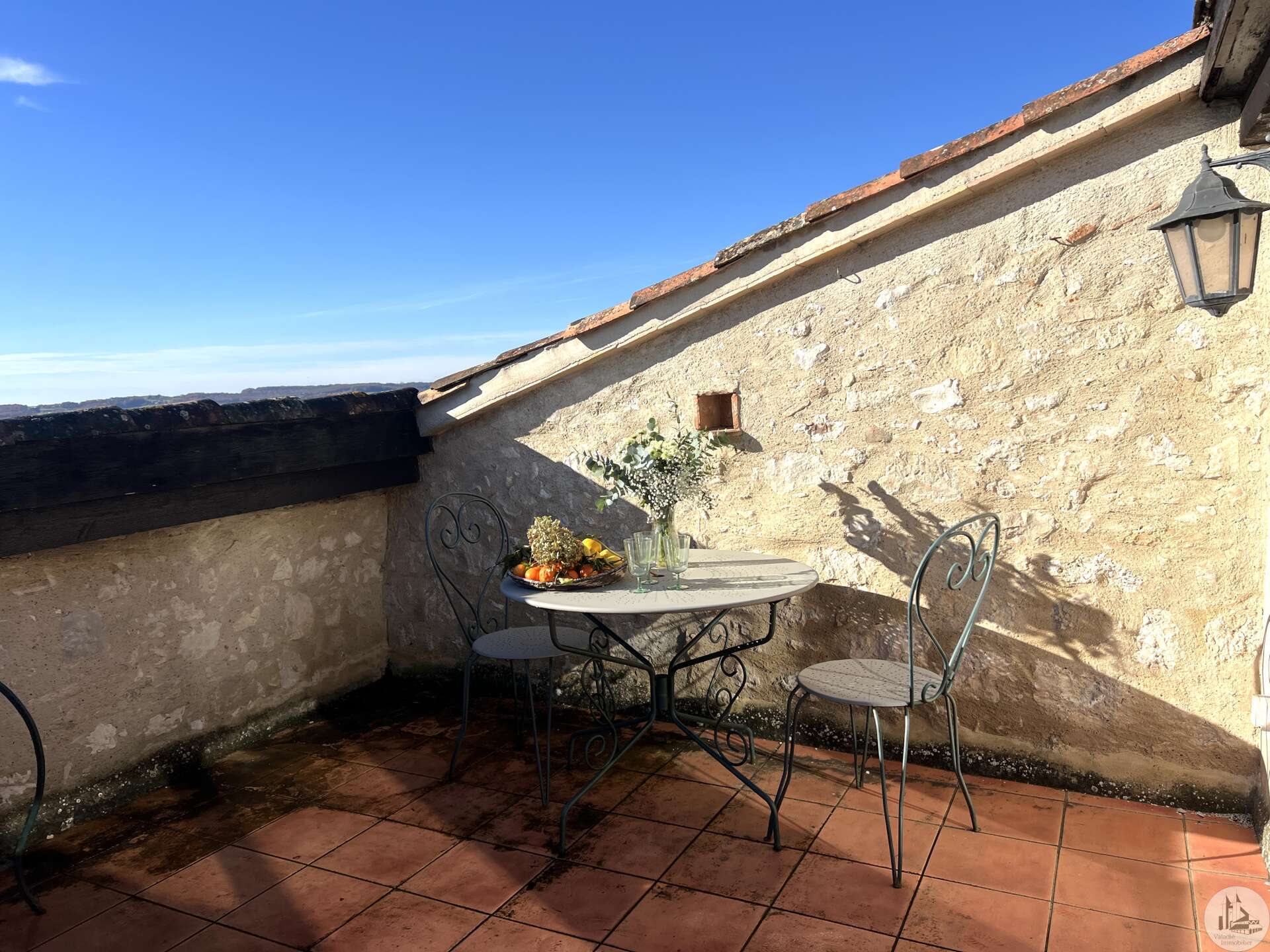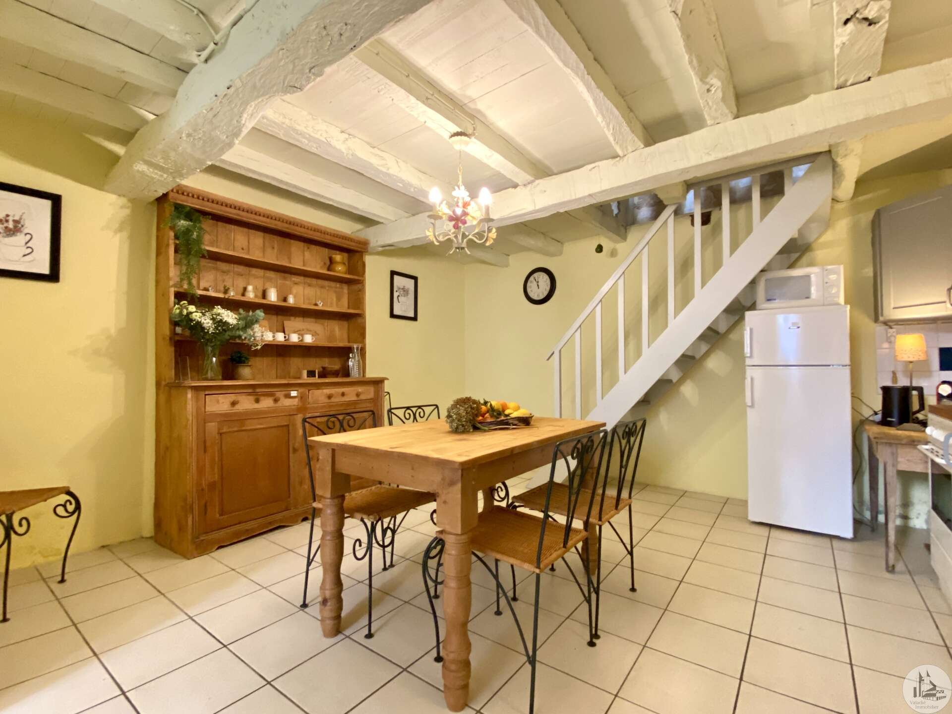 Deze charmante 13e-eeuwse dorpswoning, gelegen in het hart van de heuvelachtige vesting Monflanquin, is een van de mooiste dorpen van Frankrijk. -Begane grond- De stenen woning biedt op de begane grond een eenvoudige keuken, een gastentoilet en een trap naar de woonkamer op de eerste verdieping. -Eerste verdieping- Entree, gevolgd door een tweede trap naar de woonkamer met originele houten vloer, open haard met houtkachel, zichtbare stenen muren en balken. Een Frans balkon en een houten inbouwkast maken het geheel compleet. -Tweede verdieping- Op de eerste verdieping bevindt zich een ruime slaapkamer met zeegras vloerbedekking, zichtbare stenen muren en balken, en een en-suite badkamer met ligbad/douche, wastafel en toilet. Er is ook een handdoekdroger aanwezig. - 3e verdieping - Trap vanuit de slaapkamer naar de bovenverdieping Op de bovenste verdieping bevindt zich een zolderkamer met een schuin mansardeplafond, die als extra slaapkamer kan dienen. Via deze ruimte is er toegang tot het dakterras met uitzicht over het landschap. --De woning wordt gemeubileerd verkocht-- Dakterras van ca. 15 m² --Gratis en gemakkelijk parkeren in de buurt. Let op: Er zijn drie steile trappen in de woning. De verwarming wordt verzorgd door een houtkachel in de woonkamer, de badkamer heeft een handdoekdroger. Er is geen centrale verwarming. De ramen zijn enkelglas. De tweede slaapkamer op de bovenste verdieping is eigenlijk een 'extra' slaapkamer voor incidenteel gebruik of voor een kind, aangezien het mansardeplafond laag en schuin is. De toegang tot het dakterras is ook via deze kamer, door een lage deur. De onroerendgoedbelasting (taxe foncière) voor het jaar bedraagt 476 euro. Het huis is aangesloten op de riolering en het waterleidingnet (tout à l'égout). Het huis is circa 89 m² groot en is verdeeld over 4 verdiepingen: Begane grond: Keuken - entree Voordeur (witte deur links) en vervolgens naar de 1e verdieping 1e verdieping: woonkamer met houtkachel 2e verdieping: Slaapkamer met badkamer 3e verdieping: Kleine slaapkamer (voor incidenteel gebruik), open ruimte met toegang tot het dakterras Monflanquin, een prachtig middeleeuws dorp op een heuveltop uit 1256, staat bekend als "een van de mooiste dorpen van Frankrijk" en biedt een adembenemend uitzicht over het glooiende landschap. Veel onafhankelijke restaurants, cafés en boetiekjes bevinden zich op loopafstand van de woning, evenals de wekelijkse boerenmarkt. De rivierstad Villeneuve-sur-Lot ligt op 18 km afstand en Bergerac, Dordogne en de luchthaven daarvan liggen op ongeveer 40 minuten rijden met vluchten naar het Verenigd Koninkrijk, België en Nederland. Agen ligt op 40 minuten afstand. De grote steden Bordeaux en Toulouse liggen op minder dan 2 uur rijden. Een perfecte pied-à-terre, ideaal voor een eerste aankoop of als fantastische vakantiewoning.
