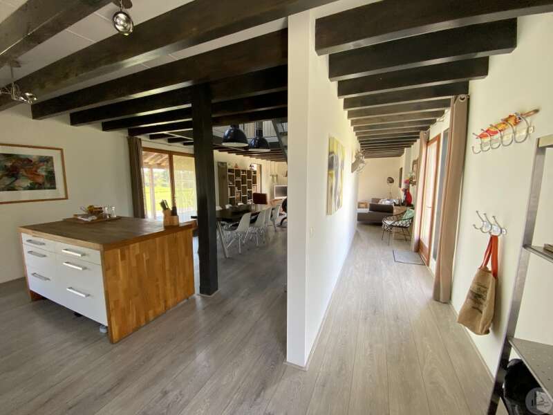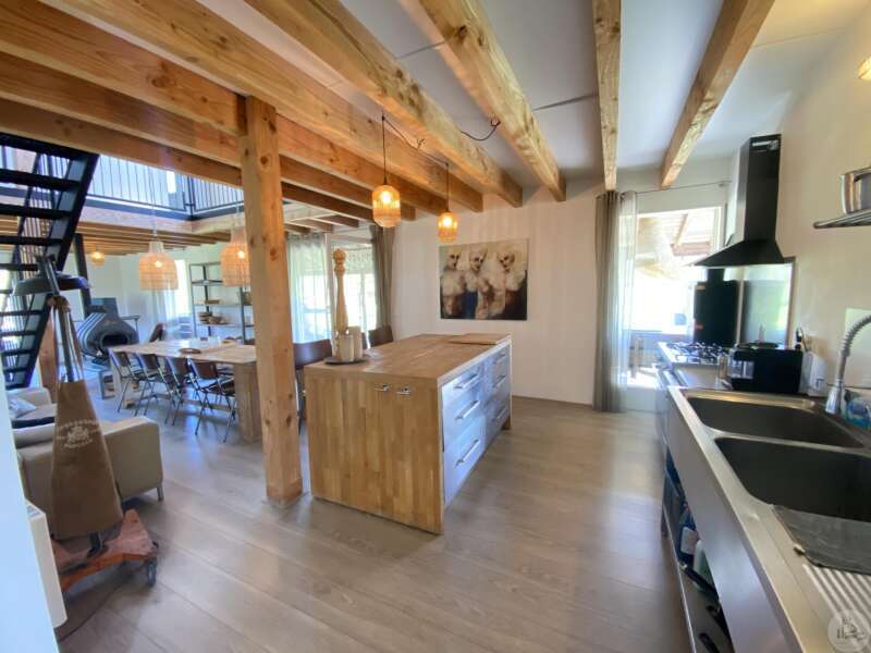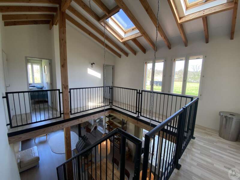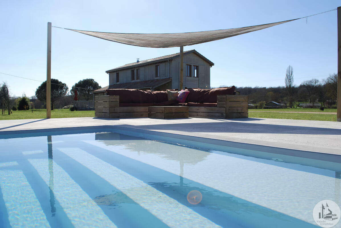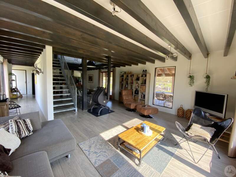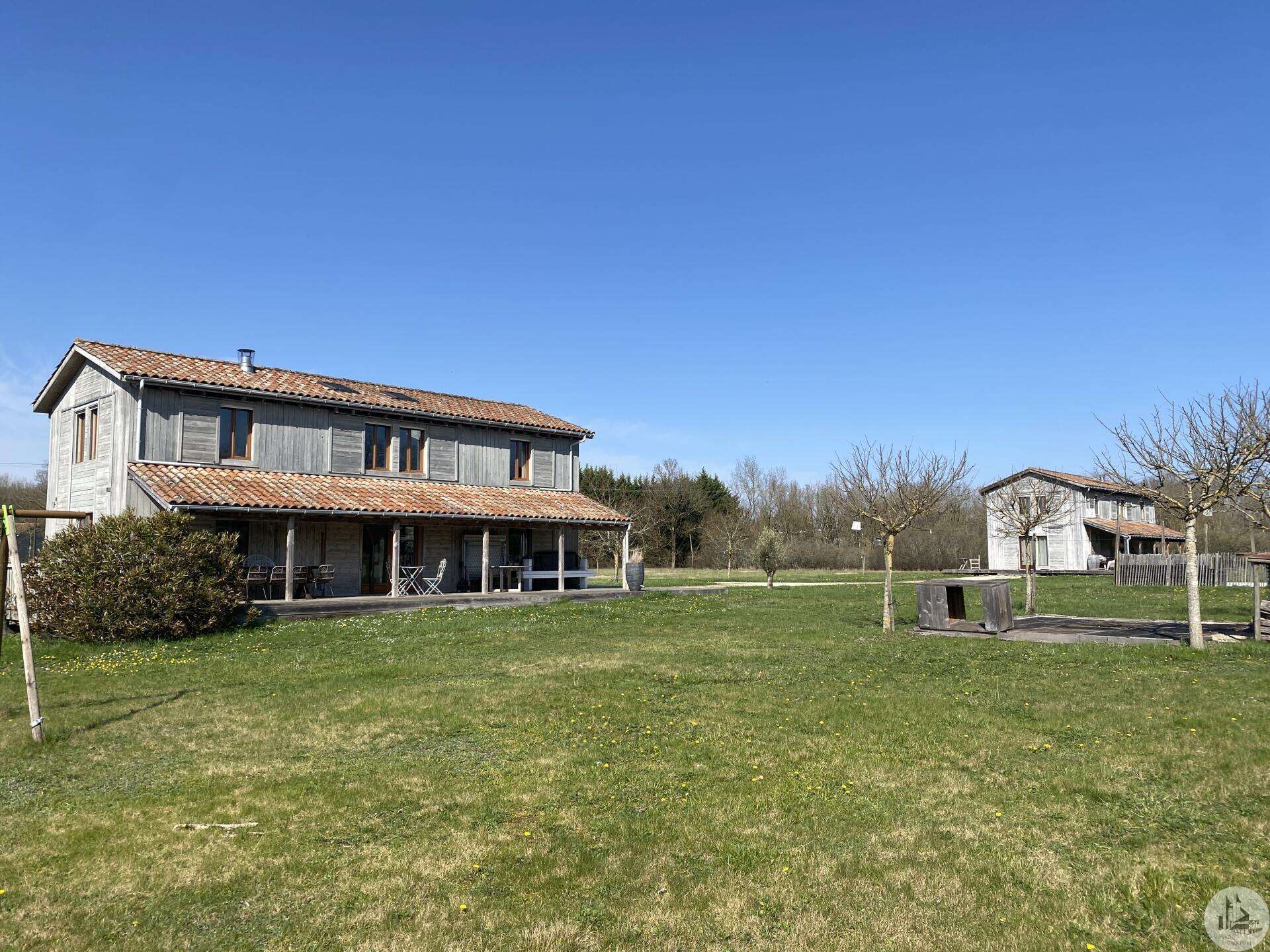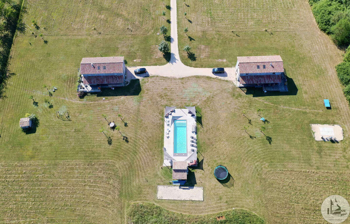 Twee houten huizen, gebouwd in 2009 door een lokale vakman, elk met een woonoppervlakte van circa 135 m², zeer licht en comfortabel. De indeling van het interieur is identiek, als volgt: (sommige decoratieve elementen verschillen van het ene huis tot het andere). Begane grond: - Een grote open woon-/eetkamer/keuken van circa 66 m², met parketvloer, een houtkachel, een ingerichte keuken met kookeiland, fornuis, afzuigkap en twee grote openslaande deuren. - Een bijkeuken met toilet en parketvloer. - Een stookruimte met boiler, meterkast en een deur naar buiten. Bovenverdieping: (bereikbaar via een metalen trap) - Een galerij van circa 14 m², met parketvloer. - Twee slaapkamers van circa 9 en 13,4 m² aan één zijde, elk met een eigen badkamer (douche, dubbele wastafel, toilet, tegelvloer). - Twee slaapkamers van respectievelijk circa 10,6 en 9,02 m² aan de andere kant, elk met een eigen badkamer (bad, wastafel, handdoekradiator, tegelvloer). Comfortvoorzieningen: - Elektrische radiatorverwarming. - Inbouwkasten in alle slaapkamers. - Septische tank voor de afvoer. Een groot overdekt terras bij elk huis (14m x 4m). Een gedeeld chloorzwembad van 11m x 4m voor beide huizen, omgeven door een betonnen plaat en een hek. 1,49 hectare grond met een poolhouse en twee barbecueplaatsen.