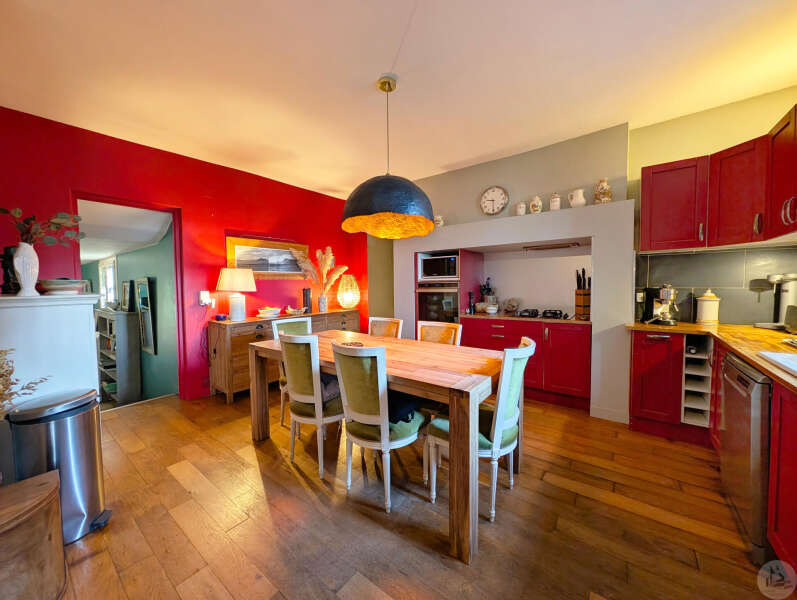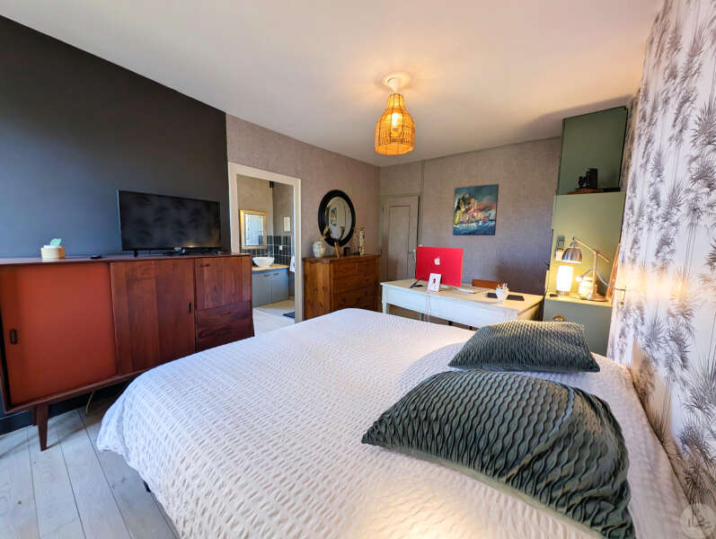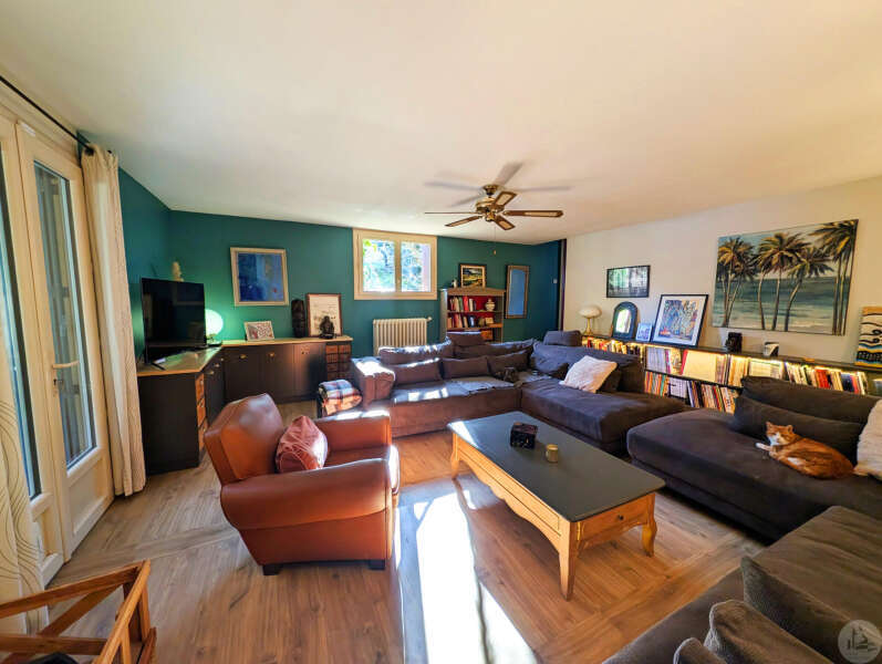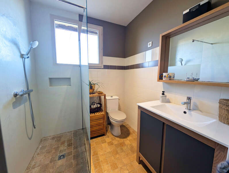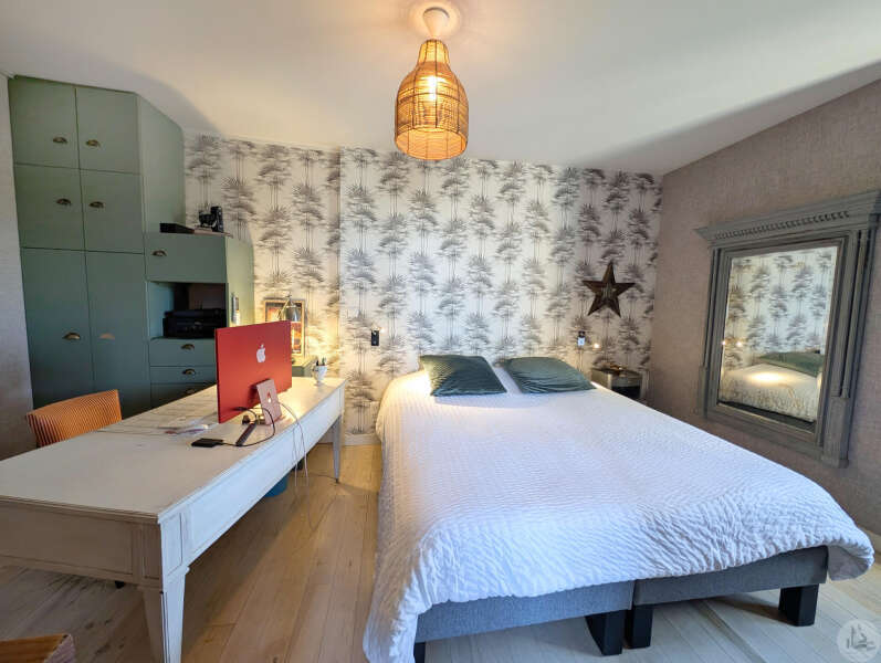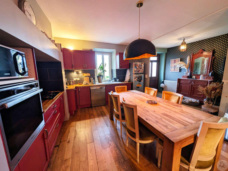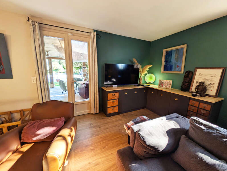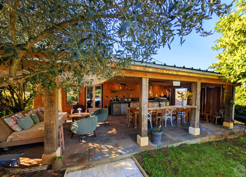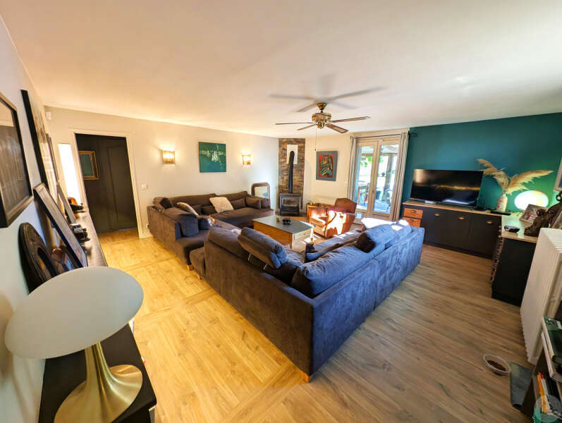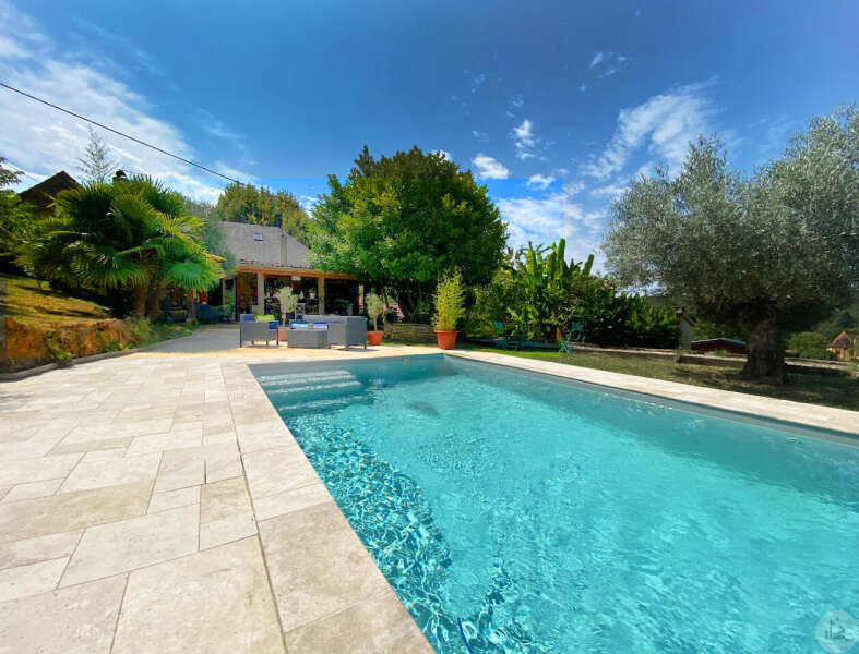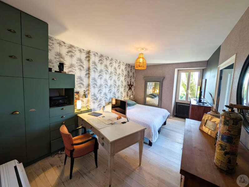 Op tuinniveau: Entreehal, volledig uitgeruste keuken/eetkamer (17 m²), bijkeuken/wasruimte (4 m²), woonkamer (32 m²) met houtkachel en toegang tot een groot, zeer aangenaam overdekt terras van 50 m² met buitenkeuken en uitzicht op het zwembad en de tuin, slaapkamer 1 (17 m²) met eigen badkamer met airconditioning, douche en kleedkamer (8 m²), slaapkamer 2 (10,5 m²), slaapkamer 3 (15 m²) met eigen ingang, douche en toilet. Bovenverdieping: Een overloop, twee slaapkamers op zolder met airconditioning en een toilet met wastafel. Zwembad (9x4 m, aangelegd in 2023) met een groot terras en een kleine overkapping, en een berging voor zwembadapparatuur. Bijgebouwen: - Een houten chalet met een slaapkamer van 16 m². - Een grote schuur van circa 130 m² bruikbare vloeroppervlakte verdeeld over twee verdiepingen, waarvan de tweede verdieping gelijkvloers is met toegang tot de achtertuin, waardoor er mogelijkheden zijn voor een vakantiehuisje of bed & breakfast. - Een carport van circa 50 m². - Een broodoven. - Een kleine stal. - Een kelder. * Verwarming op aardgas (ketel uit 2020) + Airconditioning (3 slaapkamers) + Houtkachel. * Dubbele beglazing. * Glasvezelinternet. * Alarmsysteem. * Individuele septic tank.
