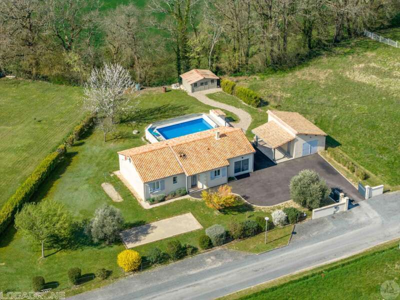 In de omgeving van Monflanquin, vlakbij een charmant gehucht, staat een heerlijke gelijkvloerse woning van circa 80 m² met twee slaapkamers en een schuur op een perceel van ruim 4000 m². Een droogschuur en nog eens 3000 m² grond zijn apart bij te koop.