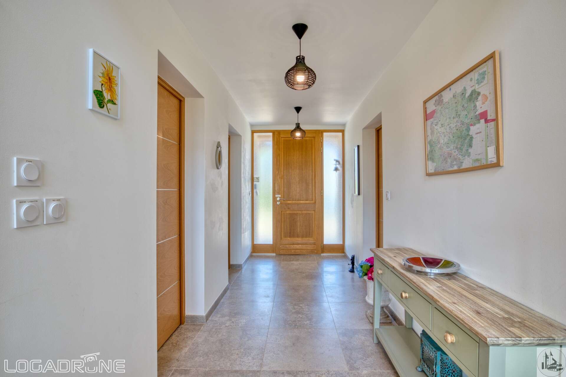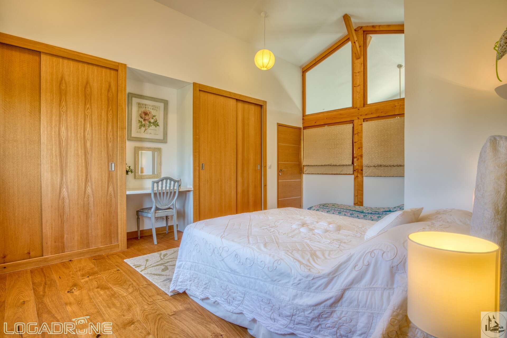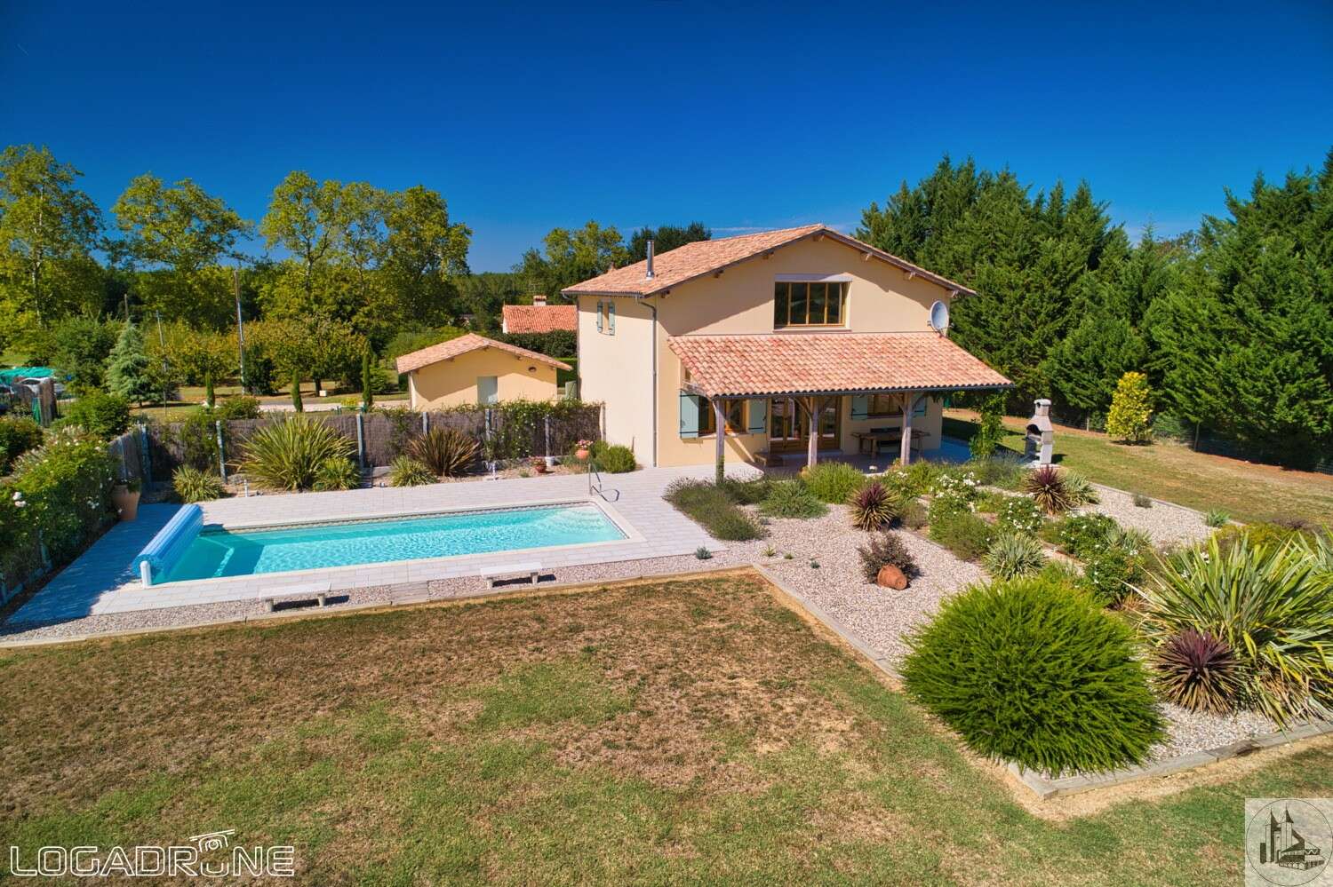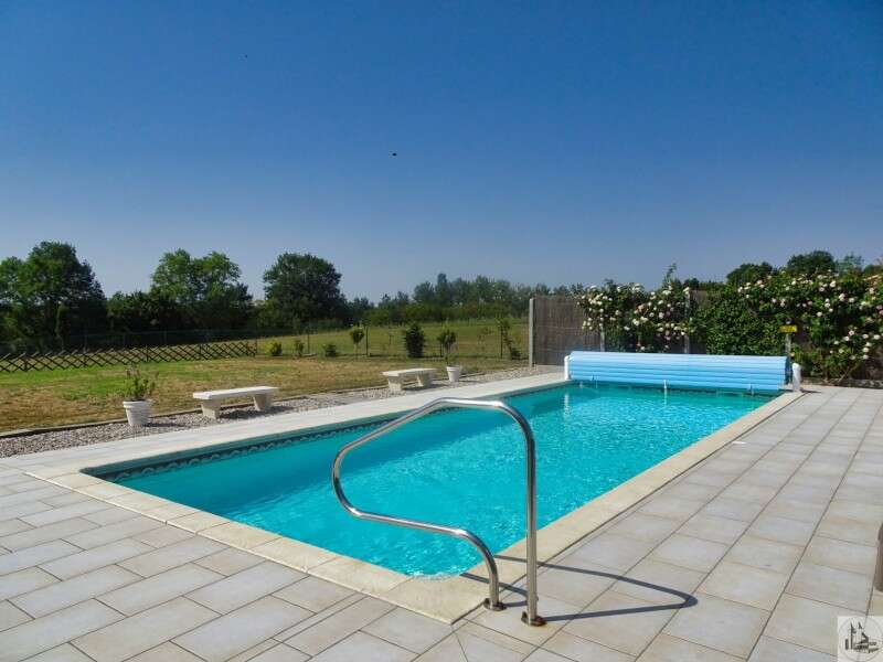 Modern and atypical house, built in 2015, of approximately 158 m2 including : On the ground floor : entrance hall open onto the living room. This spacious living room has a high ceiling, giving it incomparable volume and a brightness, and it is composed of a fitted kitchen (14,5 m2), dining room and sitting room (35,1 m2) with wood-burning stove. A store room (6 m2) completes the kitchen. - 2 bedrooms (12,8 and 14,5 m2) en-suite with private bathroom (washbasin, bath and w. c to the first one of 4,3 m2 and wash hand basin, shower, w. c for the second one of 3,1 m2) Covered terrace (30 m2) - toilets with basin (2,6 m2) On the second floor : landing / gallery (3,5 m2), 2 bedrooms en-suite : a large bedroom of 22,9 m2 (again with a ceiling height giving a nice volume to the room) with bathroom of 9,4 m2 (basins, bath, shower and w. c) and the second bedroom of 10,5 m2 with a shower room of 2,6 m2 (washbasin, shower and w. c). Office (6,9 m2) Underfloor heating by Aerothermal heating. Double-glazed windows. Electric shutters on the rear and shutters of wood on the front. Independent garage (22 m2). Work room. Park of 4259 m2. The swimming pool is salt water and 10m x 4m x1.3m (flat bottom) and it's heated.