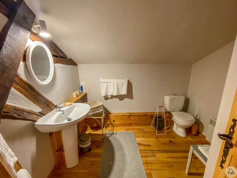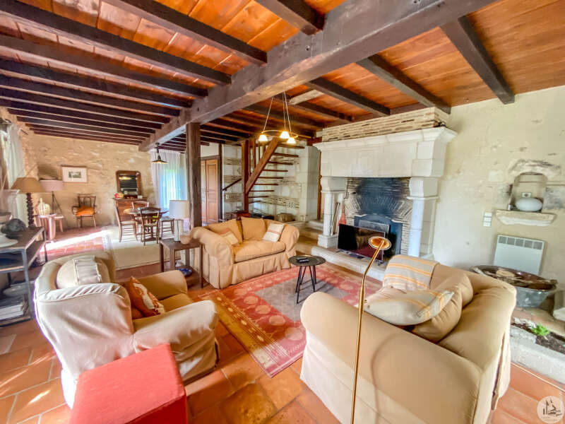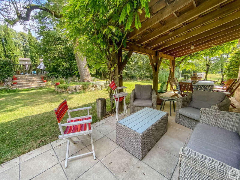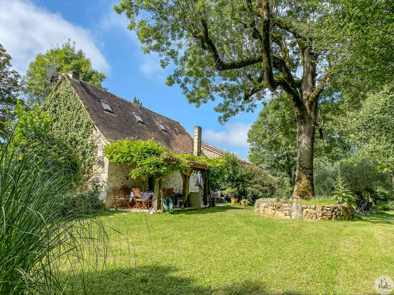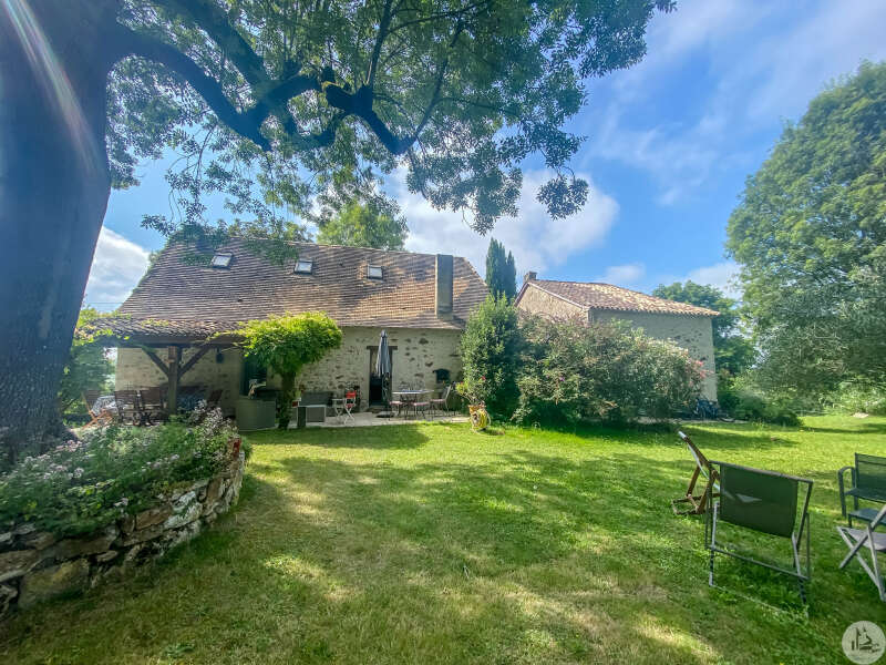 A Périgord-style house with a living area of approximately 170 m² comprising: - a living/dining/kitchen (49.8 m²) with a fireplace (with a wood-burning stove). Adjoining the kitchen: a laundry room (7 m²) and a bathroom with a shower and bathtub/toilet (3.6 m²). A staircase leads to the upper floor with a landing (4.2 m²) with cupboards, a shower room with toilet (4.2 m²), and a large attic bedroom (3.6 m x 5.5 m floor area). From the kitchen, a hallway (3.3 m²) leads to a small bedroom or office (6.3 m²) and a second part of the house: a living/dining room (49.3 m²) with a large stone fireplace. A staircase leads to a second floor with two bedrooms (19.3 m² and 10.3 m²), each with its own shower room. The sanitation system is fault-free. An attached garage (35 m²) Park boasting magnificent mature trees and a 10m x 5m heated swimming pool with Roman steps and a covered terrace.