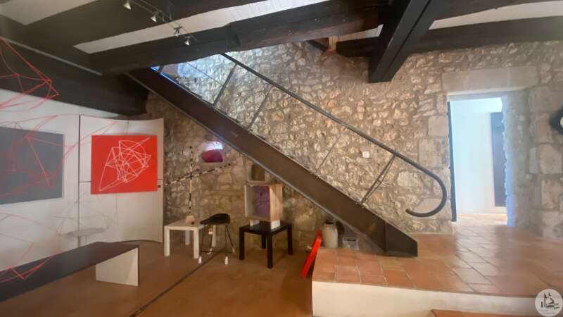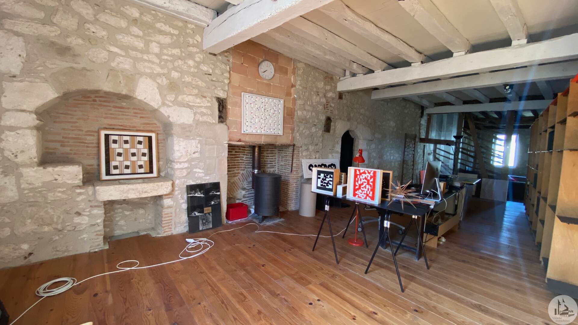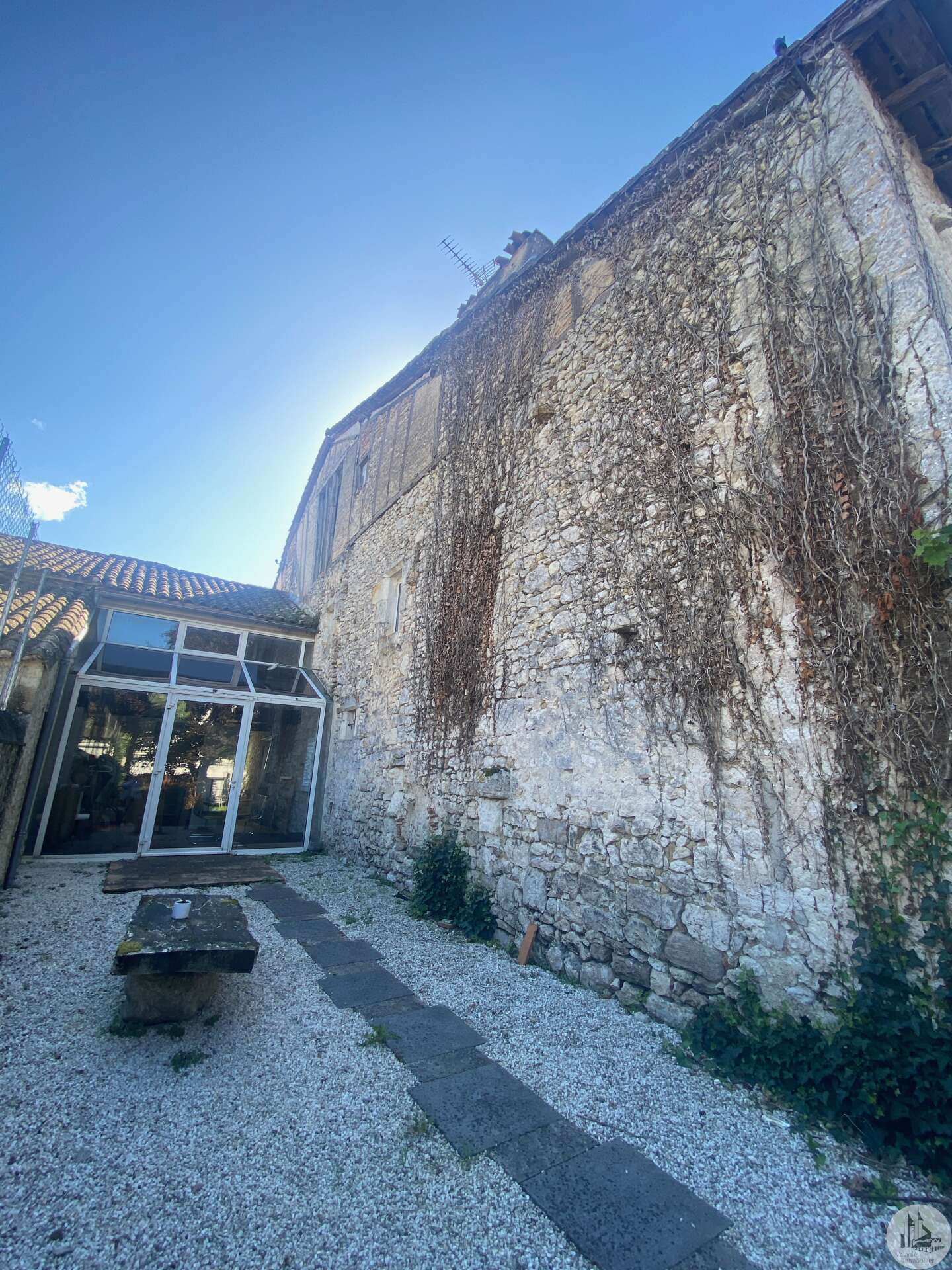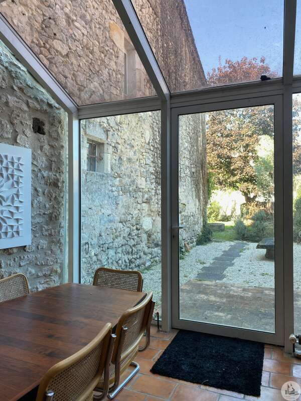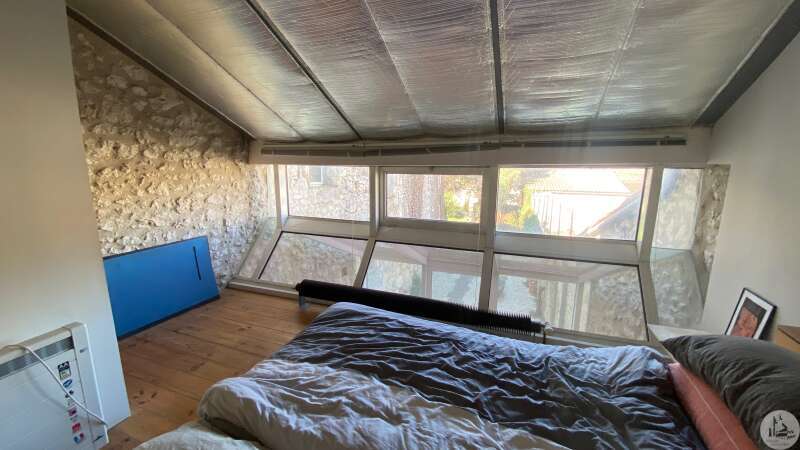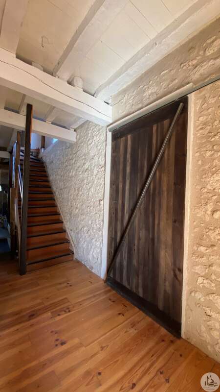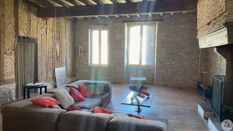 Large house offering more than 330m2 of usable space located in the historic heart of the village of Eymet and with a good-sized garden (rare in the center). This house, designed as an exhibition space, balances between classic local architecture and design. It was renovated a few years ago but it benefits from large spaces giving free rein to new projects. The ground floor is composed of a large room of approximately 100m2 dedicated to the exhibition of works. Exposed stone walls, original fireplace, high ceilings with exposed beams, a door opening onto the garden. A more contemporary space contains a shower room/wc of approximately 8m2 in which the gas boiler is also located; a kitchen-dining area of approximately 29 m2 with a large glass roof opening onto the garden. The first floor has another large room above the exhibition room (currently used as an office-workshop / living room) with fireplaces, parquet flooring, exposed stone walls, a bathroom (shower, bath, toilet); a glass-roofed bedroom The second floor is an attic used as a second bedroom / office with a large bay window. House with gas central heating, plus wood stove, the joinery is double glazed Mains drainage