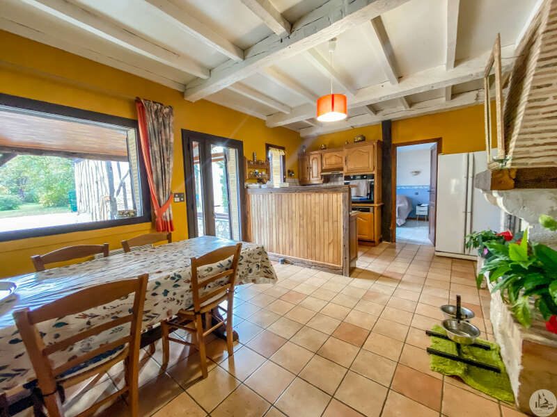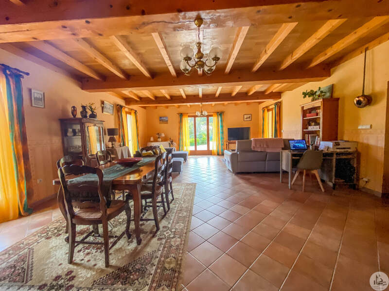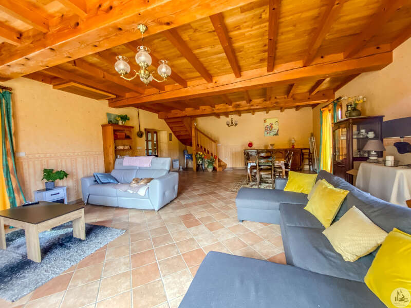 House with a living area of 190m² comprising a 24m² covered terrace leading to an entrance hall, a 24m² kitchen, and a 14m² pantry. On the ground floor are three bedrooms (11m², 10m², and 9m²) plus a separate toilet. Upstairs, a hallway leads to three bedrooms (13m², 12m², and 10m²) and a 7m² shower room. Outside, there is a stone dovecote used as a workshop. There is also a 30m² shed, a 20m² garage, and a 90m² carport. An 11x5m swimming pool with a pool house including a shower and toilet. The property sits on 31,495m² of fenced land with a lake.