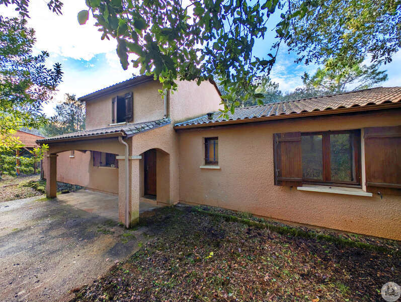 Sur un terrain boisé de 2566 m², maison de plain-pied à rafraichir, d'environ 120 m² habitable, avec une grande pièce à vivre de 40 m² et mezzanine , 3 chambres, garage attenant , et abri voitures.