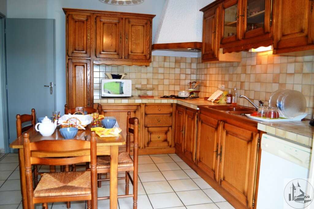Une maison des années 1990 d'une surface habitable de 110 m2 env. comprenant : - une entrée sur un séjour/salle à manger de 47,5 m2 env. , carrelage au sol, 2 portes-fenêtre avec un conduit de cheminée, - un débarras de 8,2 m2 env., carrelage au sol, - une buanderie/chaufferie de 8,8 m2 env. avec chaudière (2 ans d'âge) et cuve à fuel, - une cuisine aménagée de 12 m2 env., avec placards haut et bas en chêne, plaque de cuisson au gaz, hotte aspirante, four, lave-vaisselle, carrelage au sol. - un couloir de distribution vers : - un wc indépendant, - une salle de bains de 6,6 m2 env. carrelage au sol, faïence aux murs, lavabo, baignoire. - 3 chambres de 11,6m2, 9,9m2 et 12,05 m2 env., carrelage au sol, et placards KZ Chauffage central au sol au fuel (chaudière de 2014), avec une commande dans le séjour Menuiseries en PVC avec double vitrage beige et volets roulants électrique. assainissement contrôlé en 2014 aux normes. Terrain de 3104 m2 env. arboré.