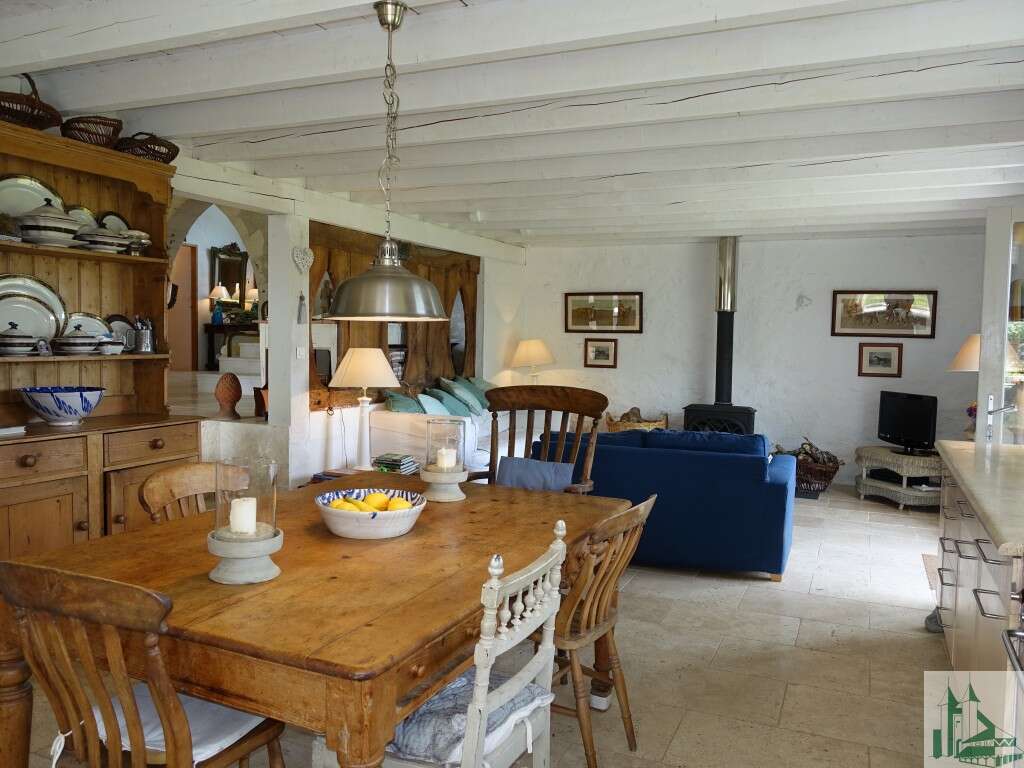 Ancienne grange transformée en maison d'habitation, pleine de charme, d'une surface habitable d'environ 295 m2 environ. L'accès à la maison se fait par un chemin privé. Au rez-de-chaussée : Un hall d'entrée de 10,8 m2 avec une belle porte en bois, un vélux, des placards et une ouverture en ogive qui dessert : - Un séjour ouvert très lumineux d'environ 110 m2, carrelage en pierre au sol, murs en pierre, poutres apparentes, belle hauteur sous plafond, portes fenêtres avec accès sur la terrasse. - En contrebas, une cuisine équipée de 41 m2, carrelage en pierre au sol, poêle à bois, hotte aspirante, lave vaisselle, frigo américain, cellier. - Une chambre en suite de 21,8 m2 accessible par deux marches, béton ciré au sol, murs en pierre, poutres apparentes, porte fenêtre avec accès sur le jardin ; une salle d'eau de 6 m2 avec lavabo, WC, douche à l'italienne, chauffe serviettes, vélux. - Une chambre (ou bureau) de 26,09 m2 avec béton ciré au sol et poutres apparentes donnant accès à l'étage à une chambre avec sa salle de bain ouverte (lavabo, baignoire et w.c). belle vue sur le jardin. - Un WC indépendant de 2 m2, carrelage en pierre au sol, lave-mains. - Une buanderie de 14 m2, carrelage en pierre au sol, porte fenêtre avec accès sur l'extérieur. A l'étage: - Une chambre en suite de 16,3 m2 avec un dressing de 6 m2, une salle de bain ouverte (baignoire, douche italienne, lavabo, WC), placards, 2 fenêtres et 1 porte fenêtre donnant sur un balcon. - Un balcon intérieur donnant sur le séjour, à usage de bibliothèque. Extérieur : - Une terrasse couverte de 35 m2 environ, accessible depuis le séjour, exposée sud avec vue sur la campagne environnante. - Un cabanon de jardin - Terrain de 5861 m2 Confort : - Double vitrage (anti effraction) - Chauffage au sol avec thermostat dans chaque pièce - Prestations de qualité