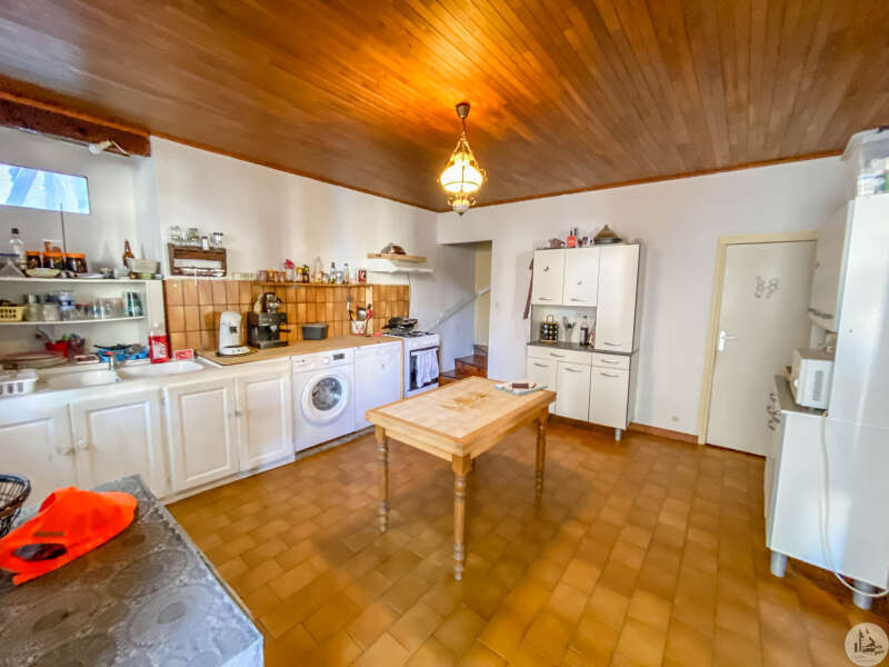 Une maison d'une surface habitable de 86 m2 environ, sur deux niveaux comprenant : - Une entrée depuis la cour sur une cuisine de 17,3 m2 environ, carrelage au sol, meubles bas avec un évier. Un escalier en béton desservant l'étage. - Un w.c sous l'escalier. - Un salon de 27 m2 environ, carrelage au sol, une fenêtre et une porte-fenêtres 3 vantaux. Une cheminée à foyer ouvert, compteur électrique. A l'étage : - Une chambre de 11,6 m2 environ, plancher au sol. - Une chambre de 11,2 m2 environ, plancher au sol. Cette chambre est traversante pour aller à la dernière chambre. - Une chambre de 13,9 m2 environ, plancher au sol. - Une salle de bains de 5 m2 environ, carrelage au sol, faïence au niveau du w.c, lavabo et de la douche. Un lavabo, une douche, w.c, une fenêtre. Plafond lambrissé, VMC. - Un dégagement avec un accès au grenier par une trappe. La maison dispose d'une petite cour de 37 m2 environ en partie cimentée. Un double garage attenant de la maison : un premier de 24 m2 environ, sol cimenté, avec une mezzanine au dessus. Un second garage de 8 m2 environ.