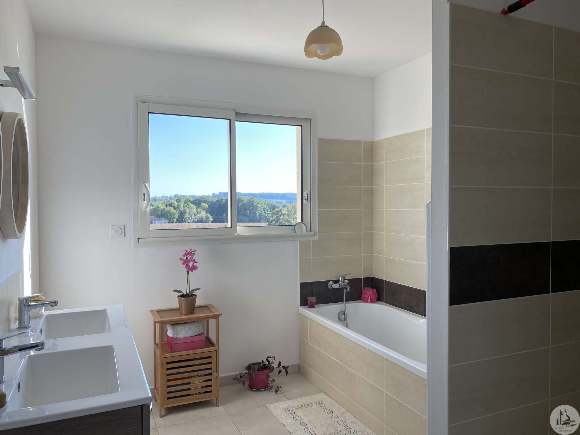 Agréable vue sur une campagne vallonnée et verdoyante située entre les hameaux du village des pruniers à 7 kms de Sigoulès cette maison de 2019 offre un cadre de vie paisible et confortable. Elle offre une surface habitable de 96m2, elle est très fonctionnelle. Elle comprend un hall d'entrée de 12m2 plus un dégagement disposant de rangements, wc individuel, une cuisine aménagée de 12m2 communiquant avec le séjour de 26m2 disposant de nombreuses ouvertures sur le terrain. Une pièce de 16m2 avec baies coulissantes pouvant servir de chambre, bureau ou salon selon les besoins. Une chambre de 15m2 avec son dressing de 3m2 et son cabinet de toilette de 1,84m2 Une salle de bains de 8,4m2 (baignoire et douche) Attenant et communicant à la maison le garage de 27m2 pourrait tout à fait être aménagé selon les besoins ou projets (possibilité de chambres supplémentaires) Cette maison très facile à vivre dispose de tout le confort actuel y compris pour des personnes à mobilité réduite. grands passages climatisation réversible, radiateurs neufs un conduit de cheminée est en place pour qui désirerait mettre un poêle Murs disposant d'une bonne isolation thermique et phonique Volets roulants alum. électriques Ballon thermodynamique Le terrain de 7900m2 entoure la maison, il dispose de quelques jeunes arbres assainissement individuel de type phyto-épuration Un chalet de jardin d'environ 20m2 offre la possibilité d'aménagements supplémentaires (studio, atelier...)