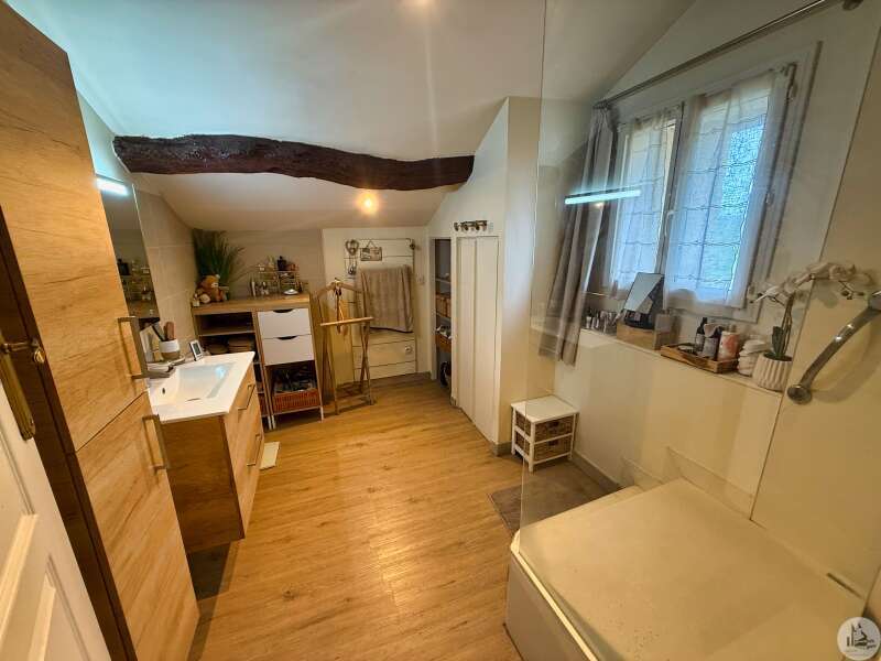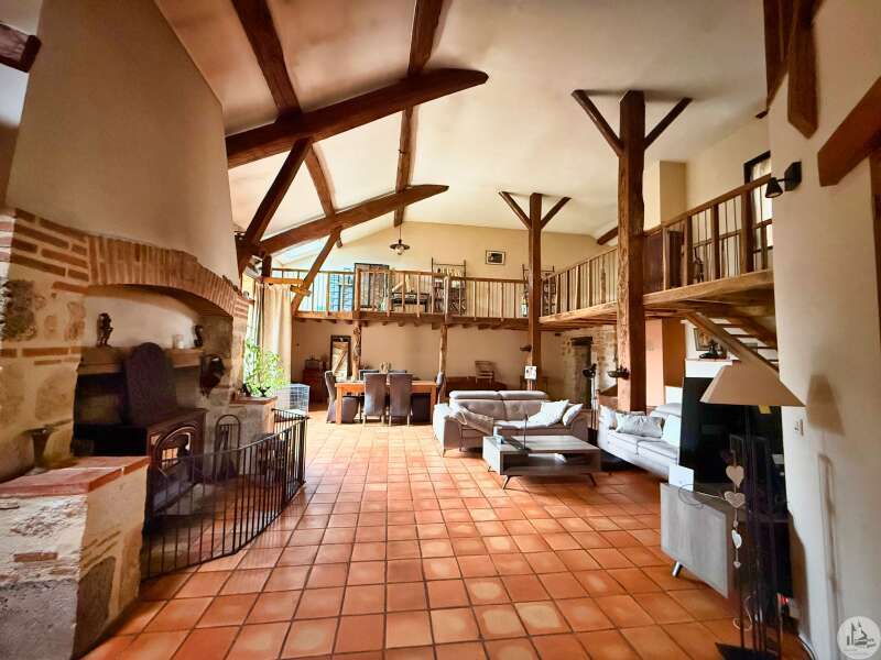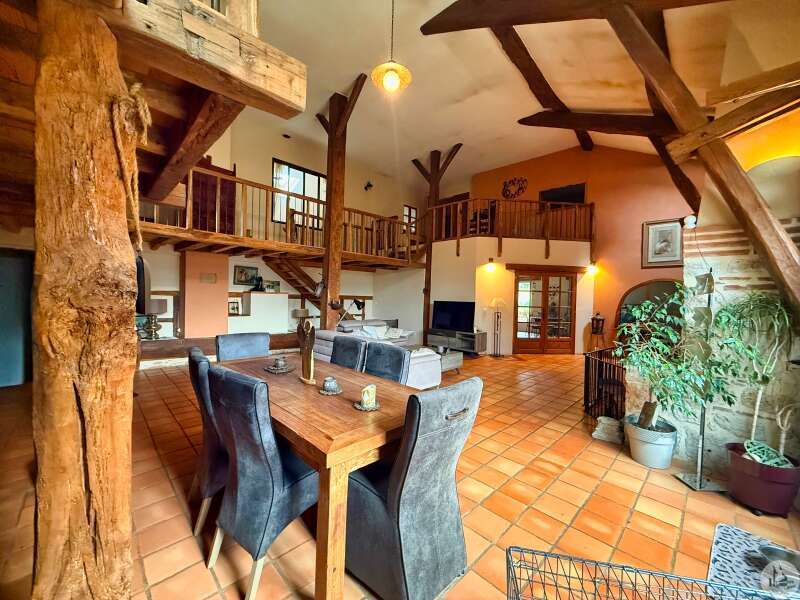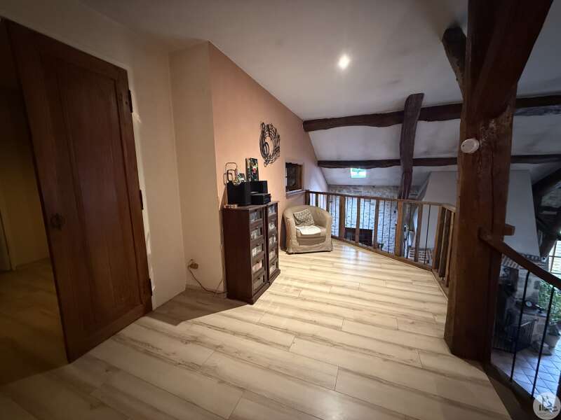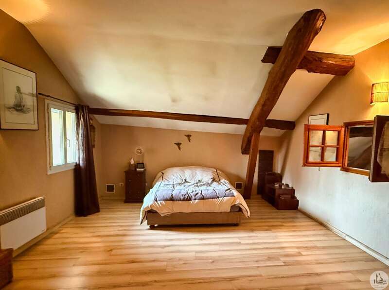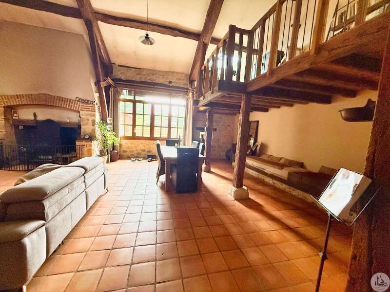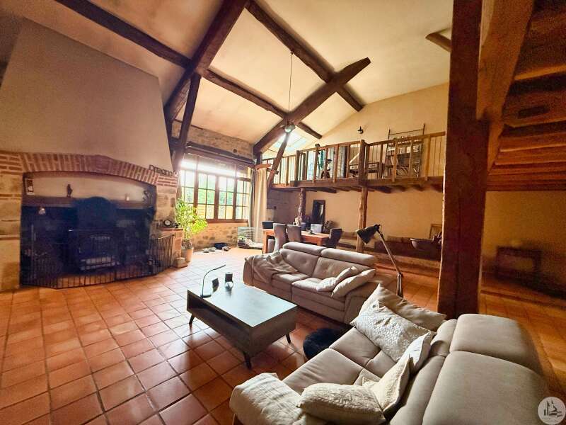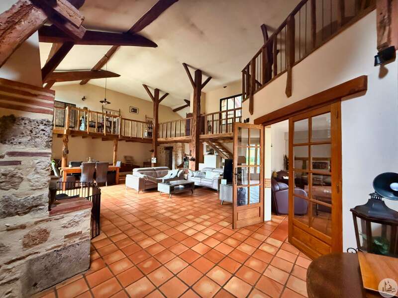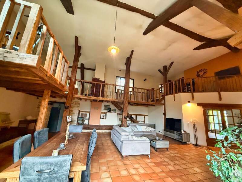 Sur un jardin fleuri, arboré et clôturé de 2417m² avec sa piscine, cette ancienne grange en pierre a été rénovée dans le respect des espaces, avec ses hauteurs sous plafond de plus de 5m, et ses pièces à vivre spacieuses, le tout baigné de lumière. On entre directement dans une pièce de vie de 79.16m² avec sa cuisine ouverte, sa cheminée fermée par un insert à turbines. Un cellier attenant de 13.33m² permet le rangement annexe de la cuisine ainsi que les machines à laver, congélateurs.... Puis un séjour de 99,36m² avec son poêle à bois nous accueille avec une hauteur de 5.40m permettant la mezzanine accessible par un magnifique escalier en bois ancien très fonctionnel. Un couloir dessert une chambre de 15.86m² qui possède un petit insert, une salle d'eau de 5.07m² , des toilettes et un accès direct à la grange de 78.07m² qui pourrait faire office de garage avec ses deux ouvertures et contient la chaudière au fuel de 2000 et sa cuve, ainsi qu'un adoucisseur d'eau de 2022. Lorsqu'on arrive dans la mezzanine, un long palier de 68.26m² pourrait faire un salon TV, une bibliothèque.......et donne accès à un atelier de 20.26m² éclairée d'une verrière et pouvant être une chambre de plus, ou un bureau pour du télétravail. Puis on arrive sur un palier qui dessert une chambre de 23.52m² avec placards, un toilette avec lave-mains, une salle d'eau de 8.77m² et une dernière chambre de 13.75m² actuellement en dressing. Double vitrage PVC Volets battants bois Volets roulants électriques. Dans le jardin, un appentis demande une rénovation Un appentis peut recevoir plusieurs voitures. Un carport reçoit une voiture. Une piscine de 5x10m avec son liner de 2012, son volet roulant de électrique de 2015, sa pompe de 2013