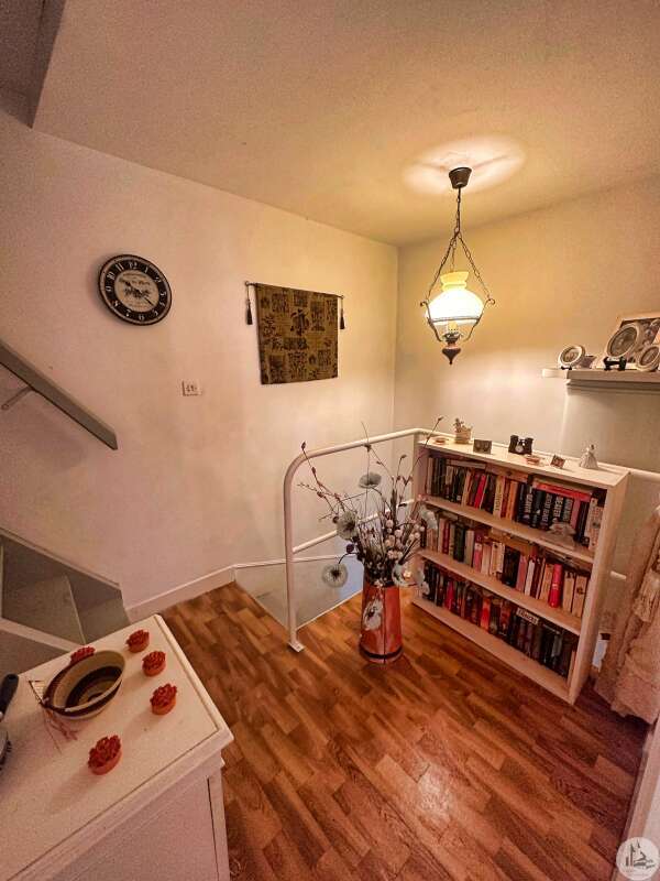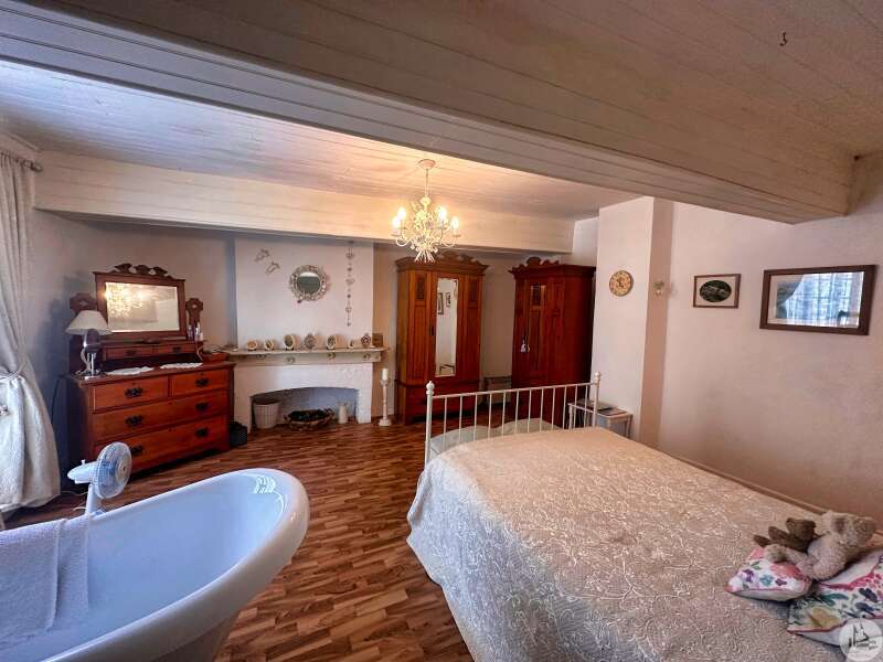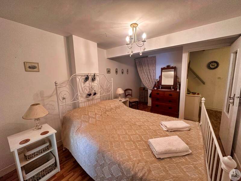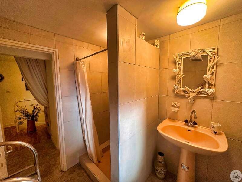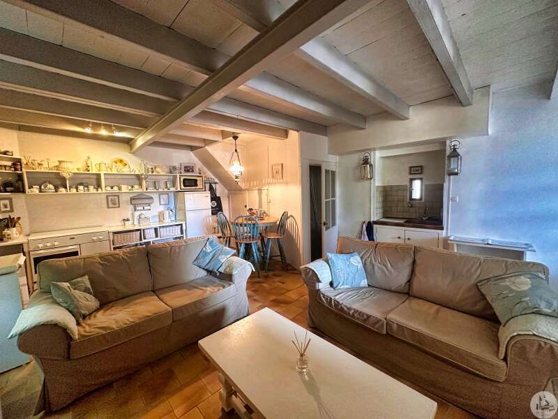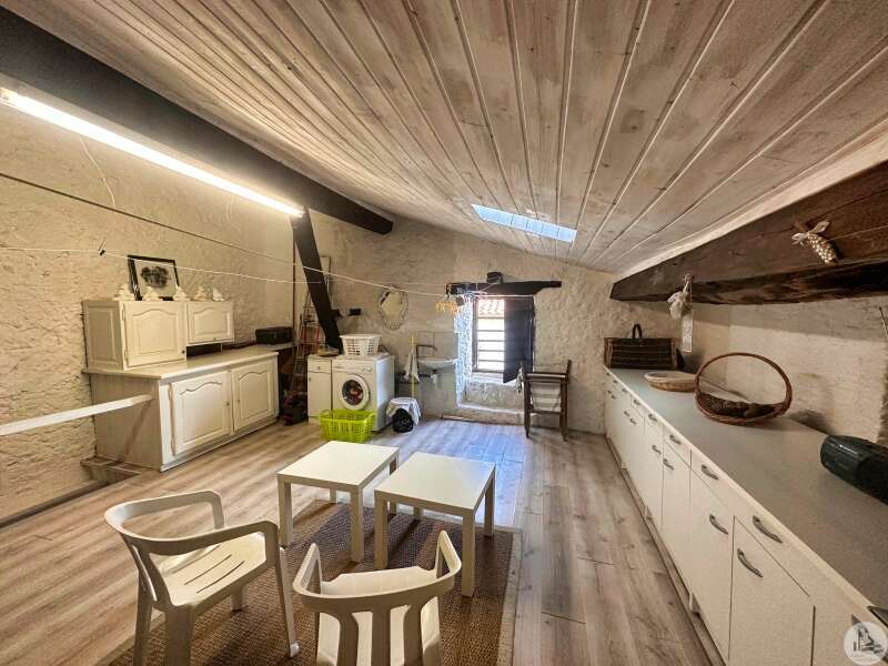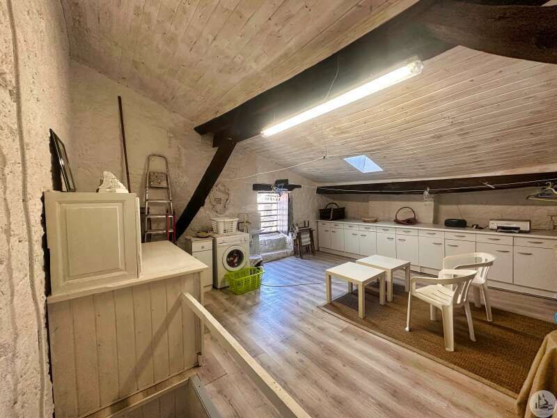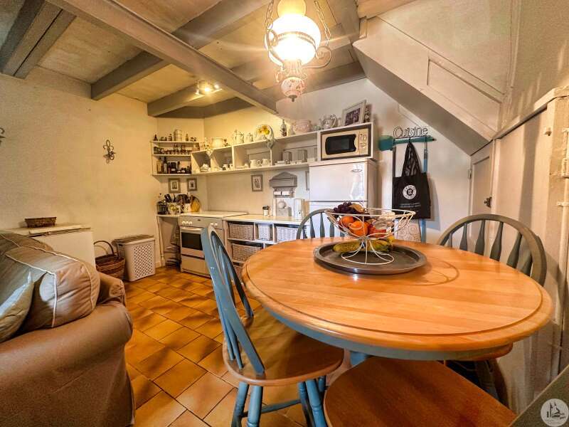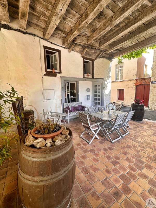 Une maison de village avec terrasse sous les arcades comprenant : - pièce de vie avec coin cuisine, électroménager inclus (23m2), - porte d'accès à la cave; Au premier étage : - pallier, sol ciment (3,4m2), - chambre (10,5m2), - salle de douches avec vasque (5,8m2), - wc avec lave-mains; Etage 2 : - chambre avec baignoire, vasque et wc (22,5m2); Etage 3 : buanderie pouvant tout à fait être une chambre avec salle d'eau (25m2). Tout à l'égout, simple vitrage, chauffage électrique, vendu entièrement MEUBLÉ ET ÉQUIPÉ, plus qu'à poser les valises !!!