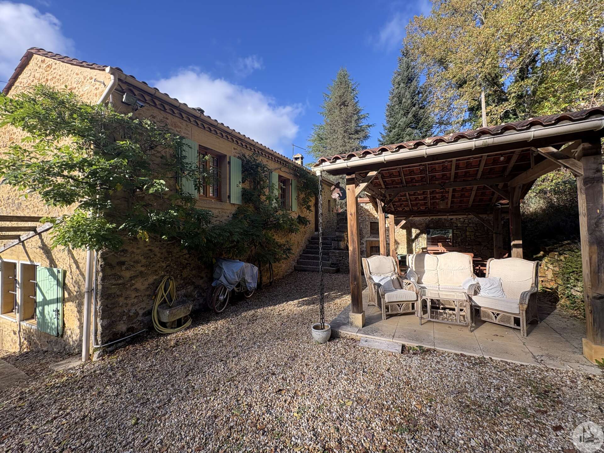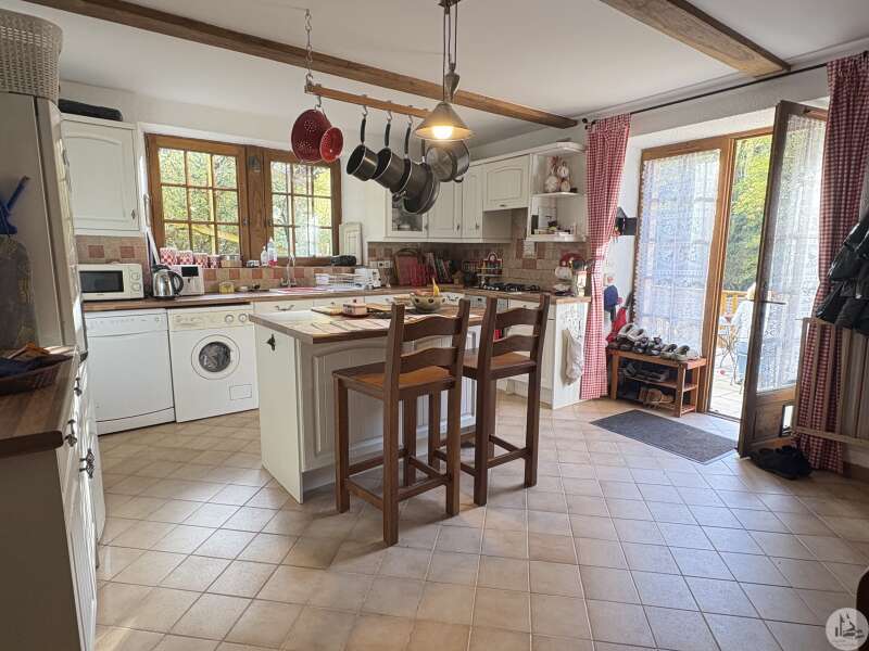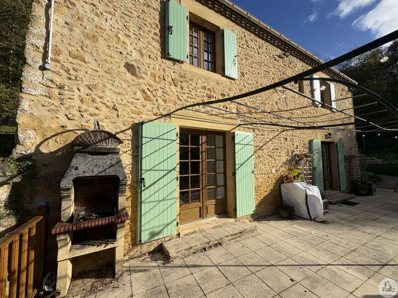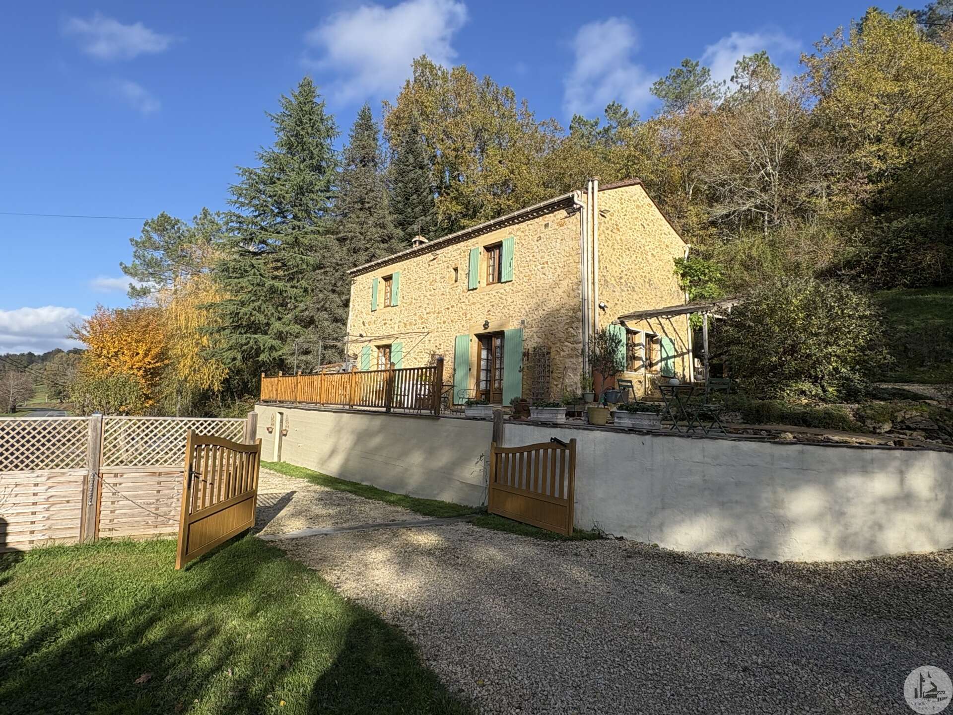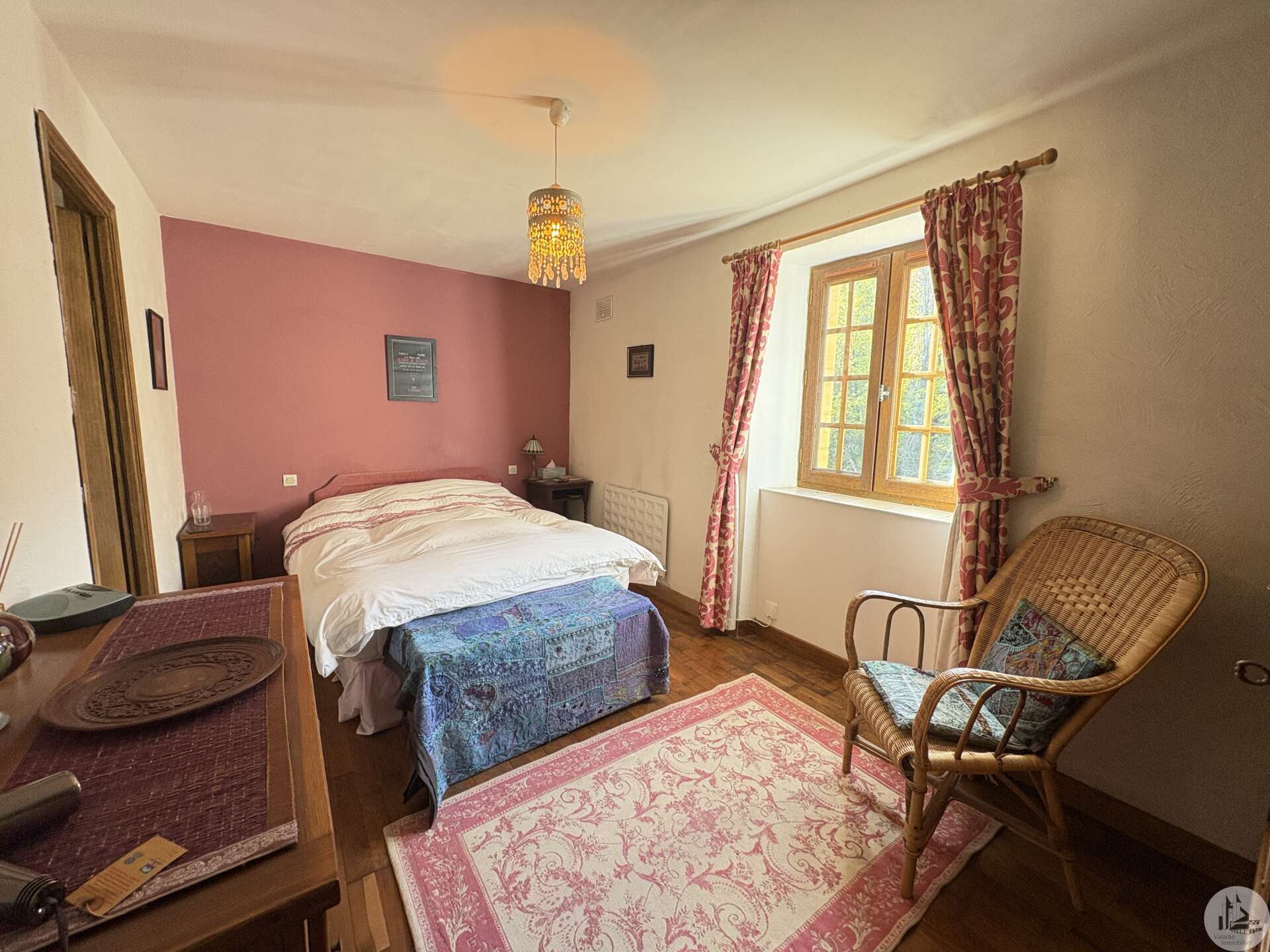 Maison en pierre de 86 m2 avec dépendances sur un terrain de 2429 m2. L'habitation se compose; Au rez de chaussée, d'une cuisine équipée/salle à manger et un salon avec poêle à bois. A l'étage, d'un palier avec deux chambres et deux salles d'eau chacune avec un toilette ainsi qu'un bureau. Les dépendances se composent, d'une cave en sous sol ainsi qu'un abri de jardin avec appentis et pièces de stockage. Le chauffage se fait par des radiateurs électriques. Les huisseries sont en double vitrage bois. A l'extérieur plusieurs terrasses donnent accès à un jardin arboré avec parking. Assainissement individuel conforme.