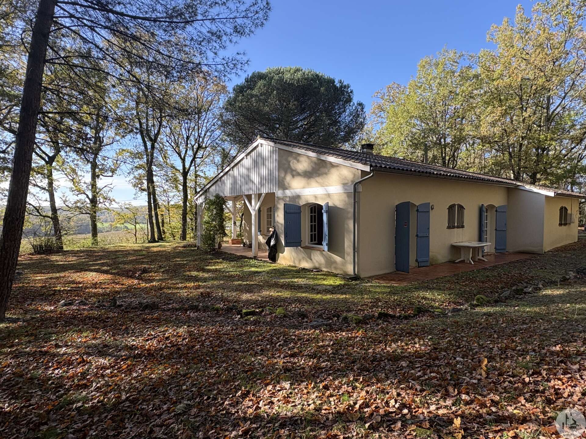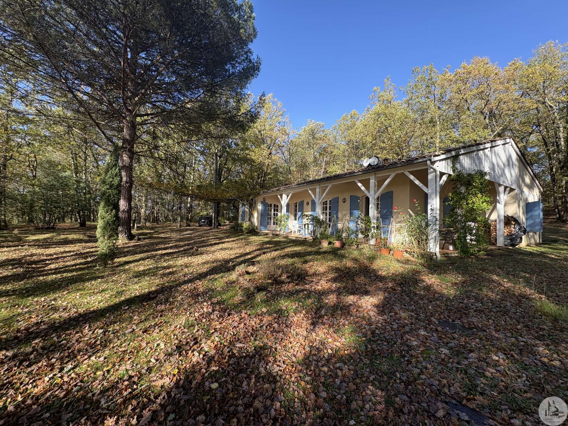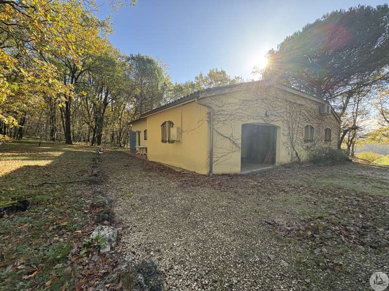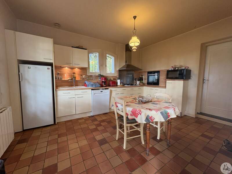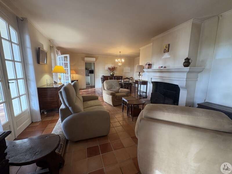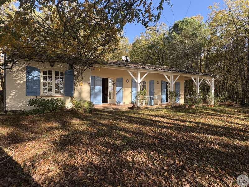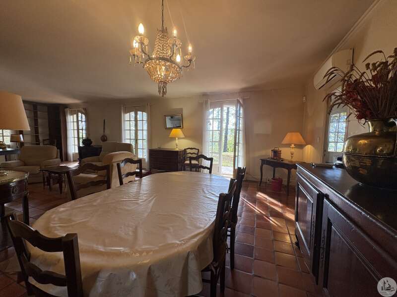 Maison de plain pied construite en 1978 d'environ 110 m2 se composant; D'une pièce principale salon/salle à manger avec cheminée, une cuisine équipée, un cellier, deux chambres, une salle d'eau, un toilette séparé avec lavabo et un garage. A l'extérieur plusieurs terrasses abritées mènent à un parc arboré de 5400 m2. Les huisseries sont en double vitrage. Le système d'assainissement est individuel. Le système de chauffage est électrique par climatisations réversibles et radiateurs.
