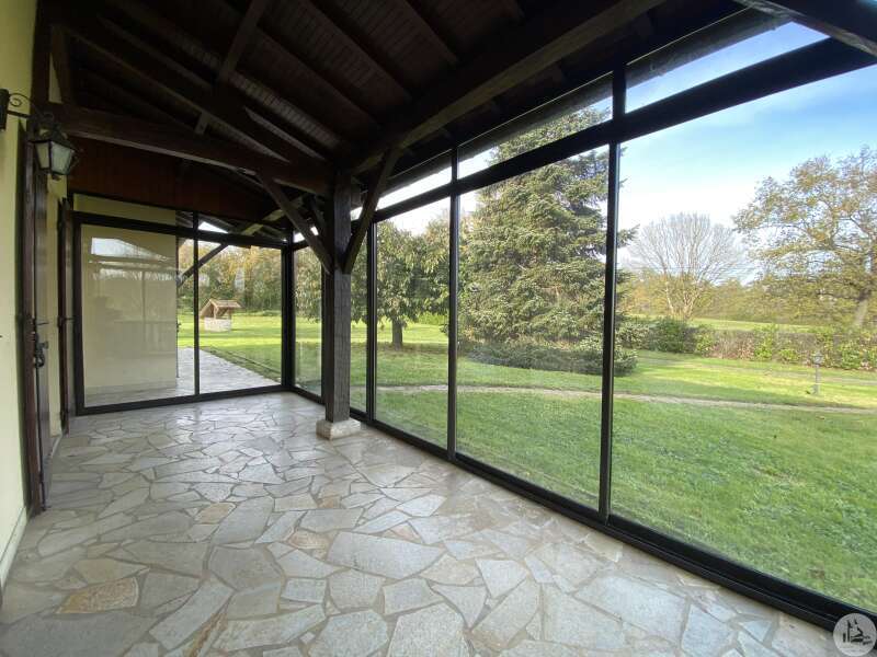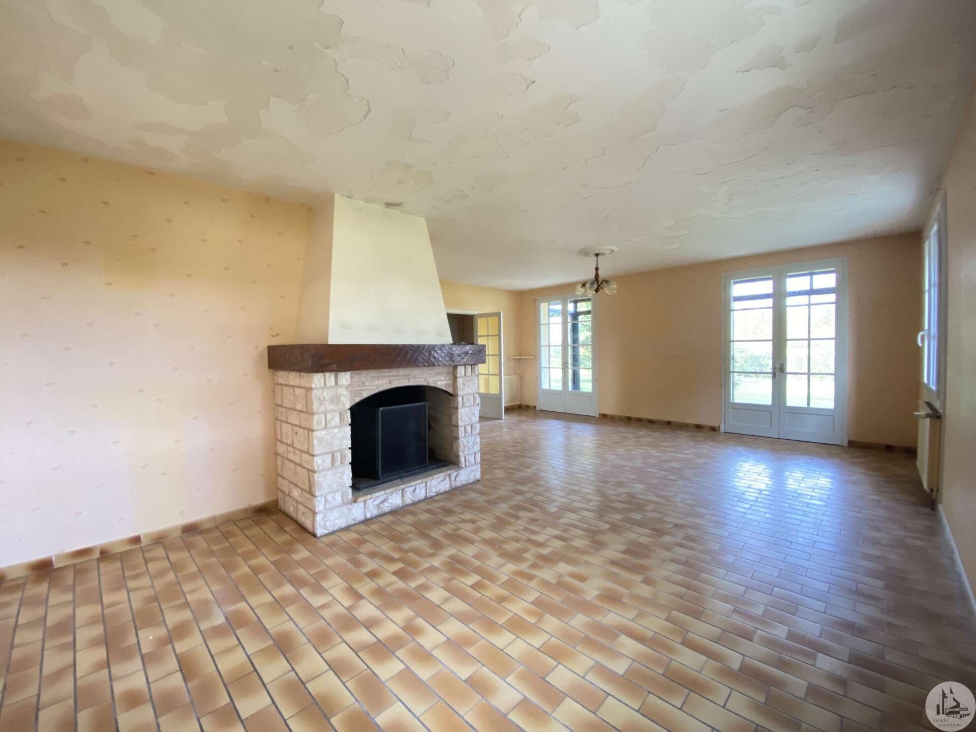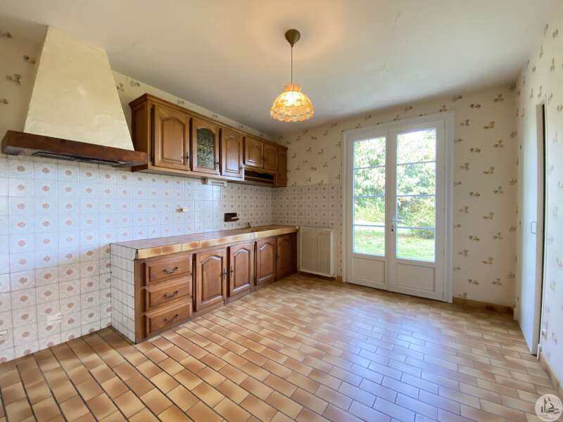 Maison traditionnelle construite sur sous-sol semi-enterré, offrant en rez-de-chaussée : entrée / couloir de distribution (8,5 et 6,5 m2) avec placards, cuisine aménagée (20,3 m2), salle à manger / salon avec cheminée (38,7 m2), 3 chambres (dont 2 avec placards) d'environ 14,1 ; 12,4 et 14 m2, salle d'eau avec lavabo et douche (6,3 m2), w.c. A l'avant : véranda de 16,5 m2 (baie en aluminium double vitrage. espace non équipé de radiateur) Chauffage central au fioul. Fenêtres en PVC double vitrage majoritairement (sauf les portes fenêtres du salon donnant dans la véranda et la porte d'entrée) Volets roulants électriques pour la plupart des ouvertures (sauf portes-fenêtres) Sous-sol sous toute la maison avec garage, buanderie, chaufferie et cave. Espace pour y créer des aménagements (fenêtres en bois simple vitrage) Terrain arboré avec puits (adduction pour la consommation)