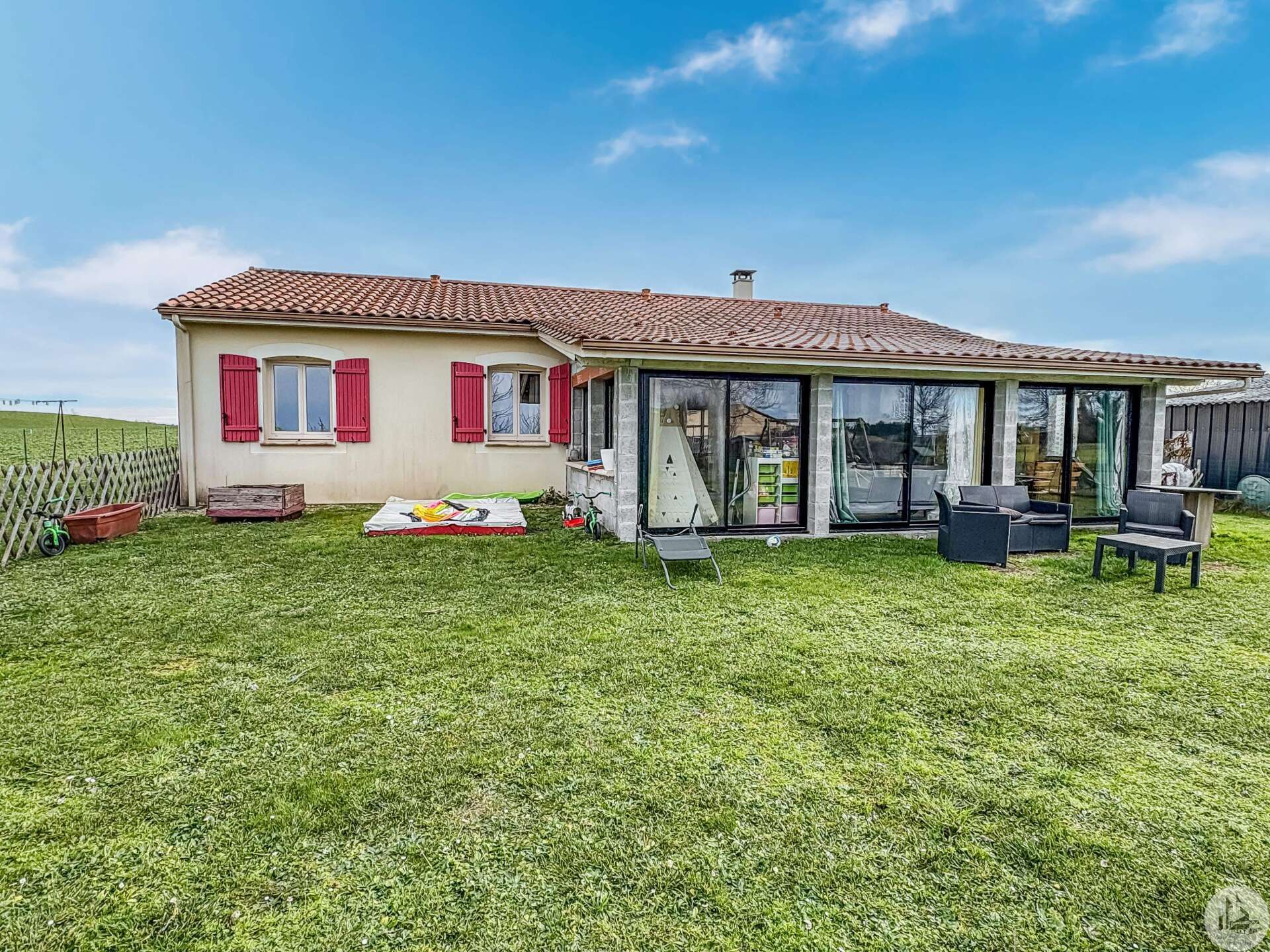 Entre Beaumont et issigeac, maison en lotissement de 108 m2, trois chambres, véranda et garage sur terrain plat et clos de plus de 1000 m2.