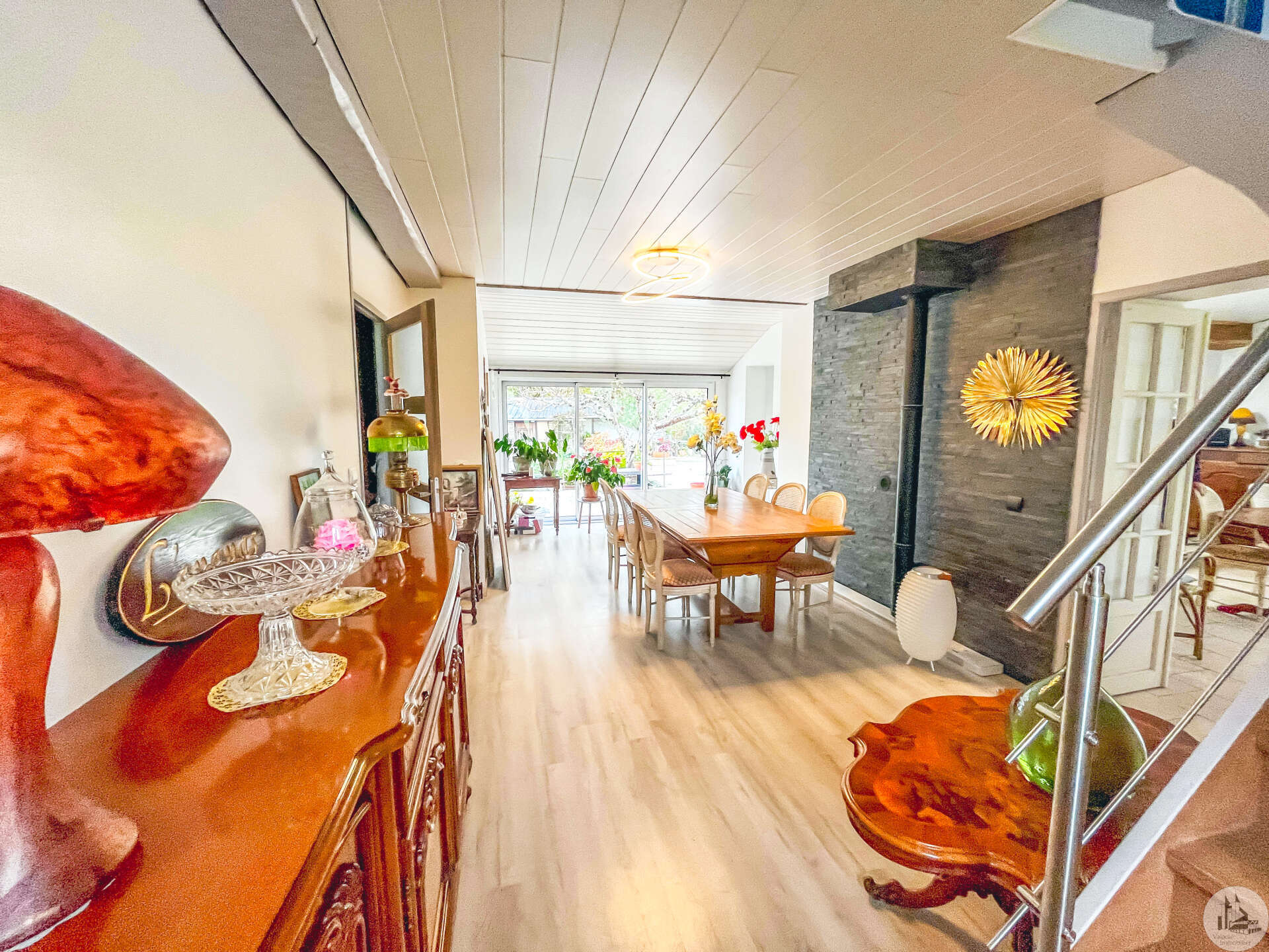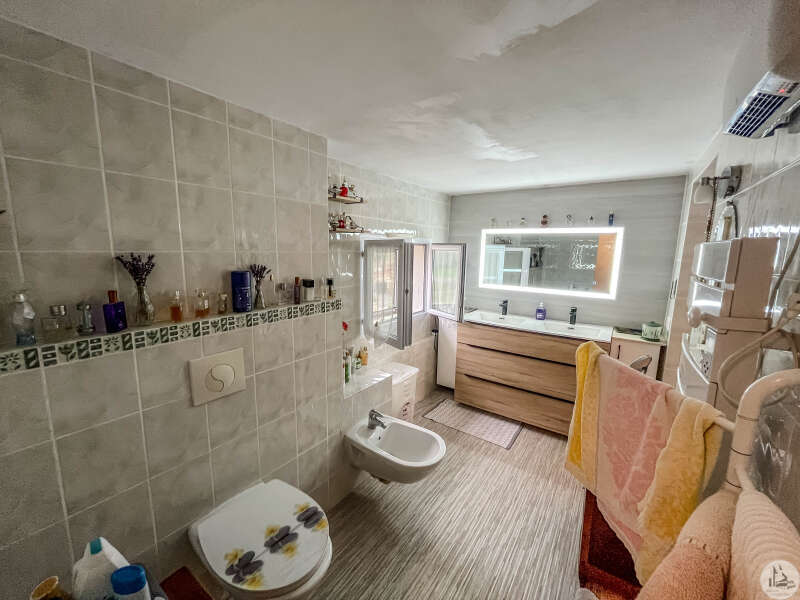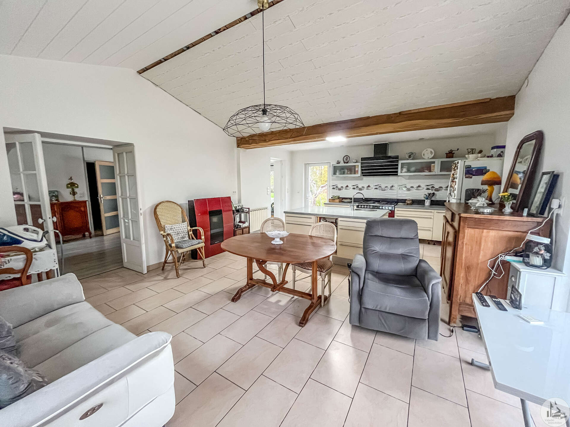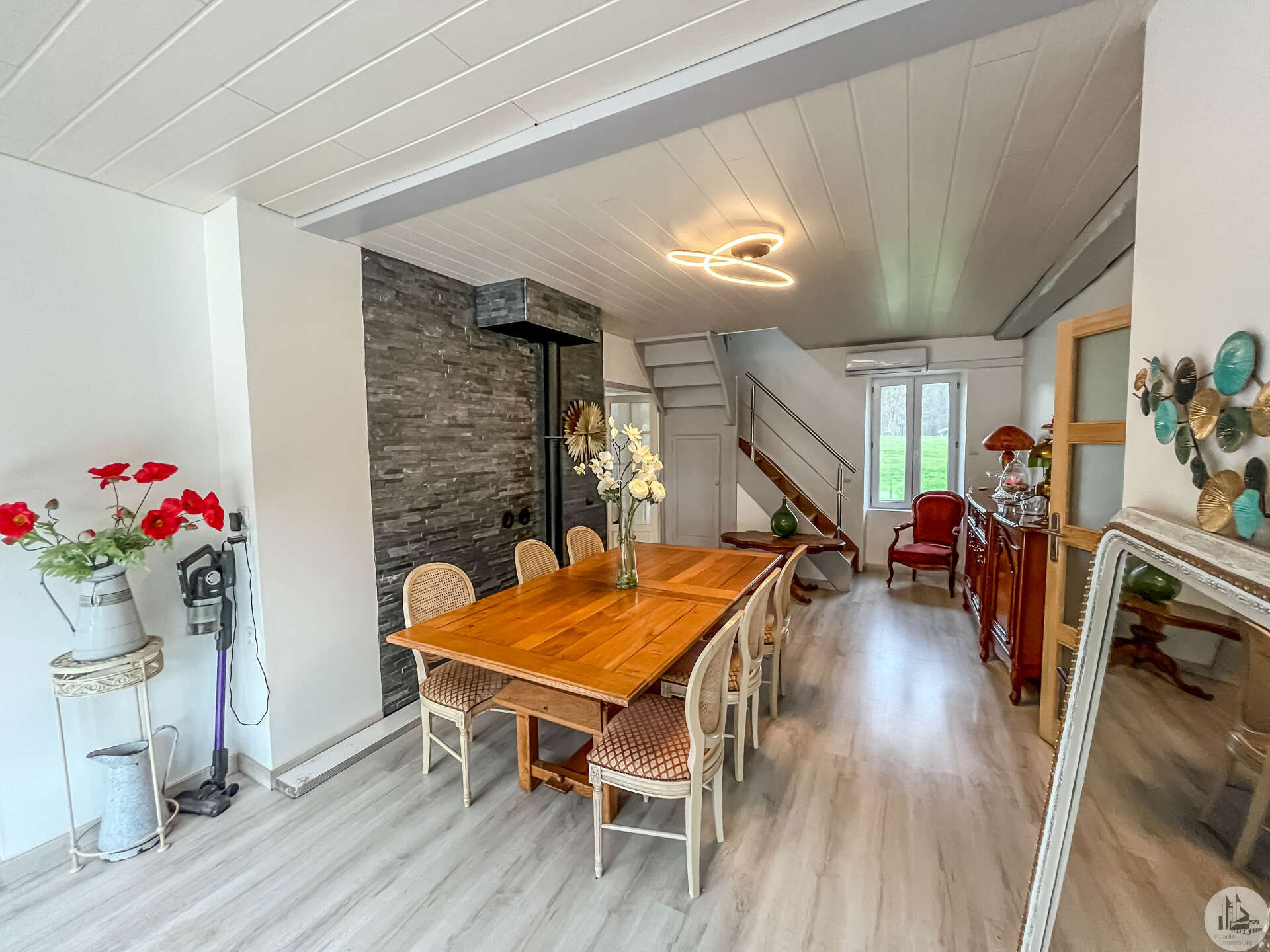Een traditioneel huis in Périgord-stijl, gerenoveerd in de jaren 80 en voorzien van een houten uitbouw in 2020. Het huis bestaat uit: een veranda (15,14 m²), een hal (4,8 m²), een ingerichte keuken (34,7 m²) met kookeiland, fornuis en afzuigkap, een bijkeuken (4,09 m²), een woon-/eetkamer (24,5 m²), een hal, drie slaapkamers (8,8 m², 14,5 m² en 20 m²), waarvan één met een schuin plafond, één met een en-suite badkamer met douche (dubbele wastafel, bidet, wandcloset, inloopdouche), een kleedkamer (11,4 m²) en een apart toilet. Er is een terras aan de voor- en zijkant. Het huis is voorzien van omkeerbare airconditioning (twee units), een pelletkachel (met twee ventilatieopeningen voor warmteverdeling) en een elektrische convectorkachel in de badkamer. PVC-ramen met dubbele beglazing (hout in één kamer) Huis voorzien van bronwater (geen waterleiding) Bijgebouwen: 2 garages (31 m² en 23 m²), 2 schuurtjes (10,5 m² en 8,5 m²) Woning met een verwarmd chloorzwembad (9,5 m²) met massagestralen. Mogelijkheid tot aankoop van 6.235 m² extra grond met een meer.