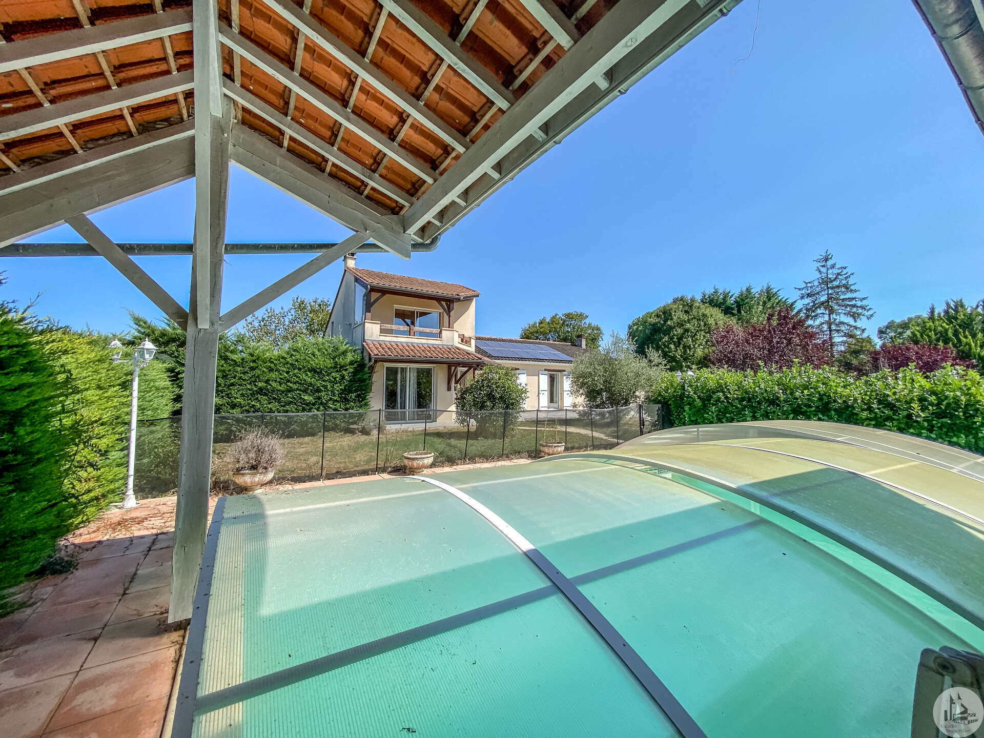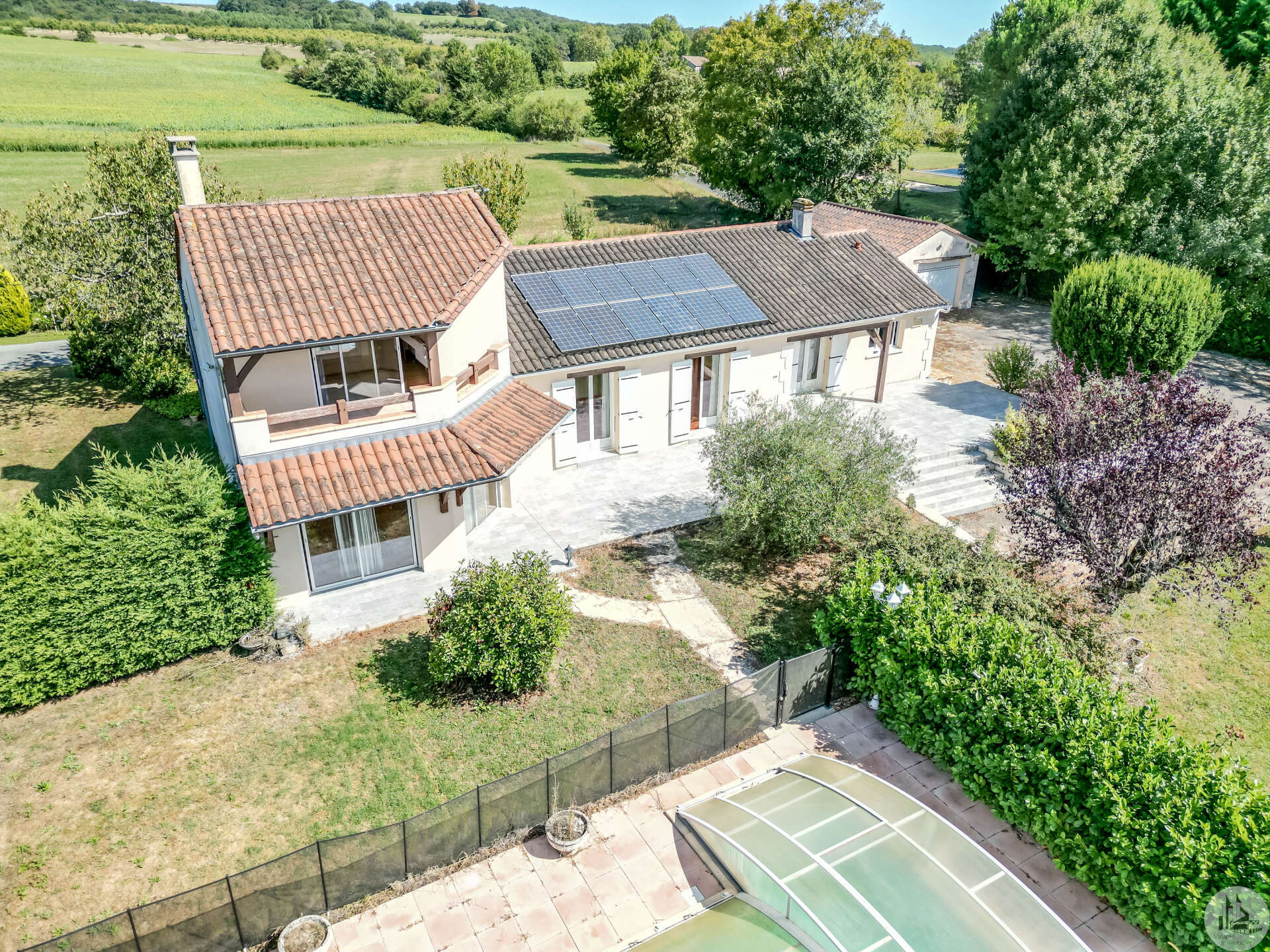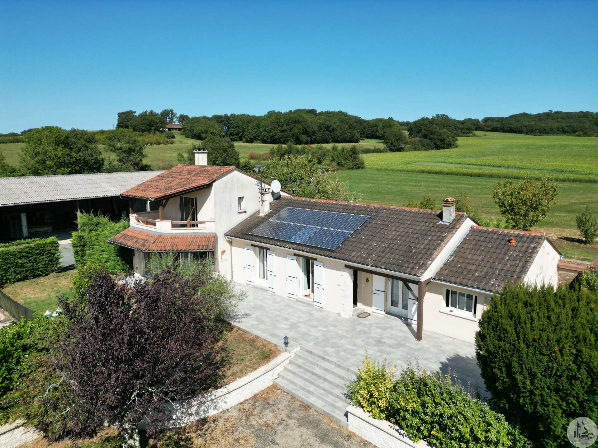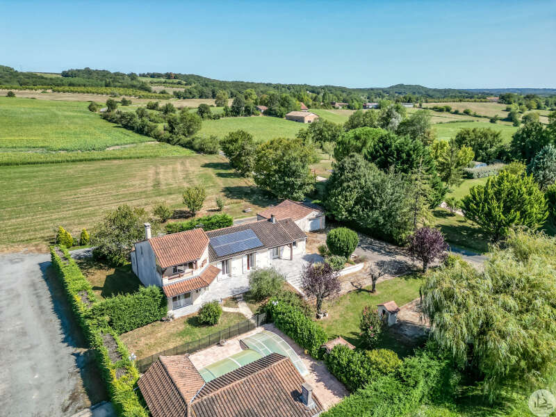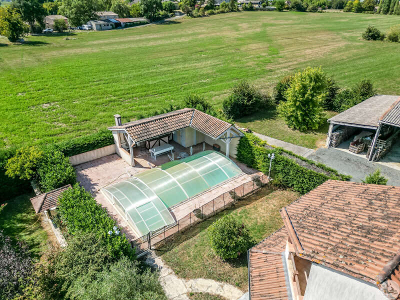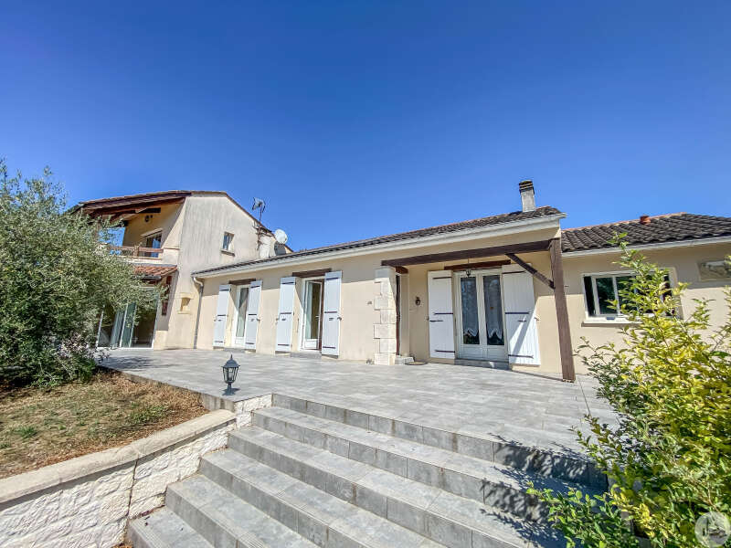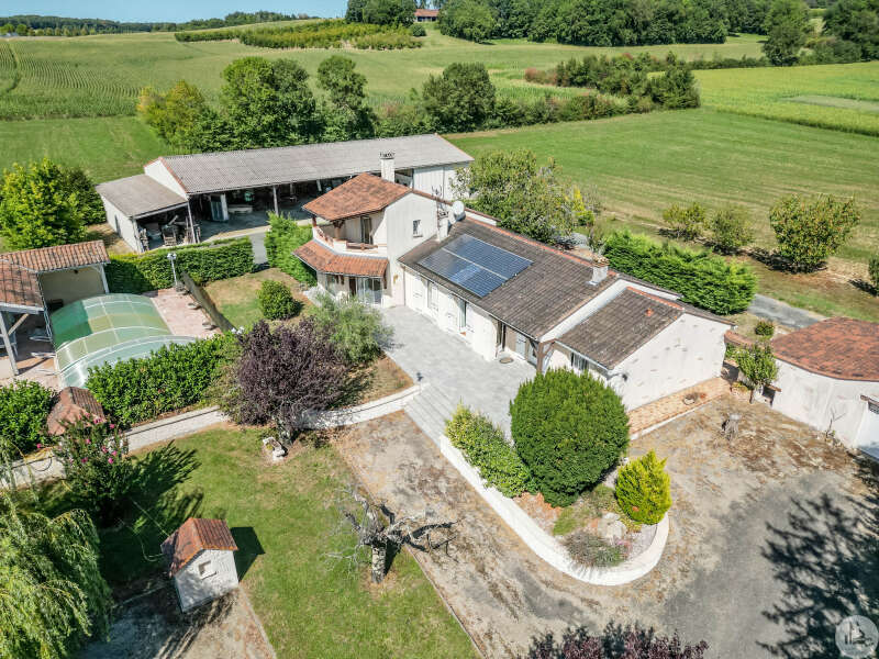In een vrij landelijke omgeving, perfect onderhouden grote en aangename gezinswoning van circa 170 m2 bestaande uit een entree van 3,5 m2, een eetkamer van 26 m2, een lichte woonkamer van 46 m2 met open haard (insert), een ingerichte keuken van 16 m2 (met oven, kookplaat, afzuigkap) met semi-aparte eethoek, en een bijkeuken/wasruimte van 10,20 m2 met uitgang naar de tuin. De woonkamer (totaal circa 72 m2) komt uit op 2 overdekte terrassen. Een gang bedient 3 slaapkamers van 11; 12 m2 en 9,25 m2, een badkamer met inloopdouche van 4,10 m2 en een apart toilet. In de woonkamer: een prachtige houten trap geeft toegang tot de eerste verdieping. Op de 1e (in het verhoogde deel van het huis): een overloop van 4 m2, die leidt naar een lichte hoofdslaapkamer van 14 m2 met overdekt terras van 8 m2, een badkamer van 5,49 m2 en een apart toilet. Comfortartikelen: Een waterraffinaderij. Elektrische verwarming + inzet. Aluminium dubbele beglazing. Fotovoltaïsche panelen (inkomsten: ongeveer € 1.500,- per jaar. Wederverkoop aan EDF) Kwaliteitsdiensten en zorgvuldig onderhoud. Buiten en nabij de woning: een bijgebouw van 23,46 m2 (waarvan de muren geïsoleerd zijn): verschillende mogelijkheden voor ontwikkeling: speelkamer, ruimte voor kinderen of professionals, of zelfs creatie van een slaapkamer gastenverblijf, studio of appartement met behulp van de aangrenzende garage voor voorbeeld. Een garage met elektrische afsluiting van 28,87 m2 en carport. Een overdekt terras van 15 m2. Een beveiligd zwembad van 10 x 5 m met poolhouse: zomerkeuken, een douche, een toilet en wastafel. Gescheiden door een heg en gemakkelijk op te bergen en te klussen: een schuur van 296 m2 grenzend aan een gesloten werkplaats van 77,5 m2 met een tussenverdieping. Land van ruim 9000 m2, beplant met bomen en versierd met een waterput (met pomp) aangesloten op 3 kranen geplaatst in de tuin (irrigatie), een vijver. Mogelijkheid om het pand te verwerven zonder de schuur of met minder grond.