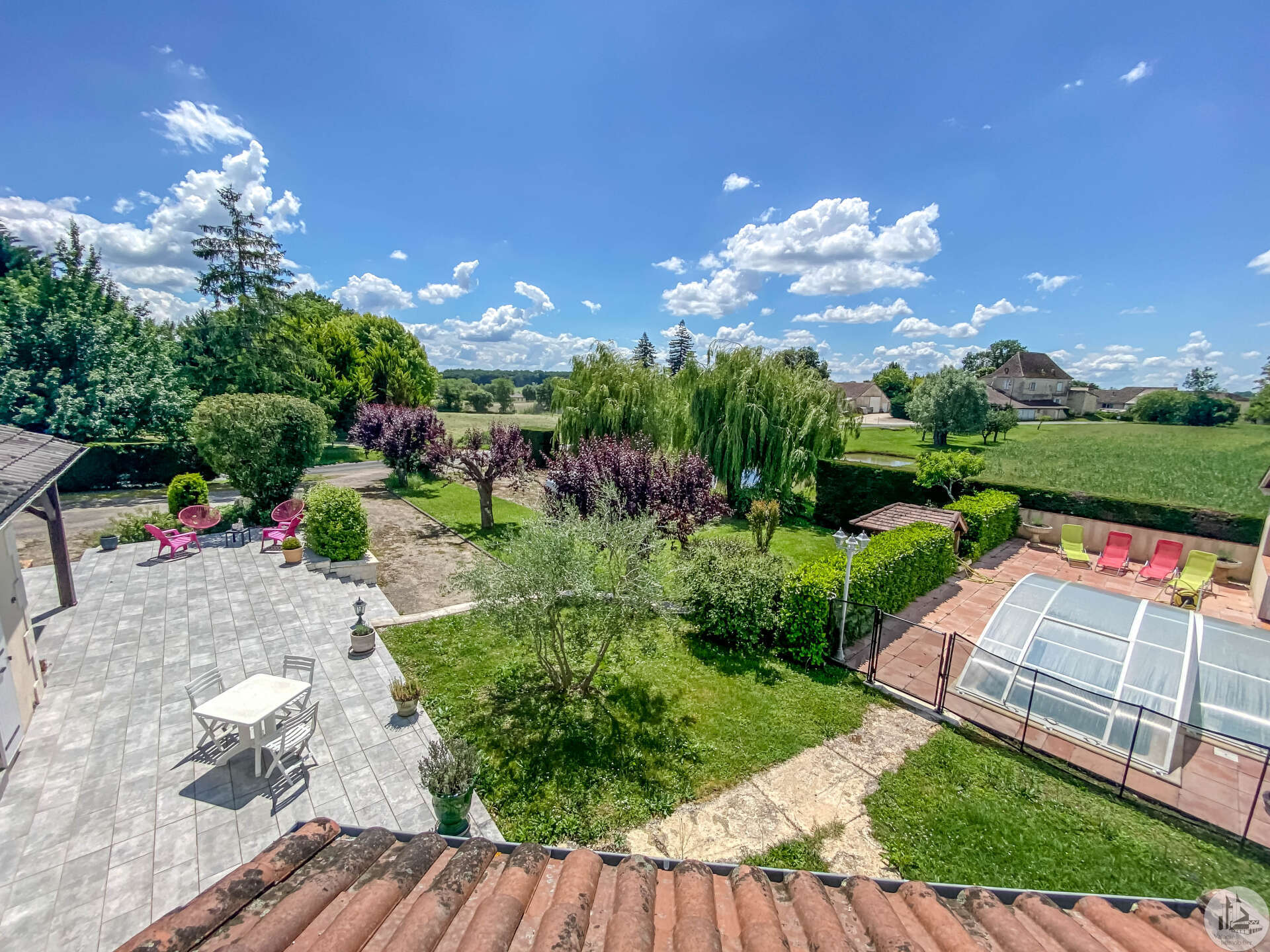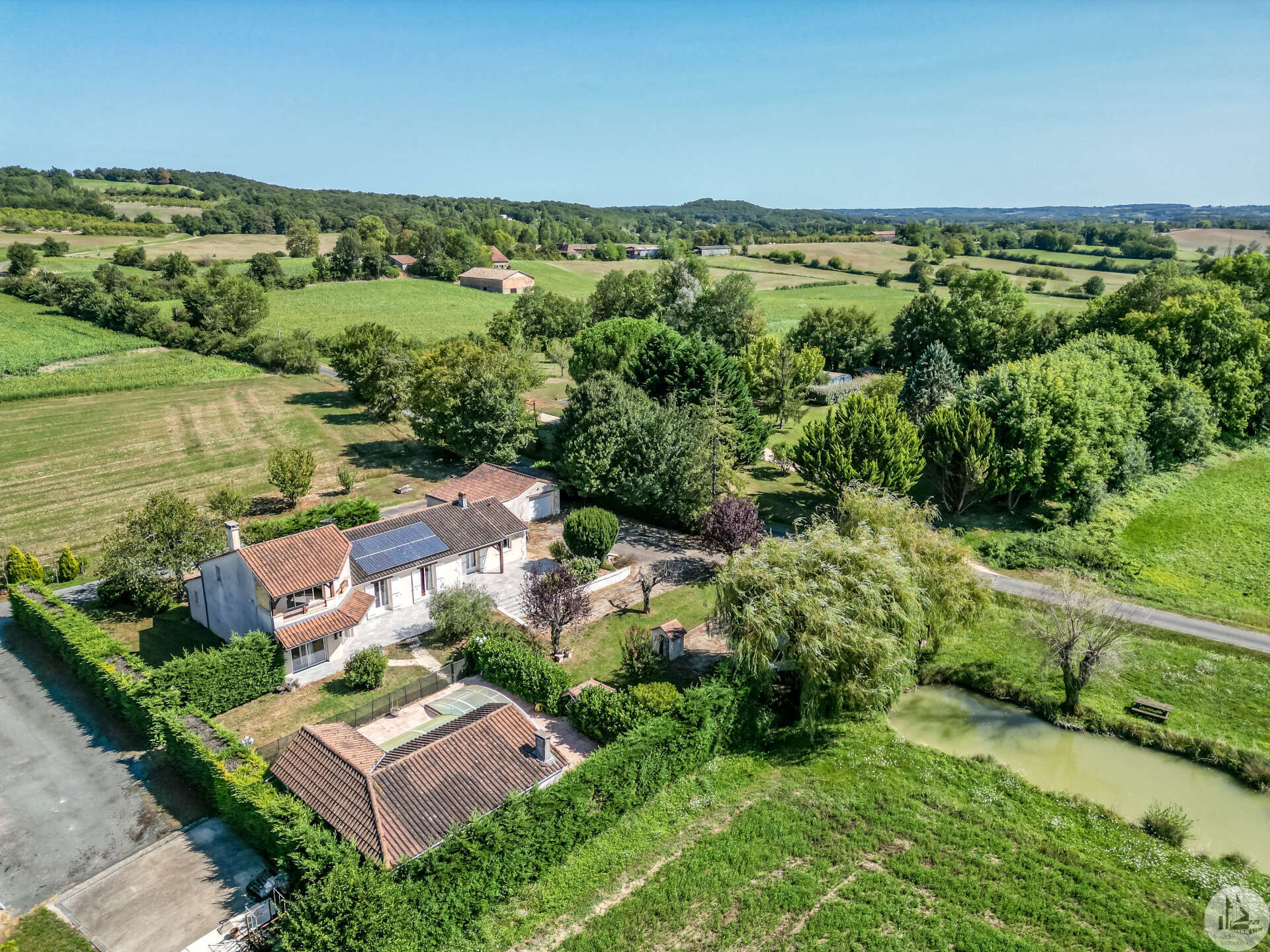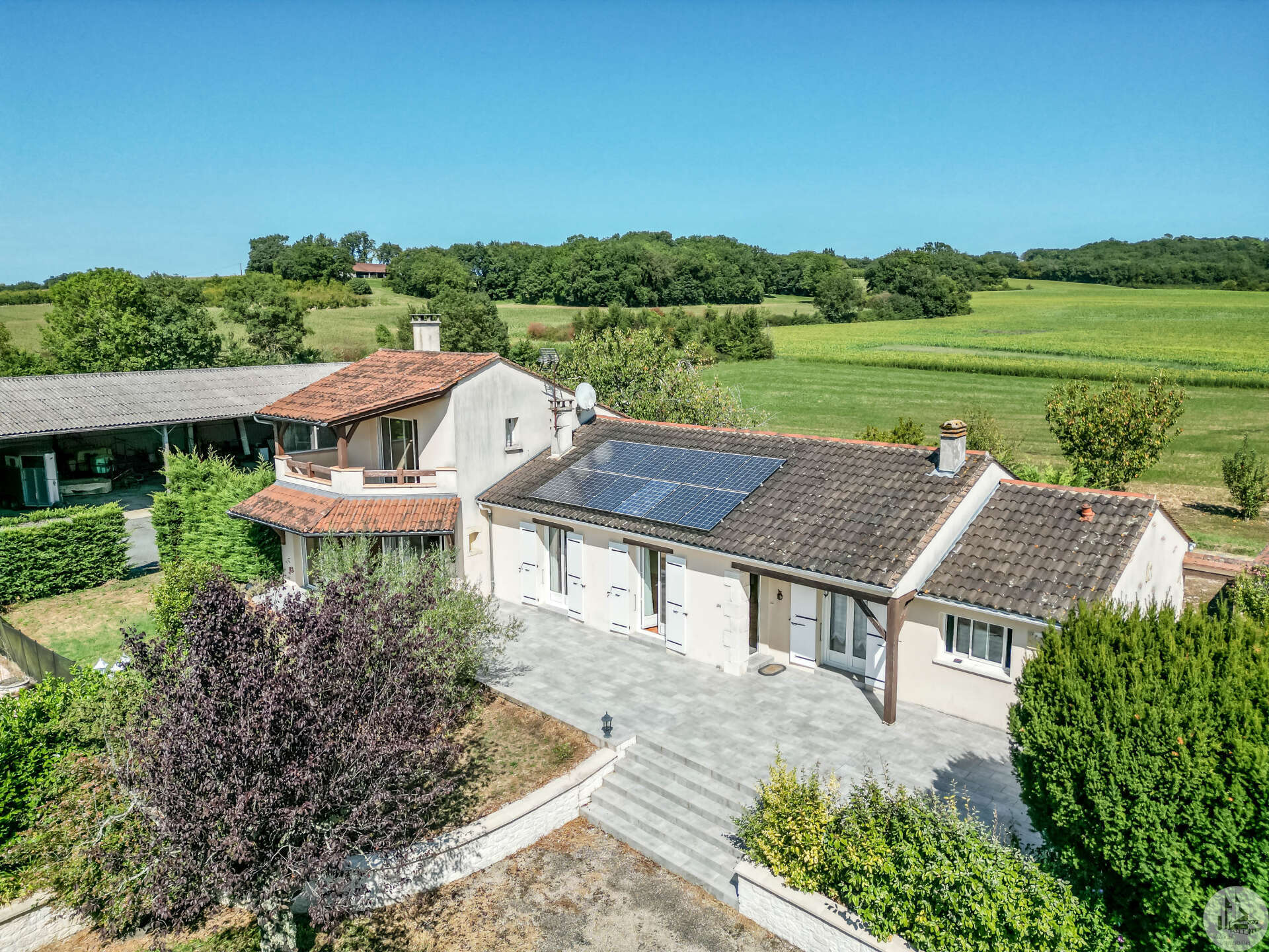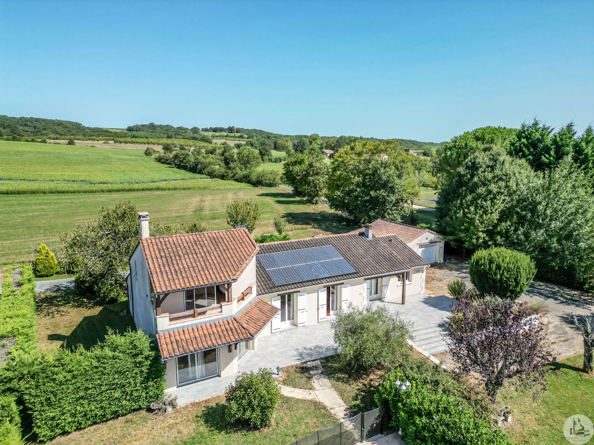 In een vrij landelijke omgeving, perfect onderhouden grote en aangename gezinswoning van circa 170 m2 bestaande uit een entree van 3,5 m2, een eetkamer van 26 m2, een lichte woonkamer van 46 m2 met open haard (insert), een ingerichte keuken van 16 m2 (met oven, kookplaat, afzuigkap) met semi-aparte eethoek, en een bijkeuken/wasruimte van 10,20 m2 met uitgang naar de tuin. De woonkamer (totaal circa 72 m2) komt uit op 2 overdekte terrassen. Een gang bedient 3 slaapkamers van 11; 12 m2 en 9,25 m2, een badkamer met inloopdouche van 4,10 m2 en een apart toilet. In de woonkamer: een prachtige houten trap geeft toegang tot de eerste verdieping. Op de 1e (in het verhoogde deel van het huis): een overloop van 4 m2, die leidt naar een lichte hoofdslaapkamer van 14 m2 met overdekt terras van 8 m2, een badkamer van 5,49 m2 en een apart toilet. Comfortartikelen: Een waterraffinaderij. Elektrische verwarming + inzet. Aluminium dubbele beglazing. Fotovoltaïsche panelen (inkomsten: ongeveer € 1.500,- per jaar. Wederverkoop aan EDF) Kwaliteitsdiensten en zorgvuldig onderhoud. Buiten en nabij de woning: een bijgebouw van 23,46 m2 (waarvan de muren geïsoleerd zijn): verschillende mogelijkheden voor ontwikkeling: speelkamer, ruimte voor kinderen of professionals, of zelfs creatie van een slaapkamer gastenverblijf, studio of appartement met behulp van de aangrenzende garage voor voorbeeld. Een garage met elektrische afsluiting van 28,87 m2 en carport. Een overdekt terras van 15 m2. Een beveiligd zwembad van 10 x 5 m met poolhouse: zomerkeuken, een douche, een toilet en wastafel. Gescheiden door een heg en gemakkelijk op te bergen en te klussen: een schuur van 296 m2 grenzend aan een gesloten werkplaats van 77,5 m2 met een tussenverdieping. Land van ruim 9000 m2, beplant met bomen en versierd met een waterput (met pomp) aangesloten op 3 kranen geplaatst in de tuin (irrigatie), een vijver. Mogelijkheid om het pand te verwerven zonder de schuur of met minder grond.