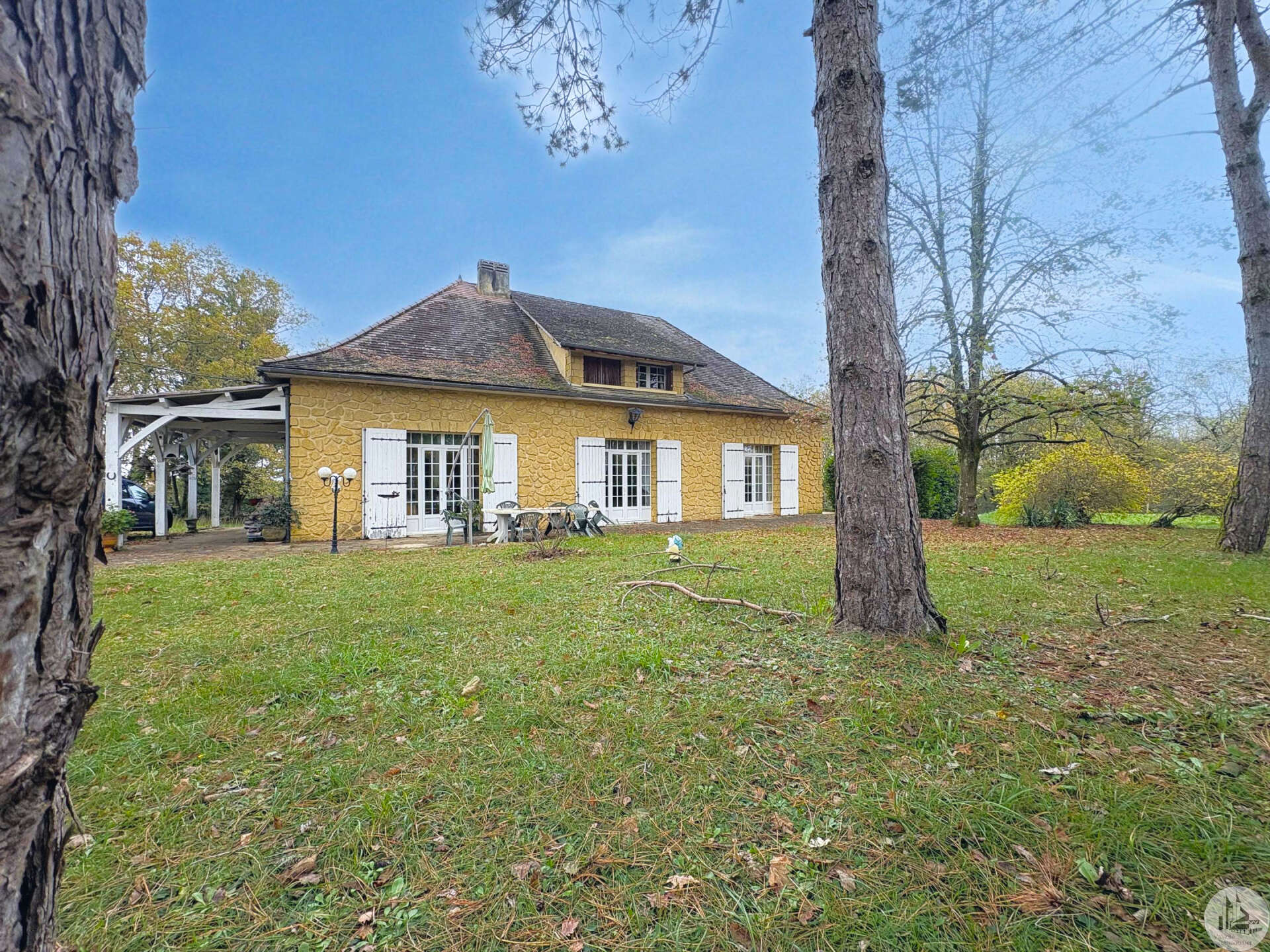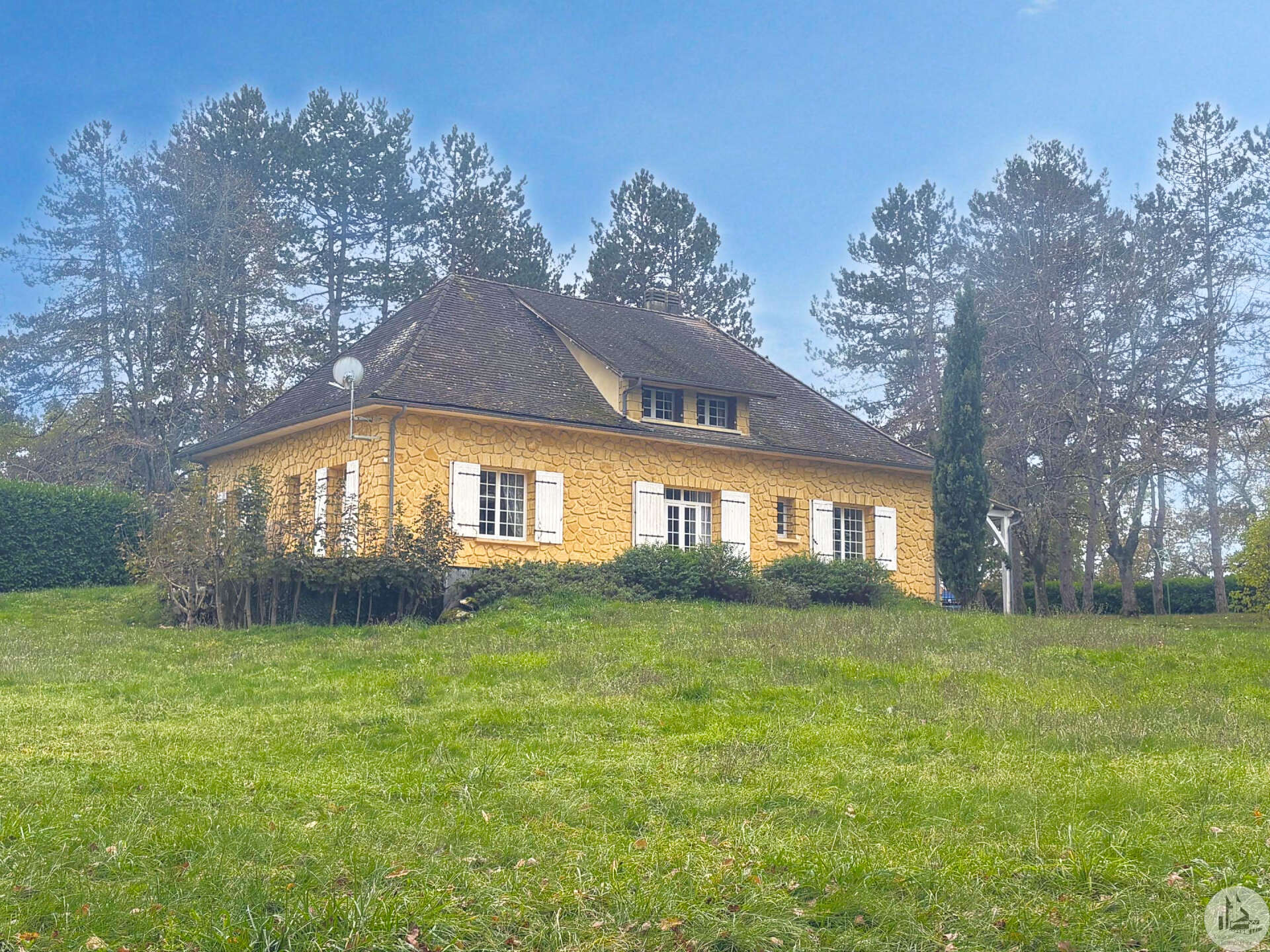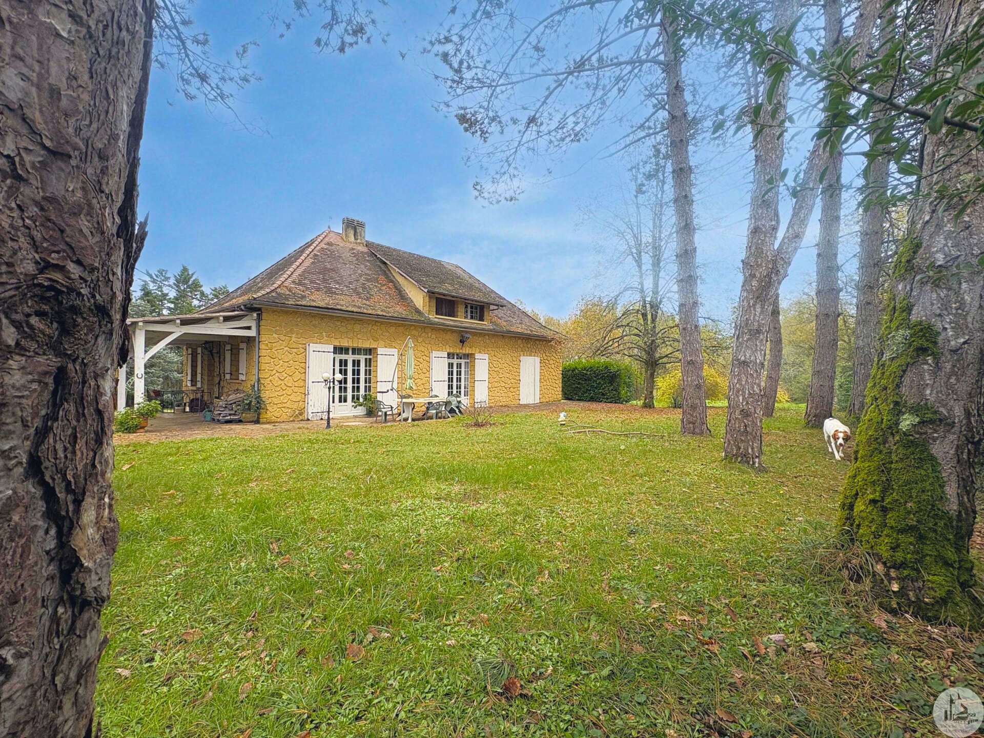 Stenen huis uit 1972, circa 185 m², met bijgebouwen op een perceel van 9.653 m². Het huis bestaat uit: Op de begane grond bevindt zich een halfopen ingerichte keuken die leidt naar de woon-/eetkamer met houtkachel, twee slaapkamers, een doucheruimte, een bijkeuken/voorraadkast en een apart toilet met wastafel. Boven bevinden zich een overloop, twee slaapkamers, een doucheruimte met toilet en twee zolders. Een volledige kelder met een stookruimte, een werkplaats en twee kelders. Buiten leiden diverse terrassen met een aanbouw naar het perceel van 9.653 m² (waarvan 5.000 m² omheind) waar zich een bijgebouw van circa 65 m² met een dubbele garage en een paardenstal bevindt. De ramen zijn voorzien van dubbel glas op de begane grond en enkel glas op de bovenverdieping. De verwarming is op olie.